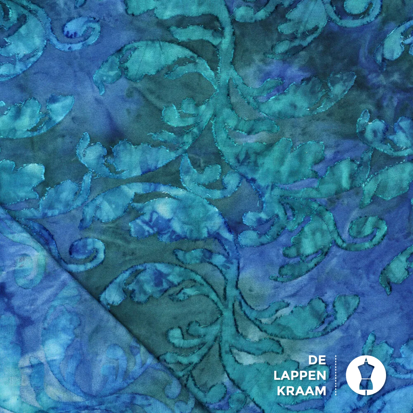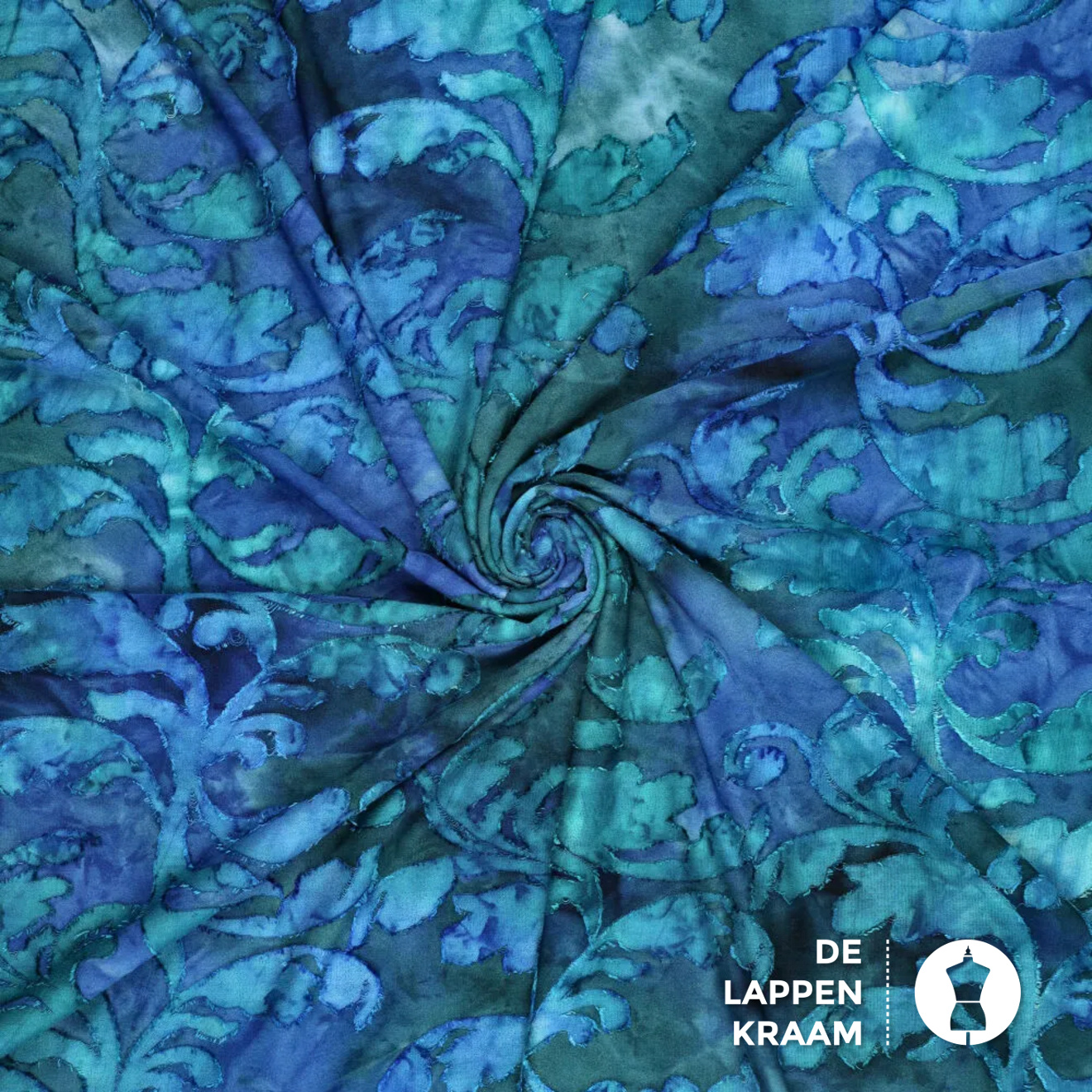 Gebreide ausbrenner stof in een gevlamd tie dye dessin met een soort bladeren die "op de stof liggen". De stof heeft kleuren als blauw en groen... Lees meer