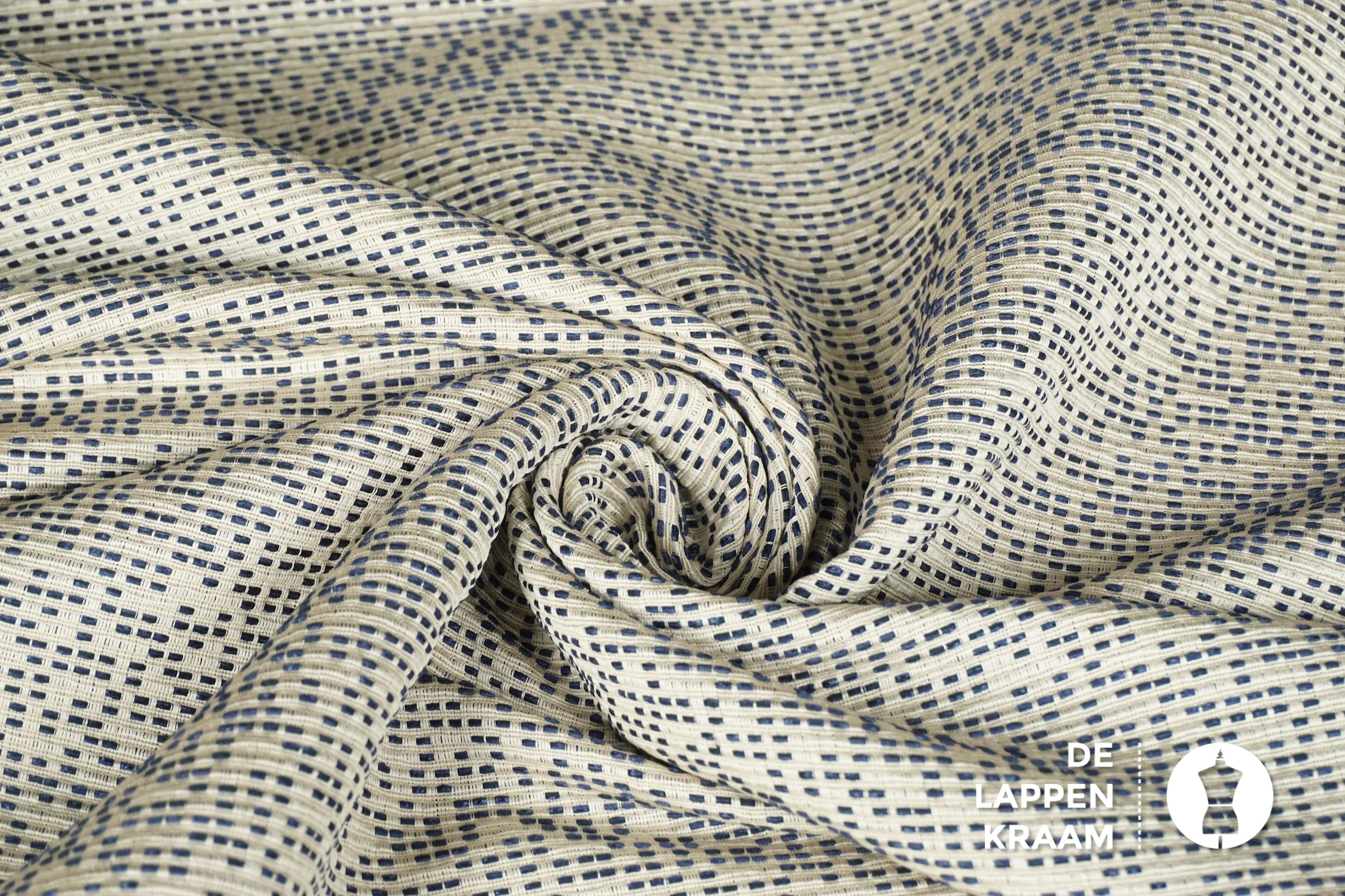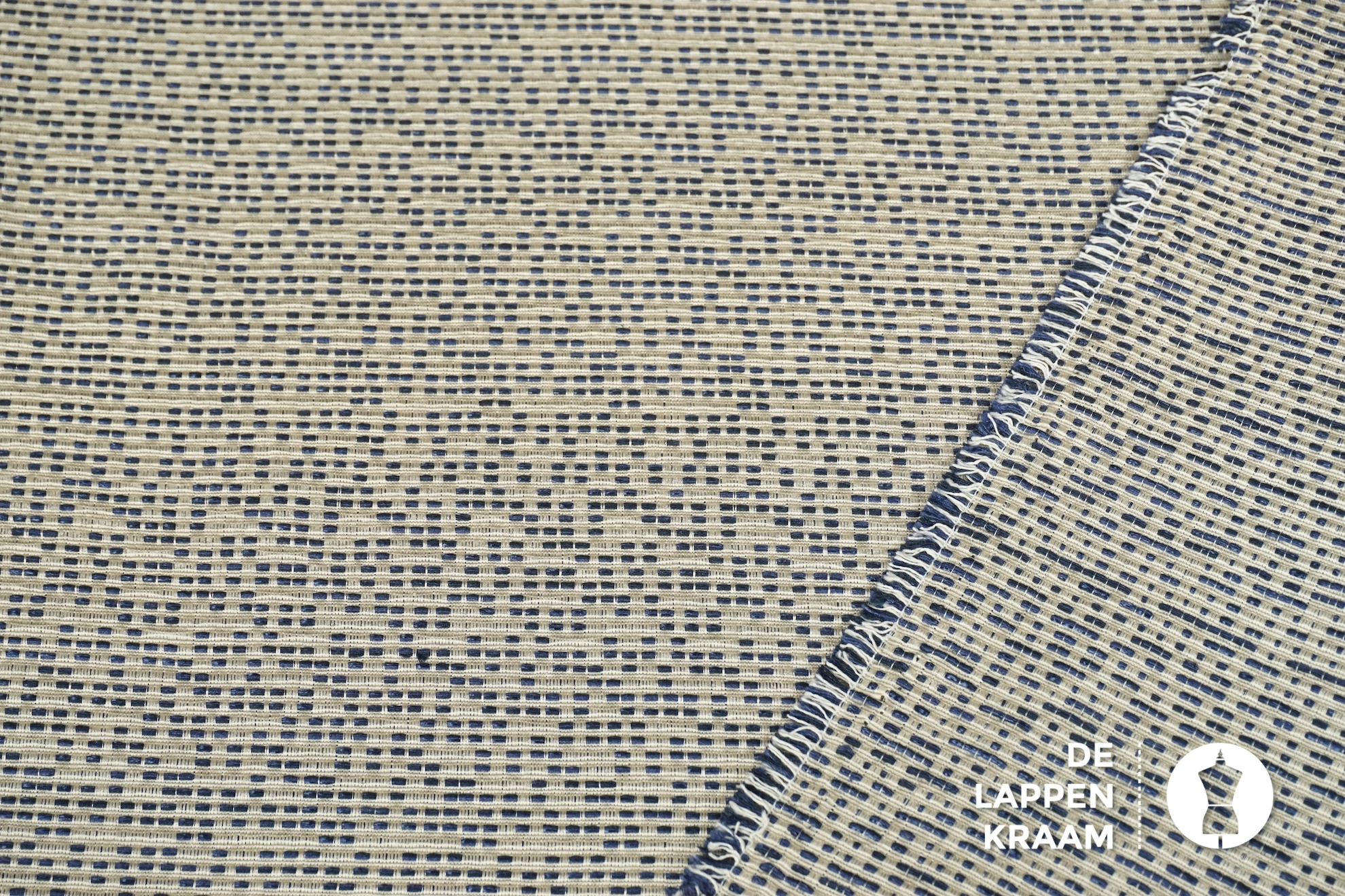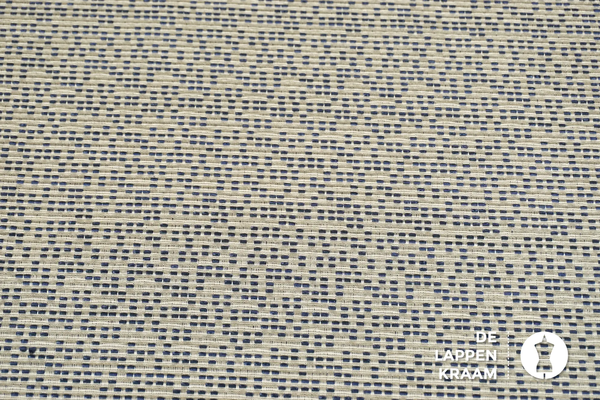 Geweven boucle in ecru met een patroon van kleine streepjes in donkerblauw. Lees meer