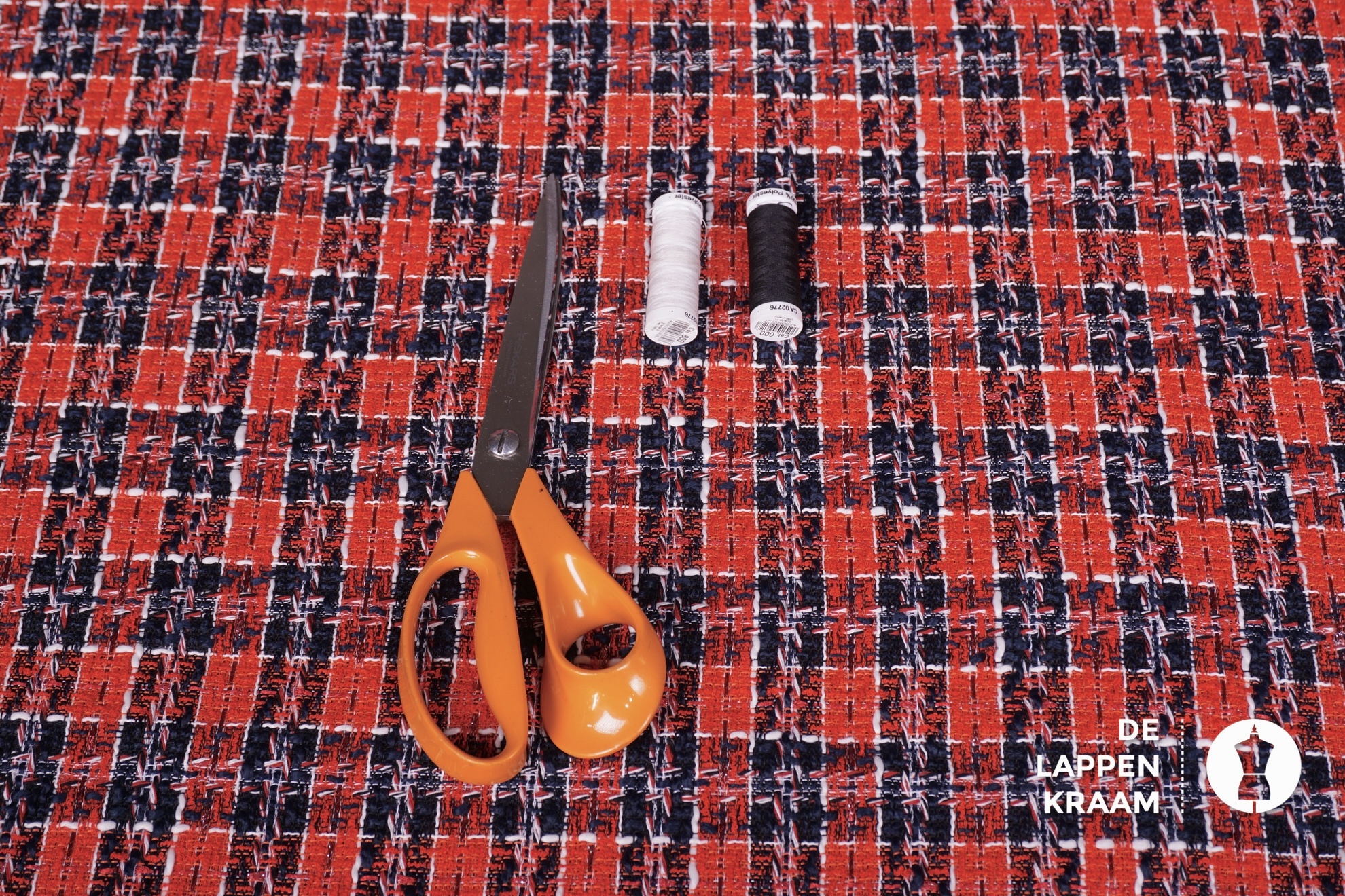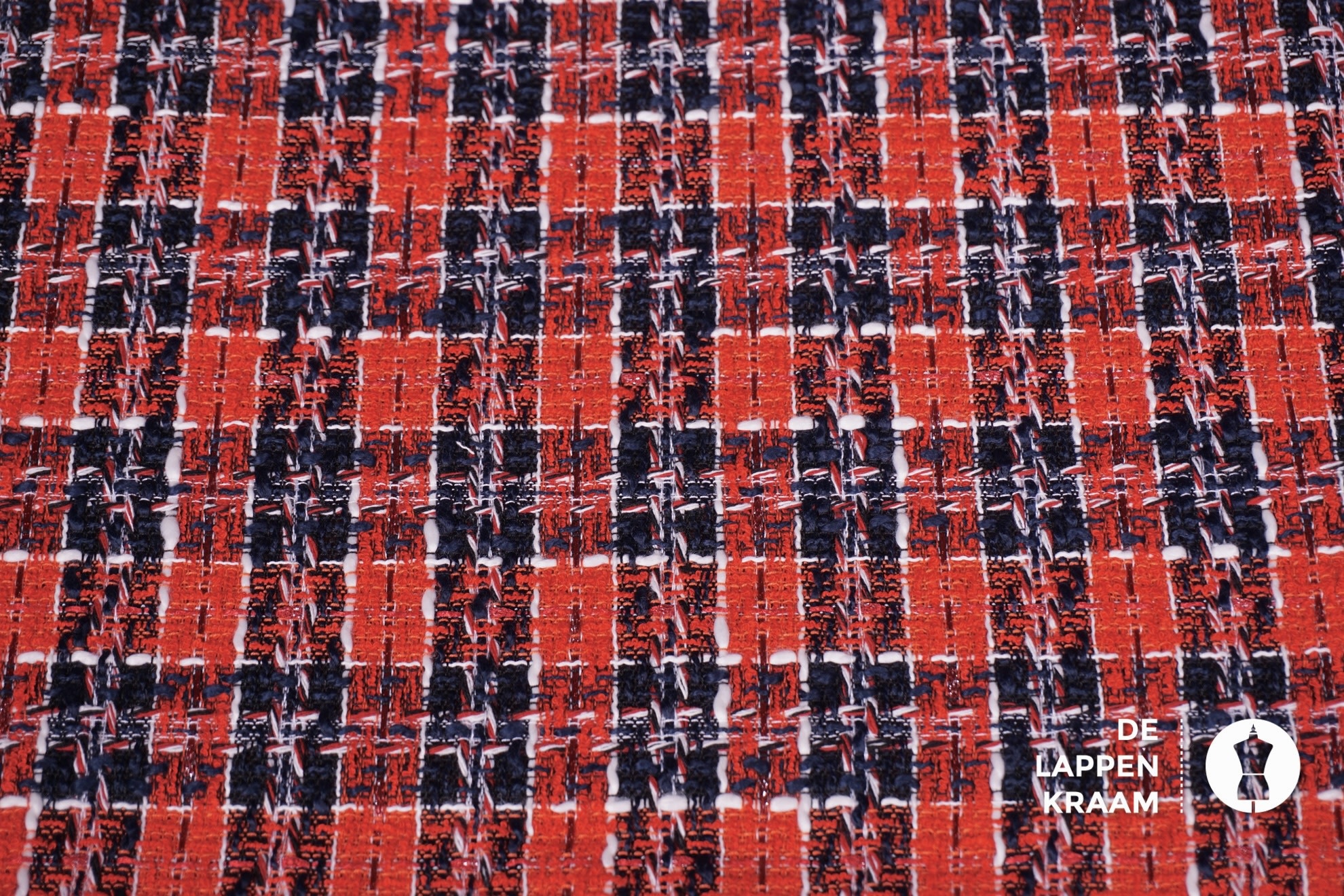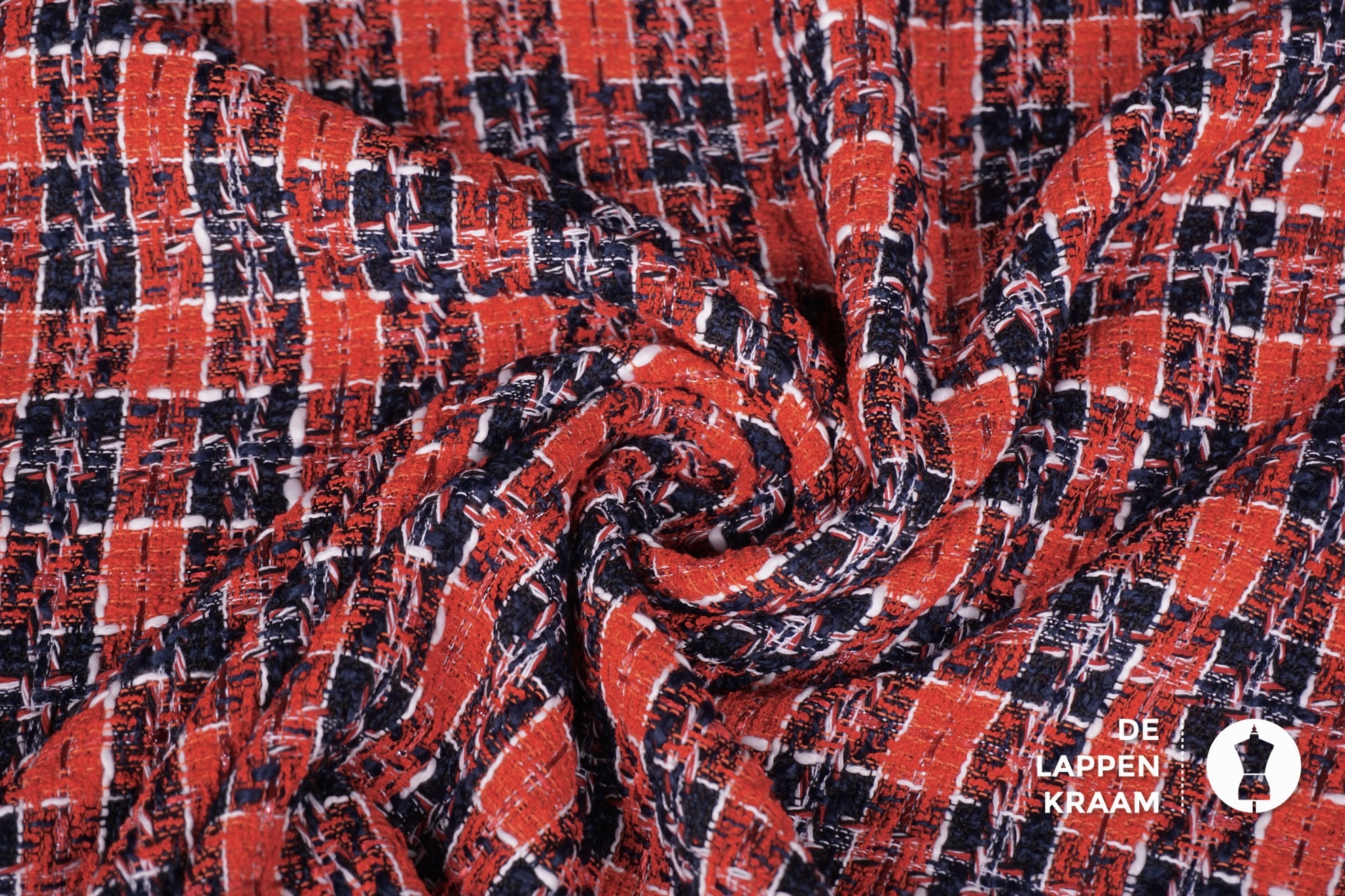 Een prachtige boucle stof, geweven in een ruitvorm in donkerblauw met rood. Super tof voor bijvoorbeeld een Chanel jasje.... Lees meer