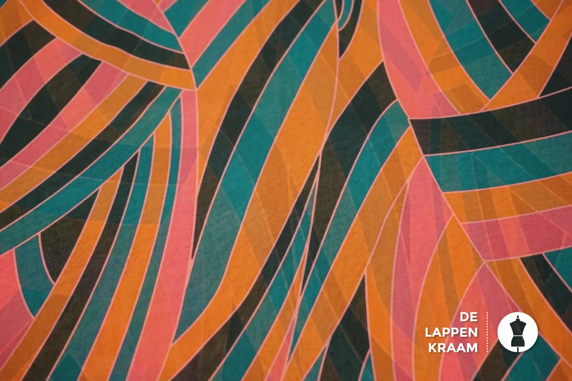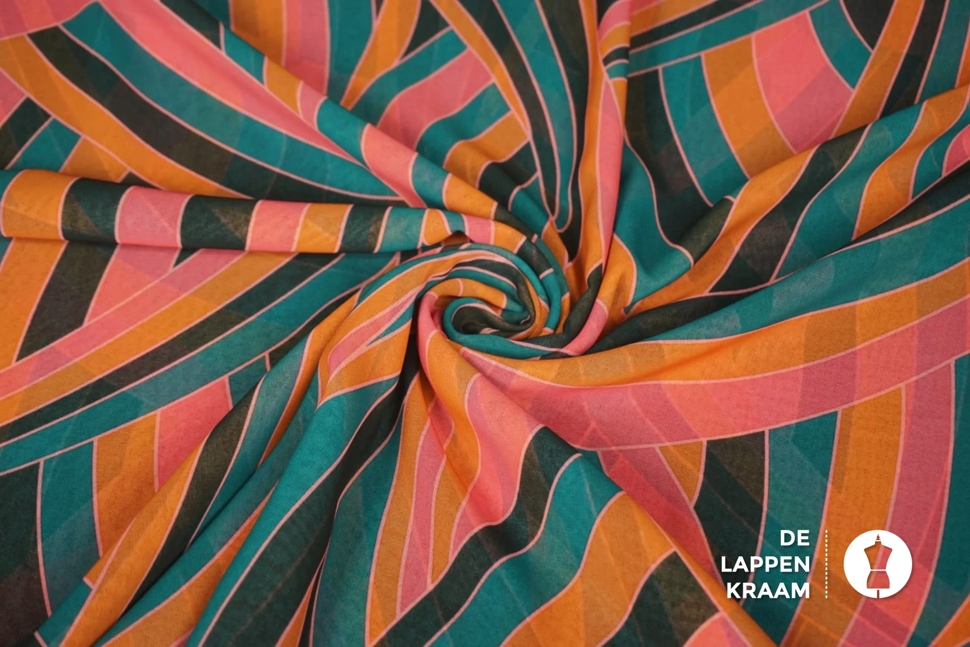 Een dunne chiffon, in een dessin van allerlei strepen in brique, roze, zwart en petrol. Lees meer
