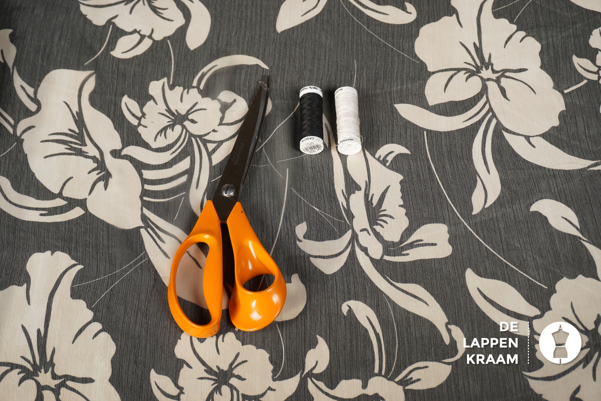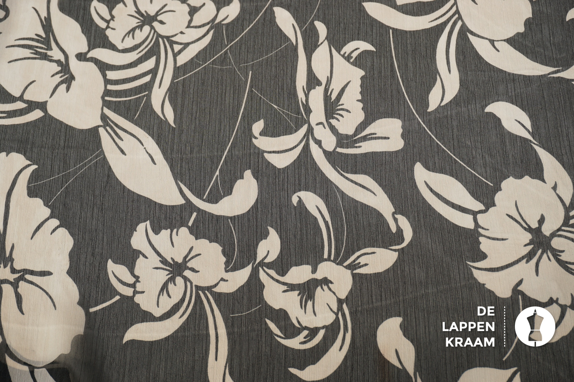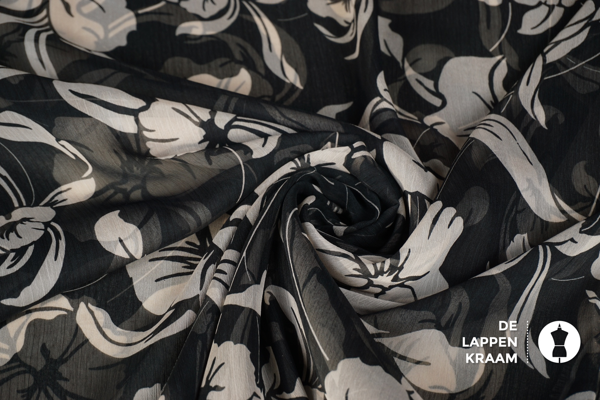 Heerlijke zwarte chiffon met een print van grote bloemen in het wit. De stof is erg transparant, Lees meer