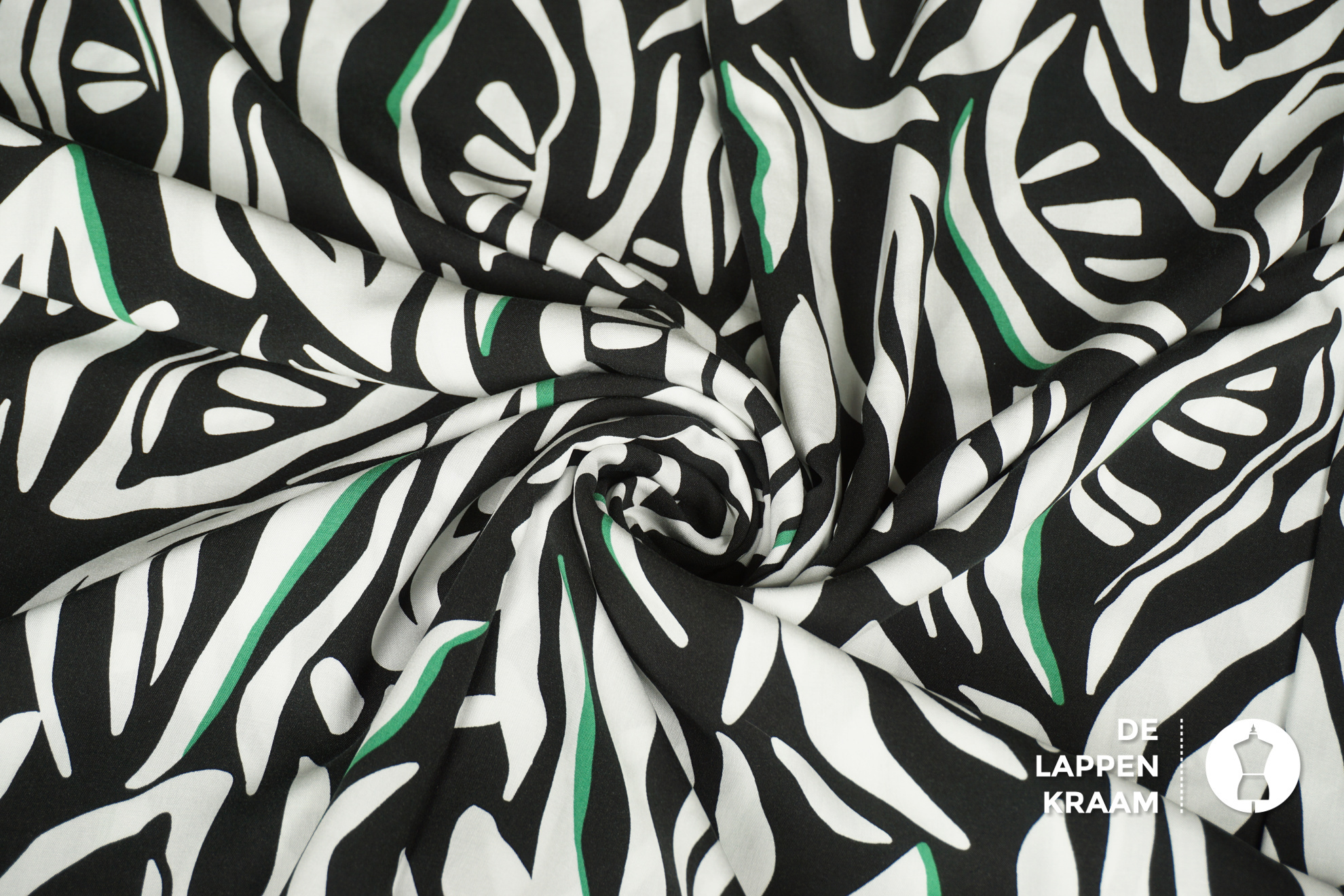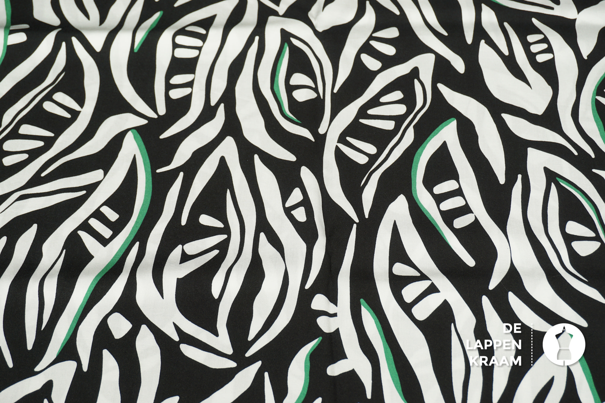 Coupon 179 Viscose zwart met witte abstracte bladeren in wit met groen detail 170 x 140 cm