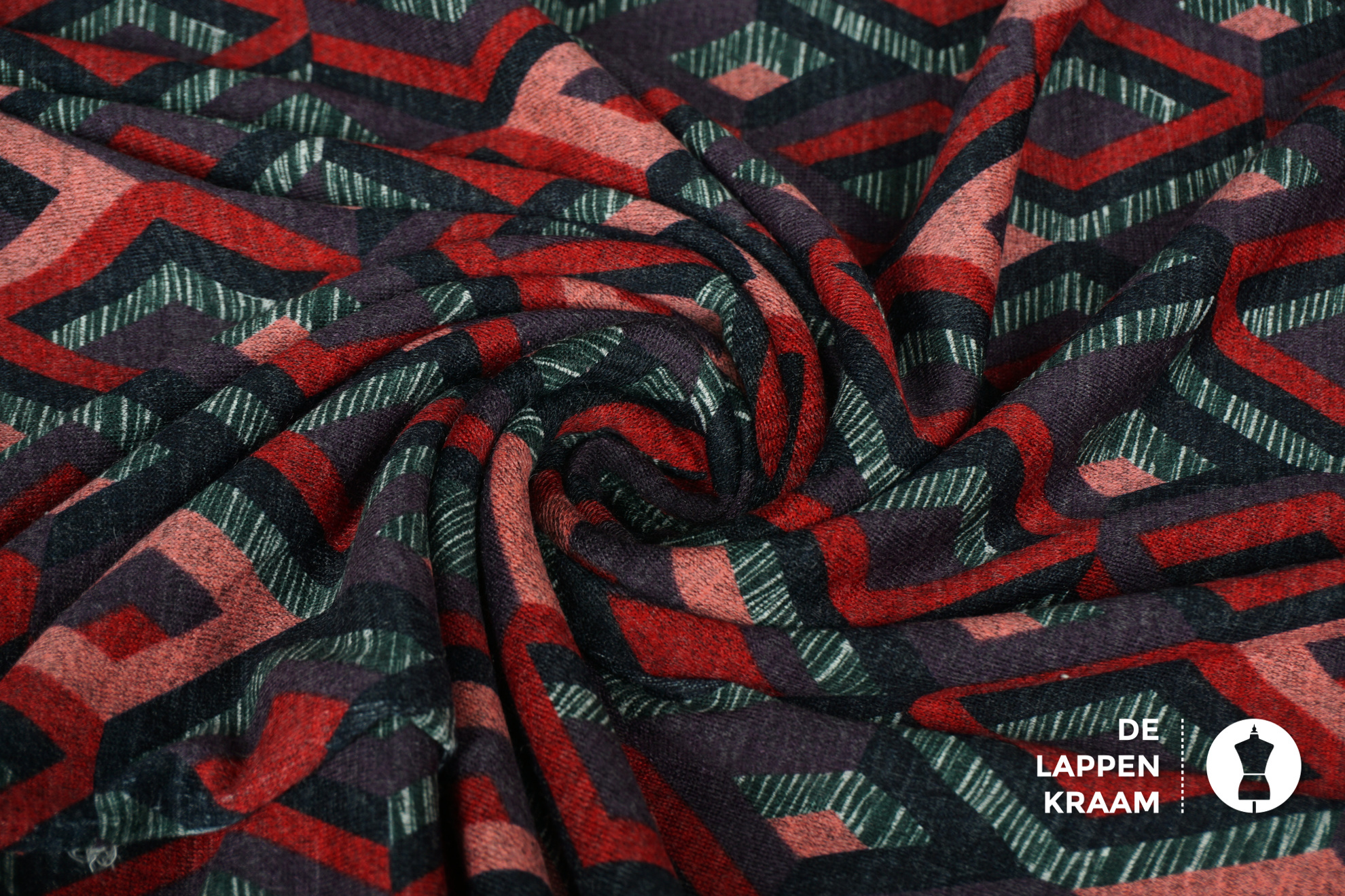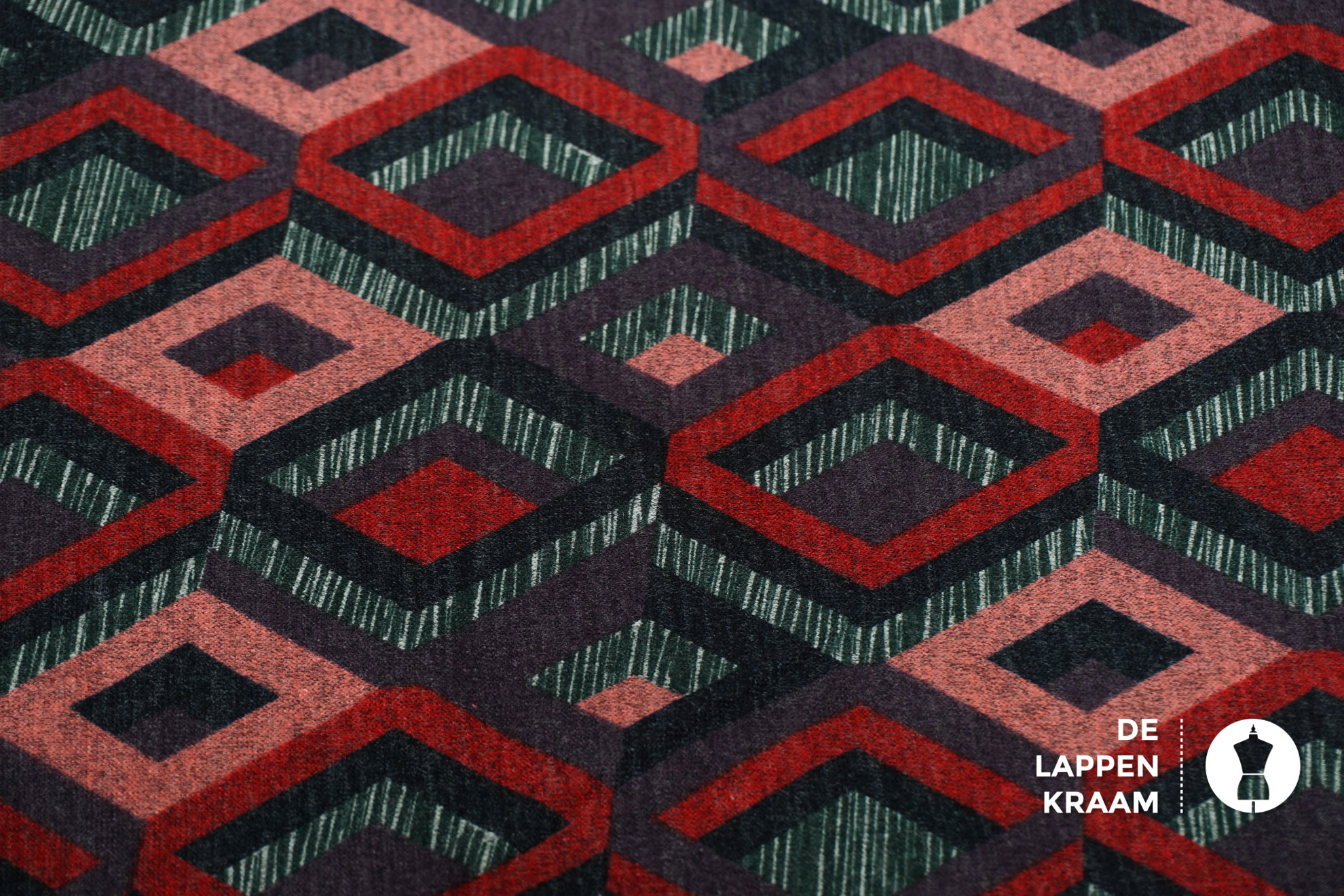 Coupon 353 Angora tricot met ruitjes in paars, roze en rood 170 x 160 cm