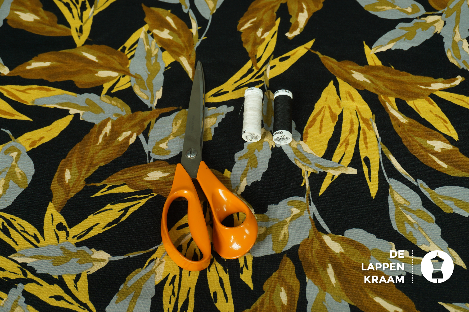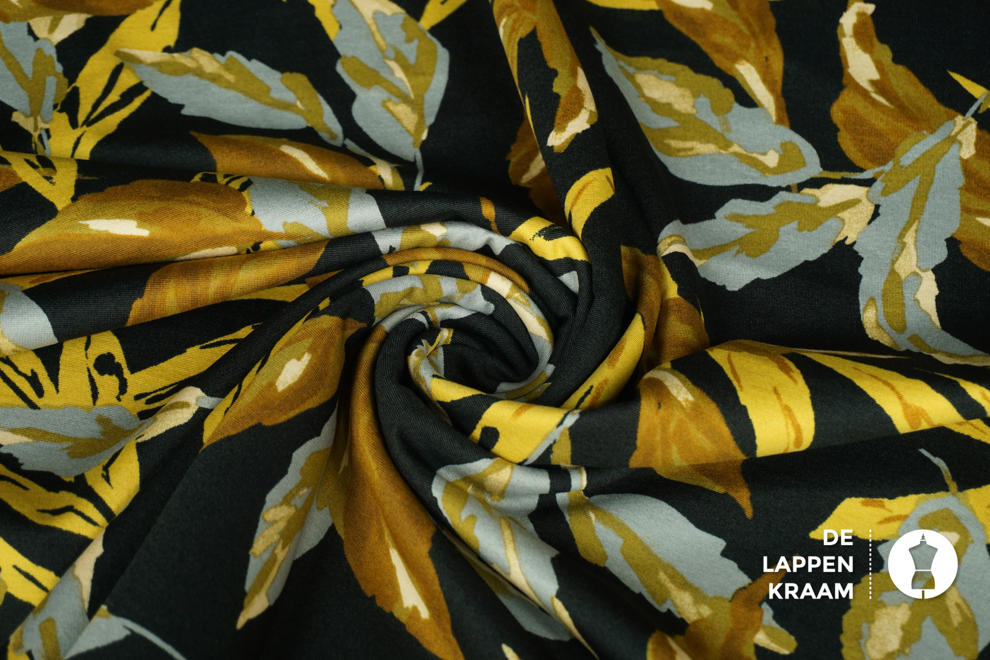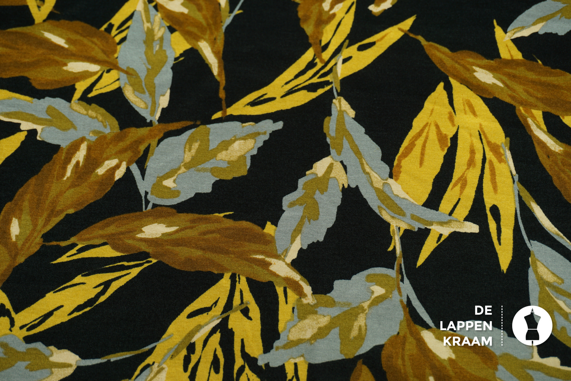 Veiling 2 september Coupon 583 Punta zwart met bladeren in geel met grijs 170 x 150 cm