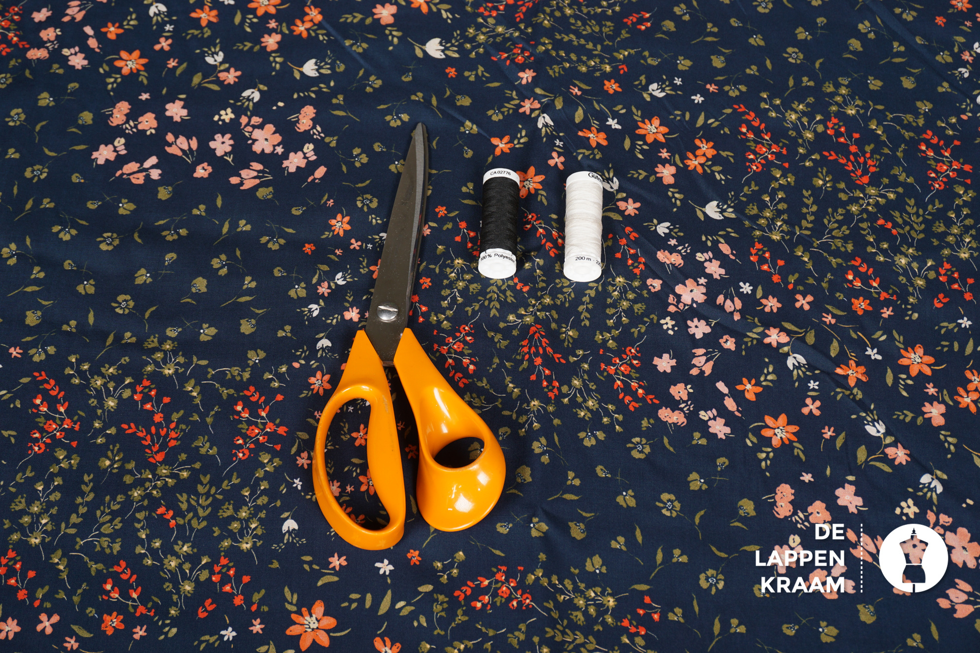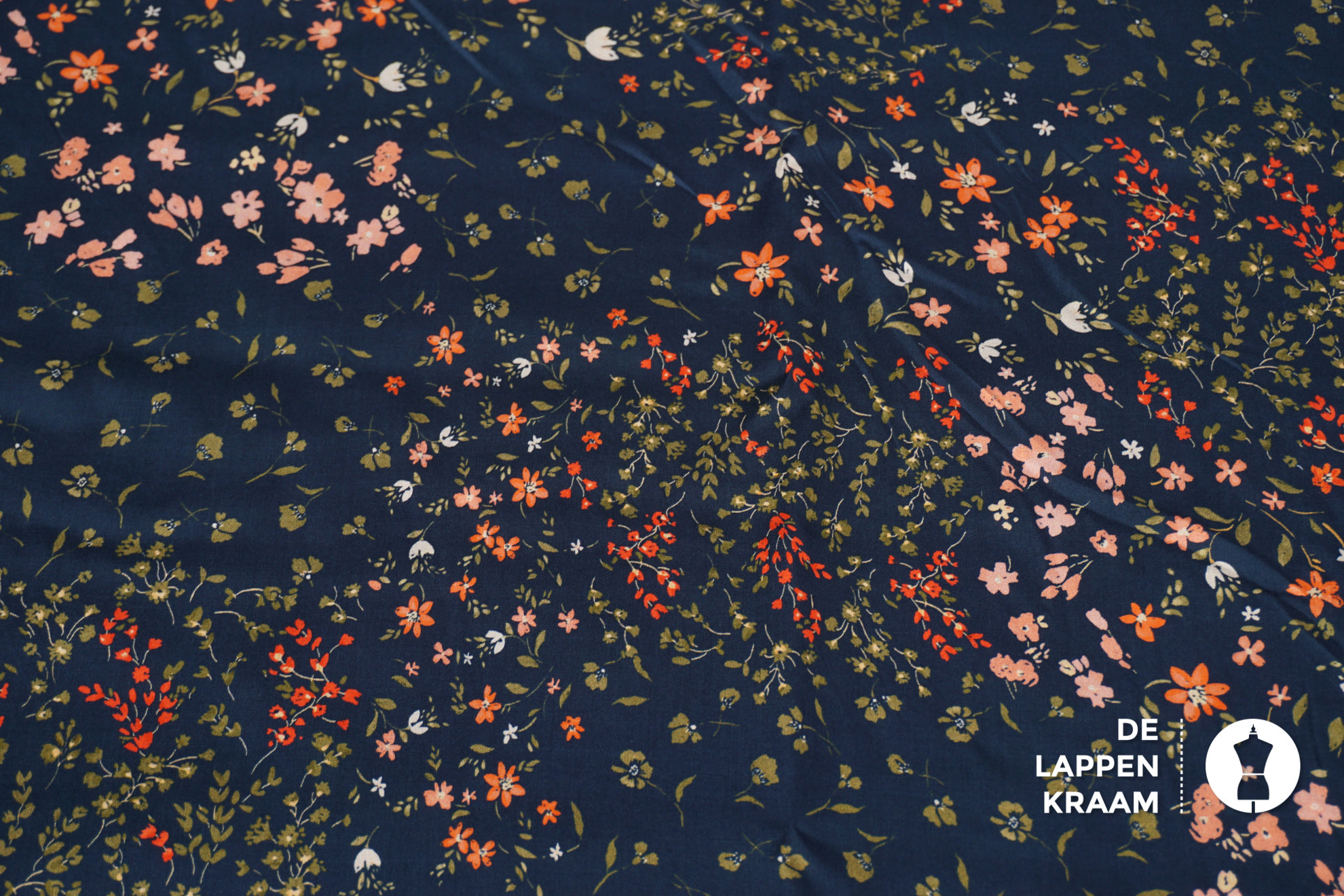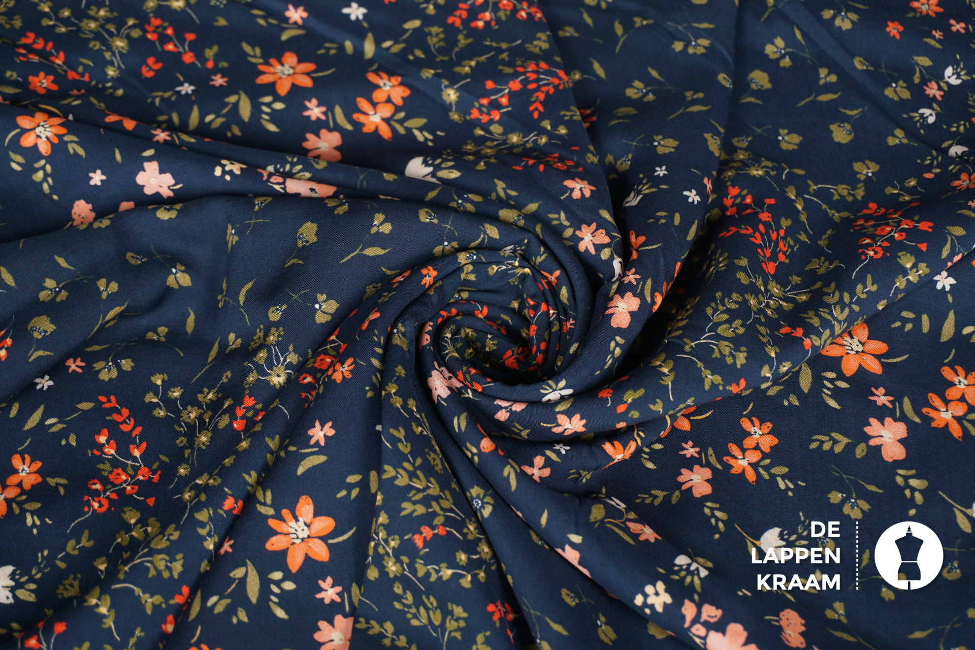 Veiling 2 september Coupon 62 Viscose donkerblauw met groene en oranje bloemetjes 170 x 140 cm