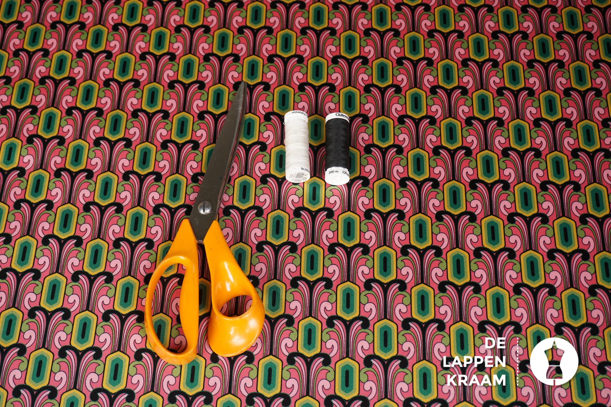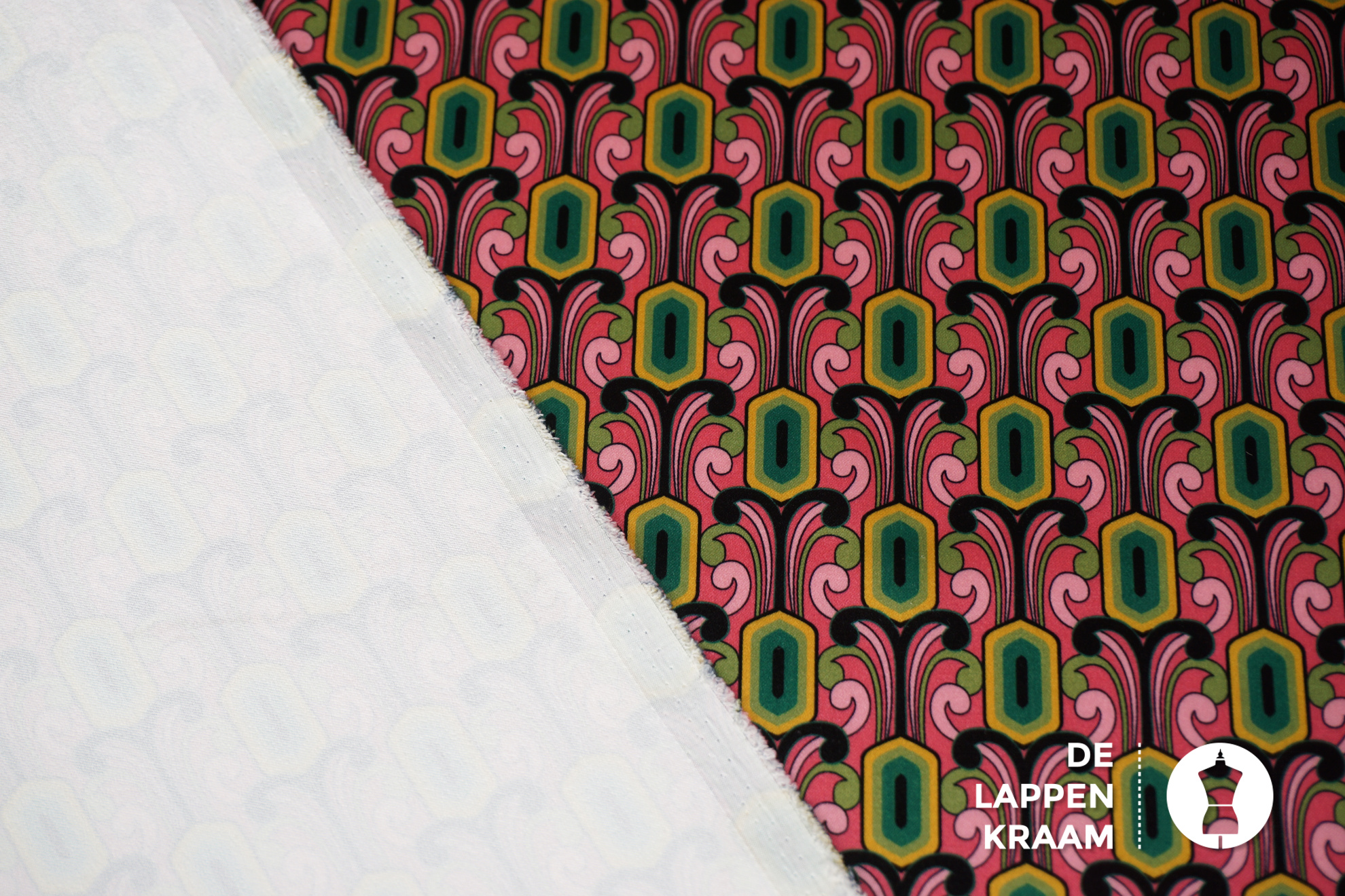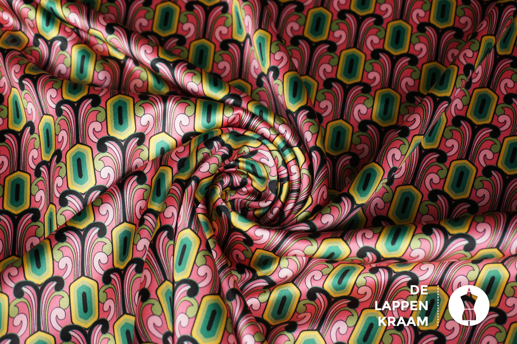 Coupon 695 Stretch satijn roze met groene retroprint 180 x 150 cm
