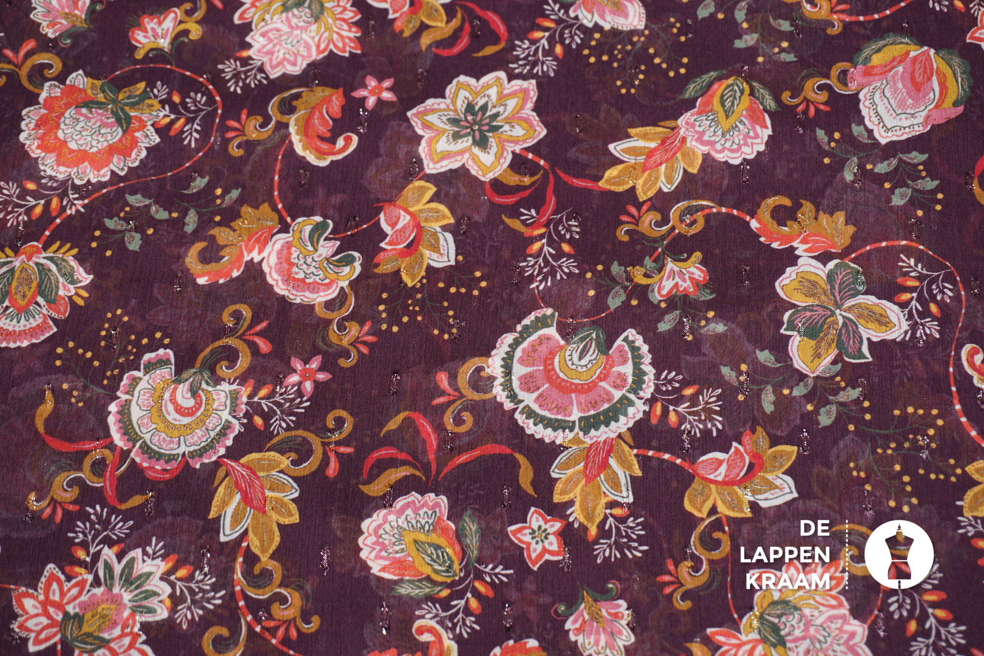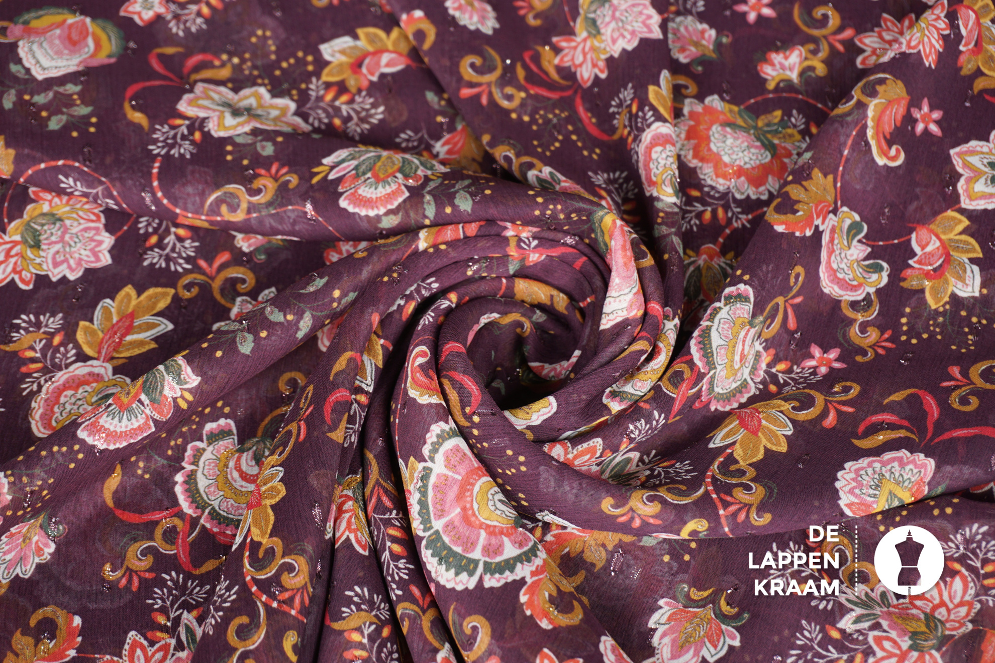 Coupon 711 Chiffon paars met sierlijke bloem 180 x 150 cm