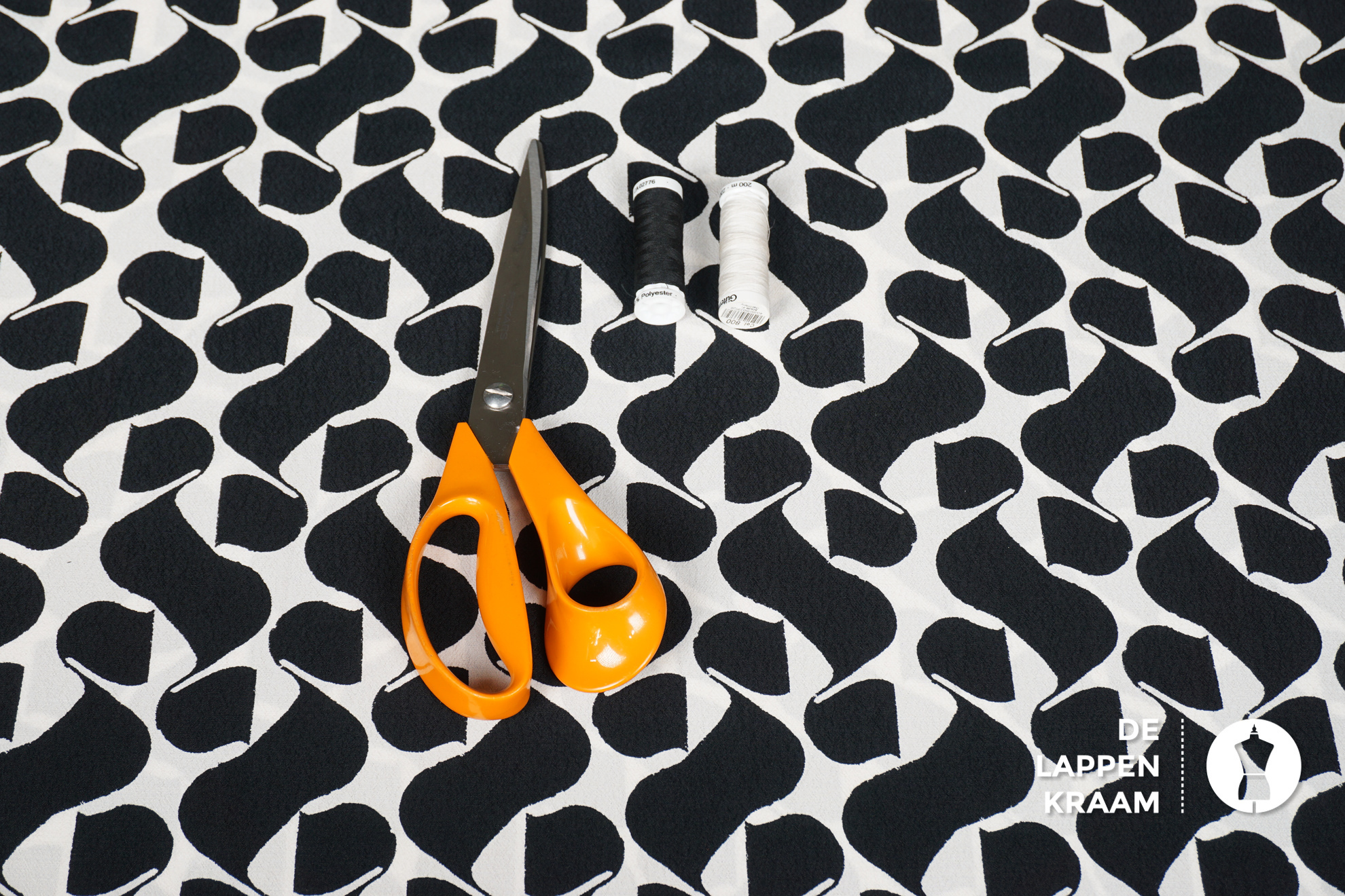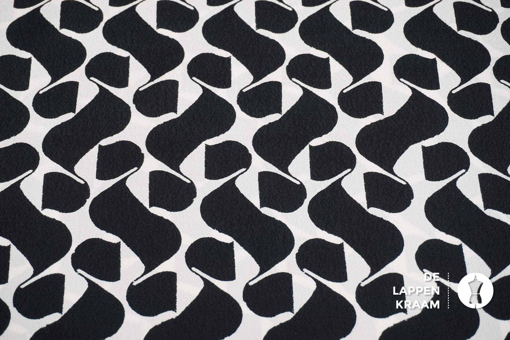 Viscose met een crepe structuurtje. De ondergrond is wit, met een printje van abstracte s-vormen in het zwart. Lees meer