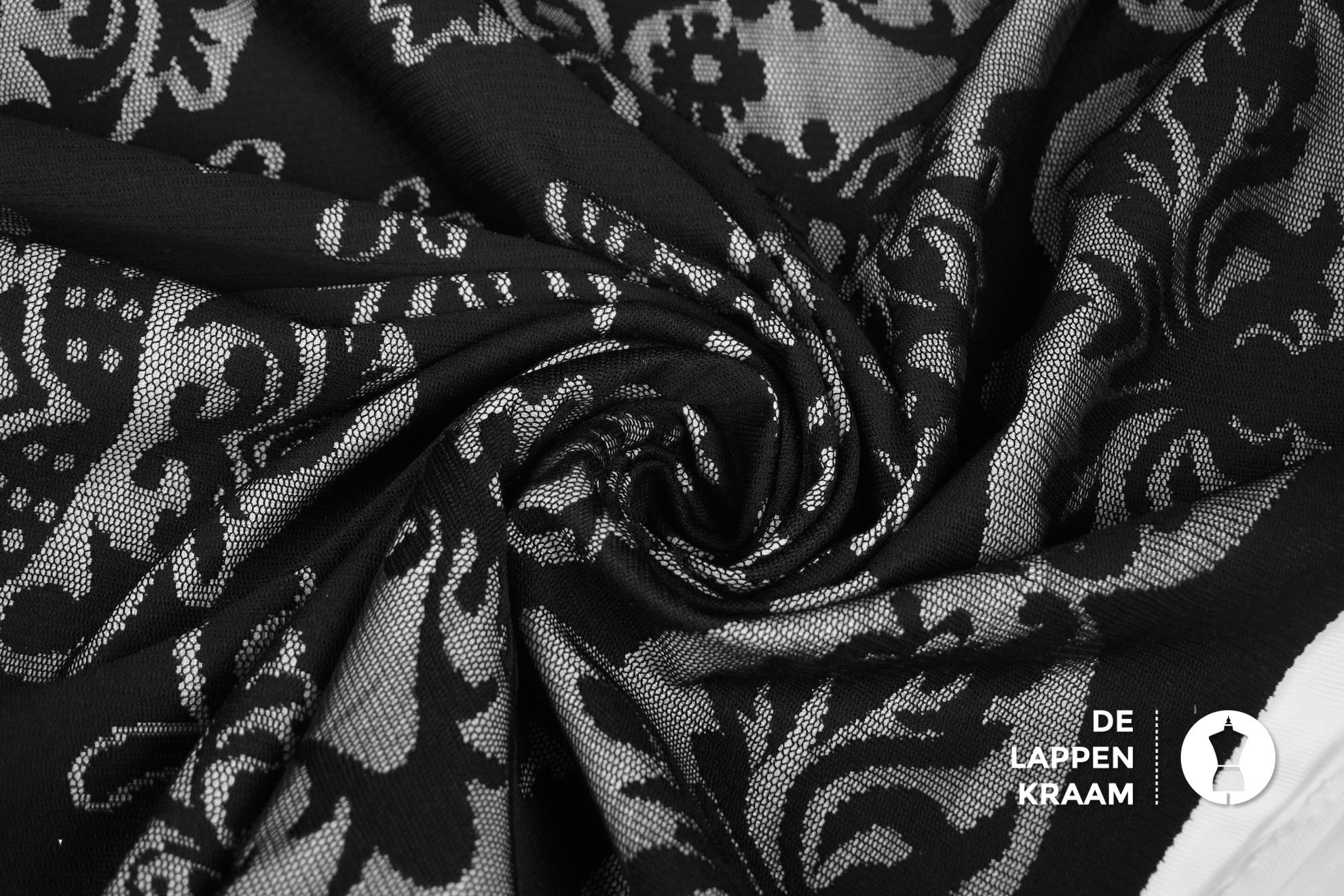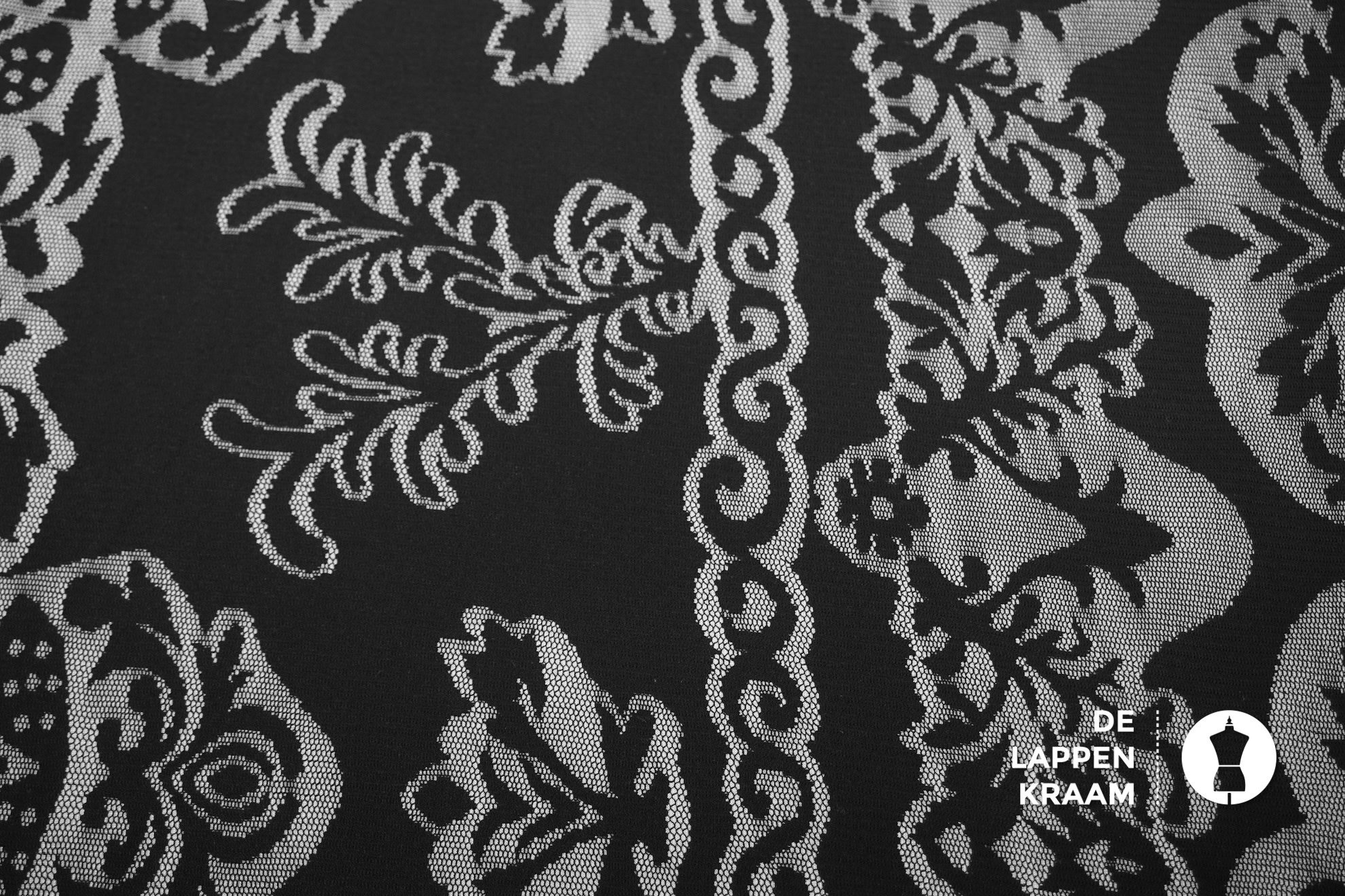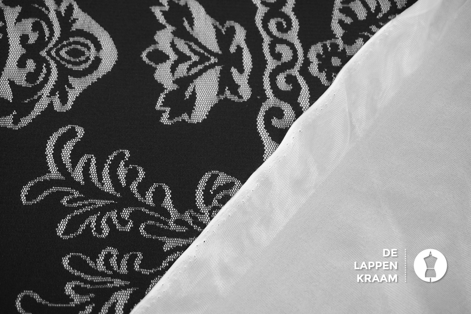 Deze stof bestaat eigenlijk uit 2 lagen: een tricot laagje van polyester, met daar bovenop een laagje zwart kant van katoen in een bloemenpatroon.... Lees meer