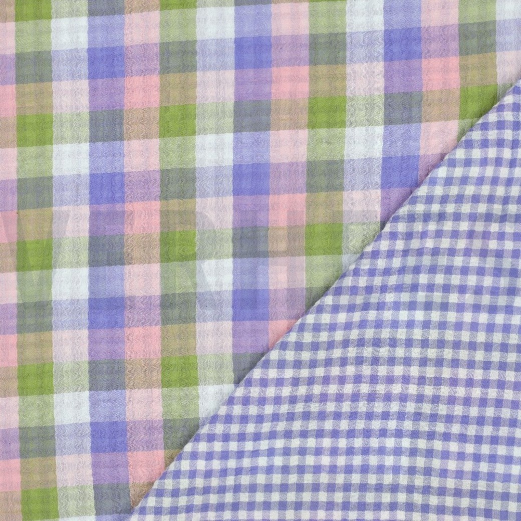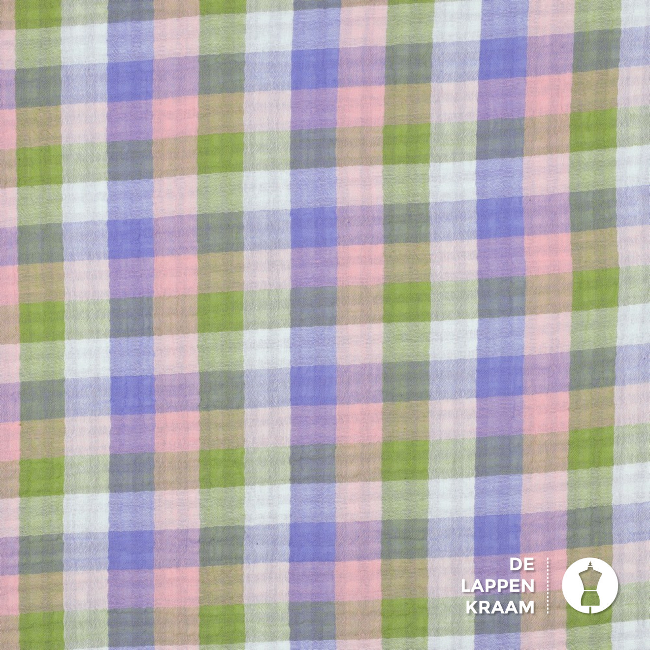 Hydrofiel wordt ook wel double gauze of mousseline genoemd. Deze is wel heel bijzonder, wat beide kanten heeft een mooie ruit. De ene kant heeft een grote ruit is lila, groen, roze en wit, terwijl de andere kant een klein ruitje heeft in lila en wit.... Lees meer