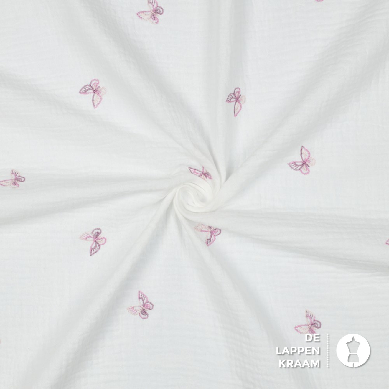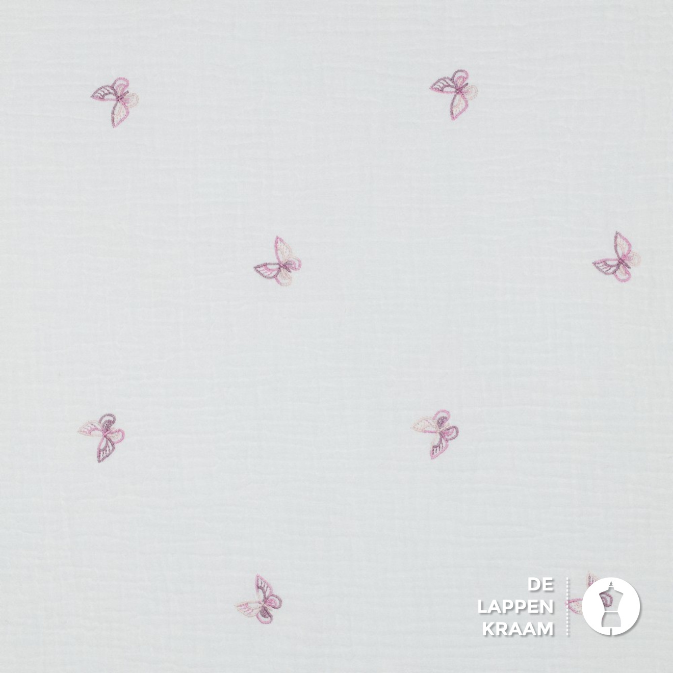 Double gauze stof wit met geborduurde vlinders roze