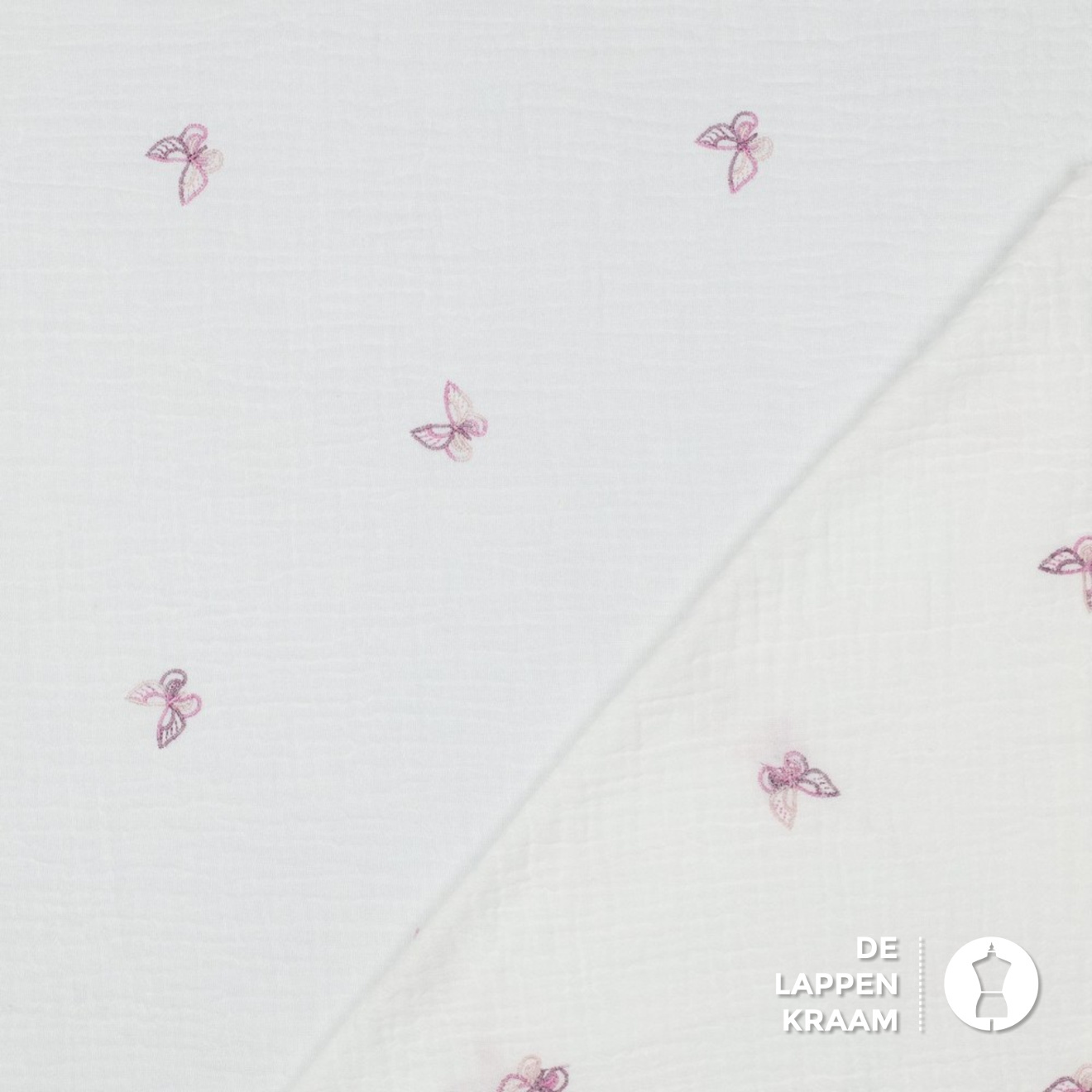 Hydrofiel, ook wel mousseline of double gauze genoemd. Deze is in het wit, met roze vlinders die op de stof geborduurd zijn.... Lees meer