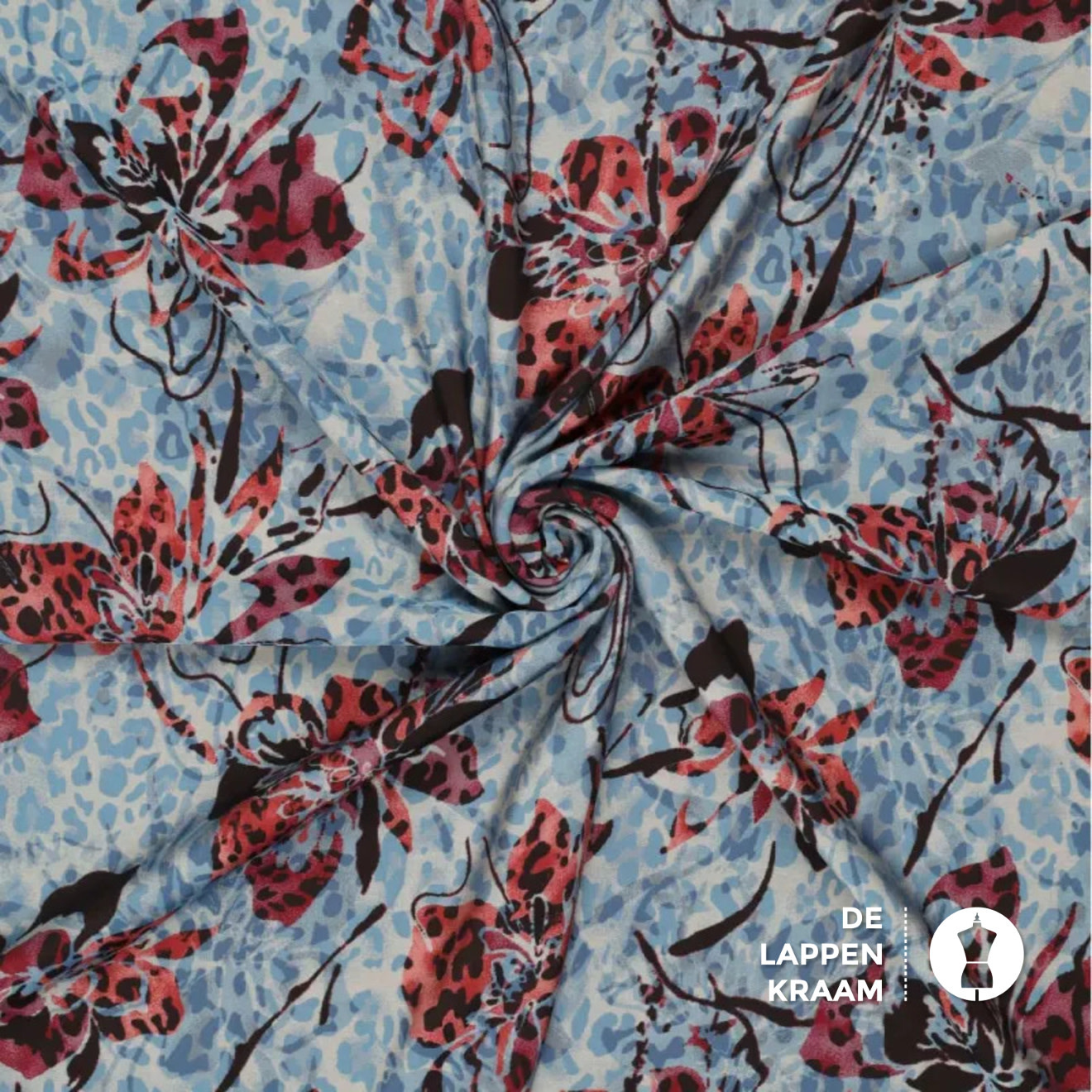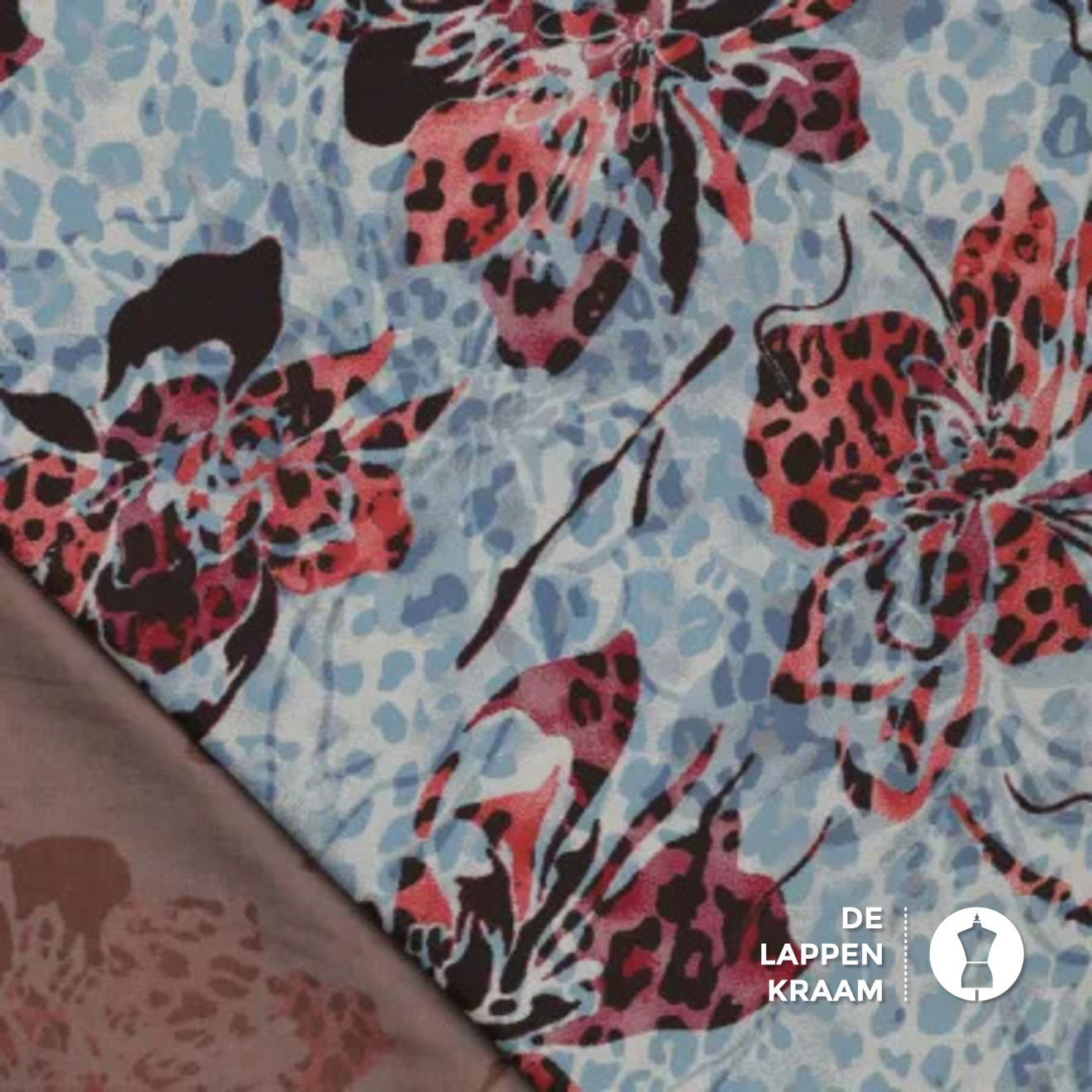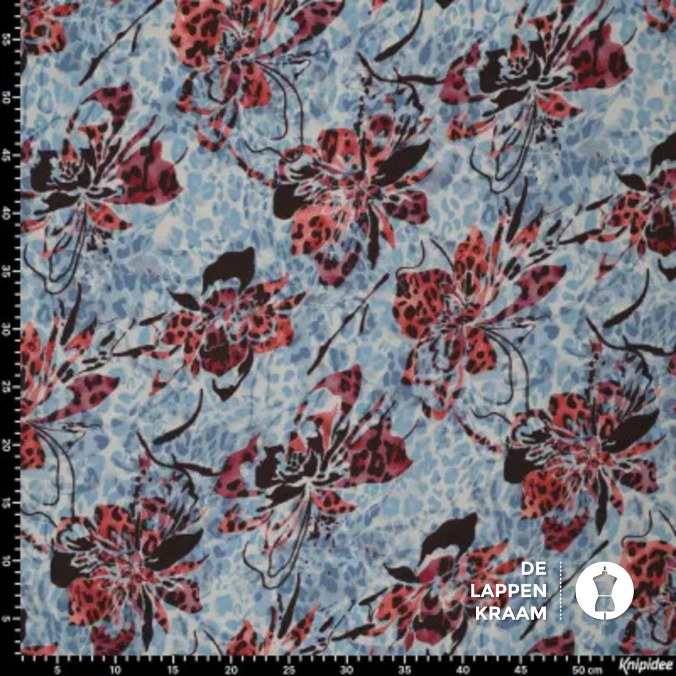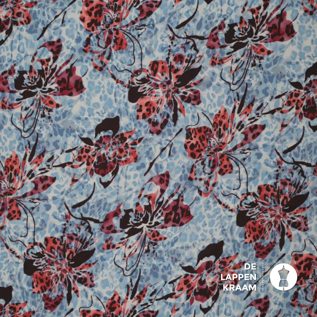 De ondergrond van deze leukerd bestaat uit een mini-panterprintje in blauw met beige. Daar is nog een andere print overheen gedrukt: een mooie vlindervormige bloem in rood met zwart. Mooi voor jurk of blouse, wat een topper!... Lees meer