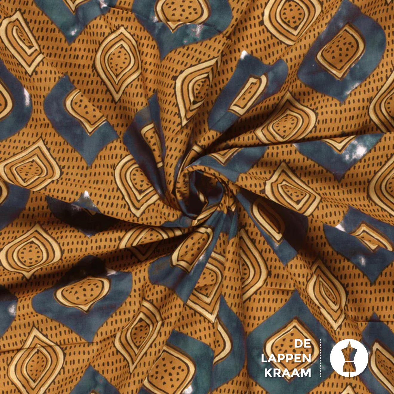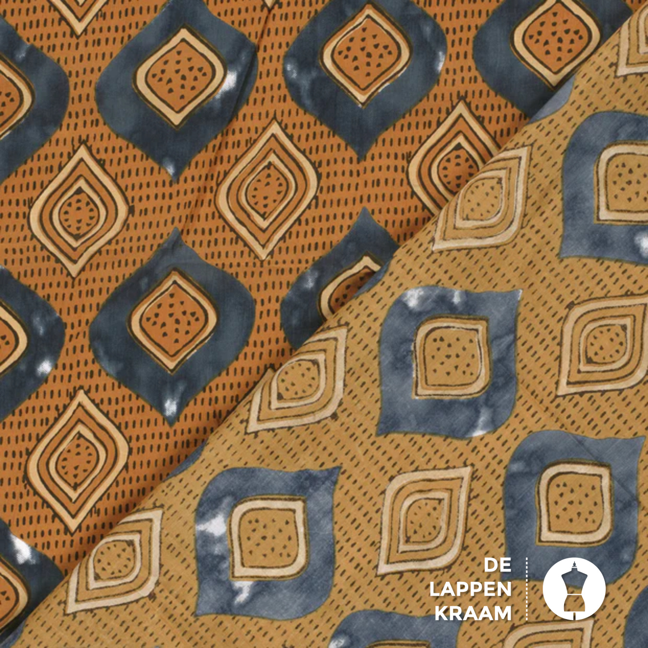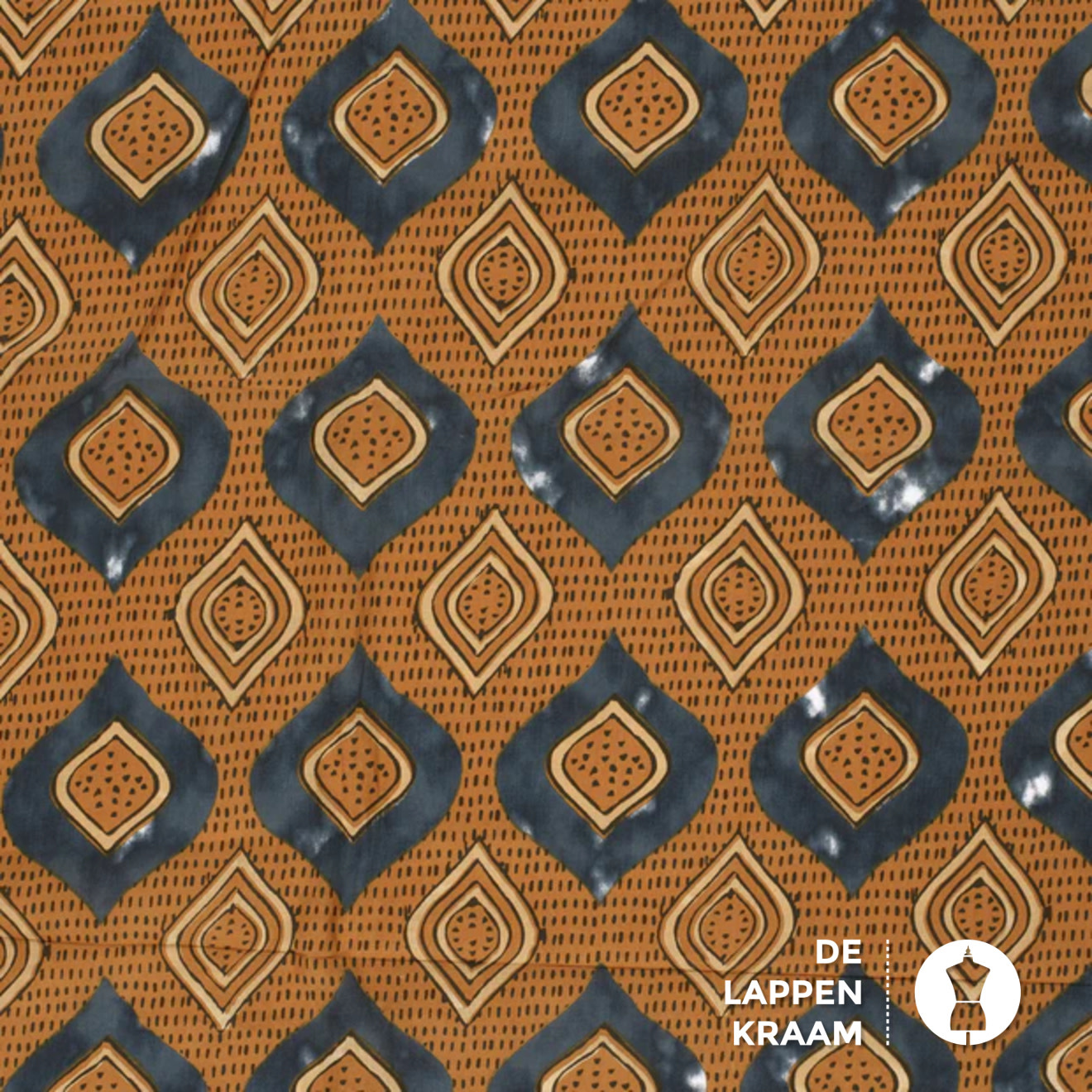 Zijdezachte katoen in brique met een batikprint in jeansblauw en beige. Lees meer