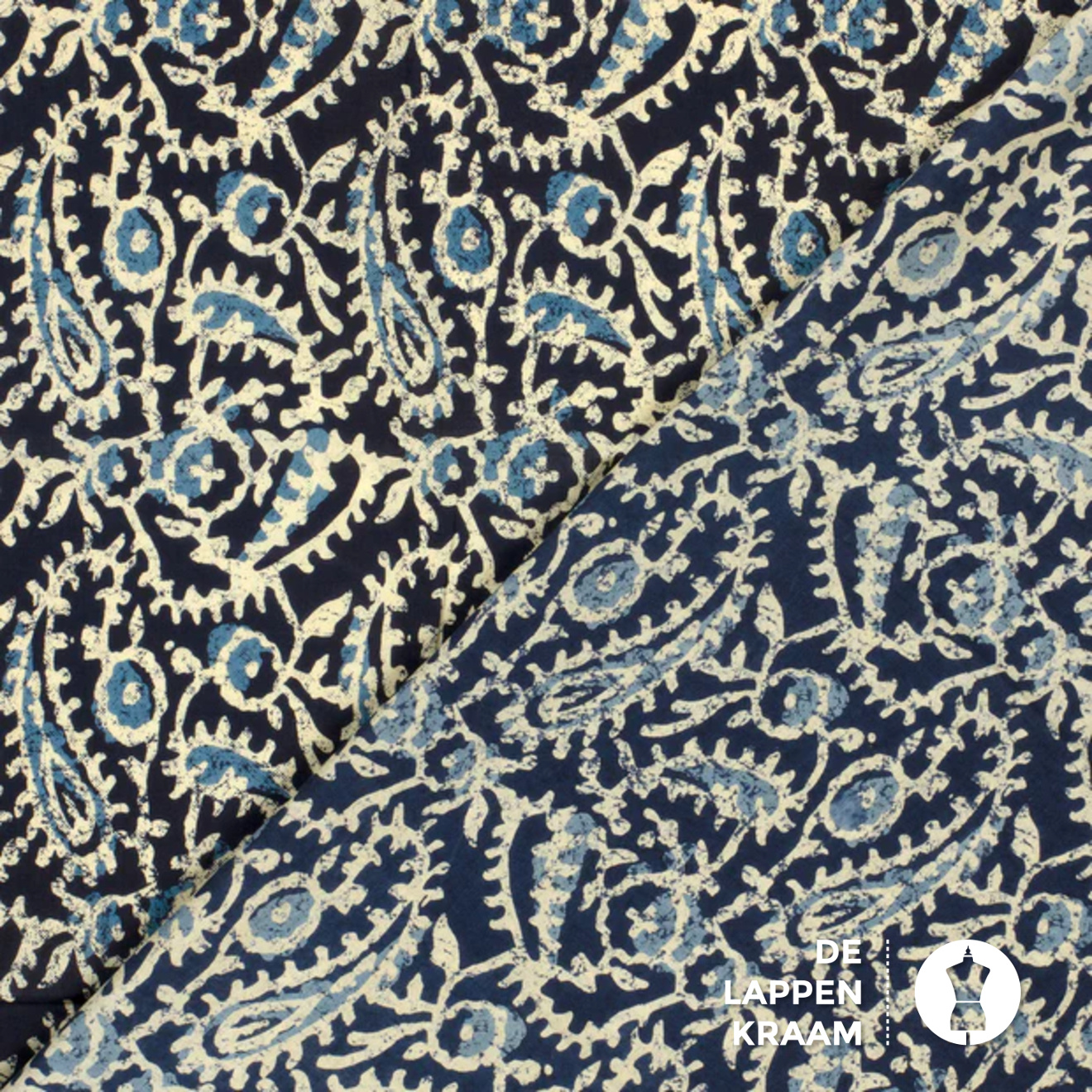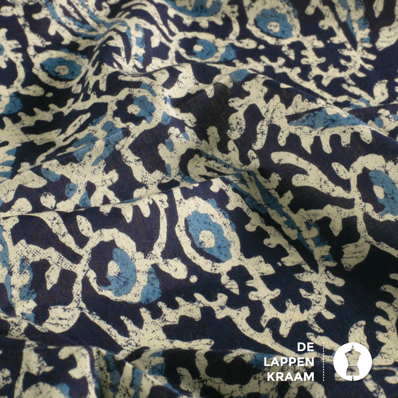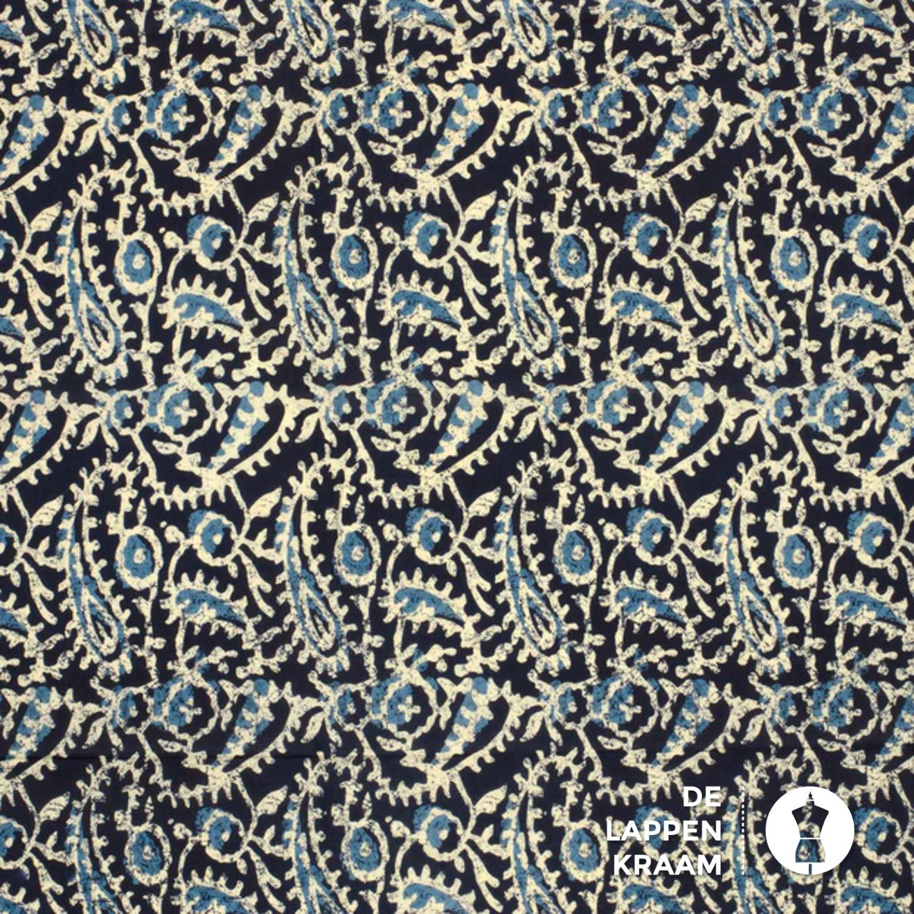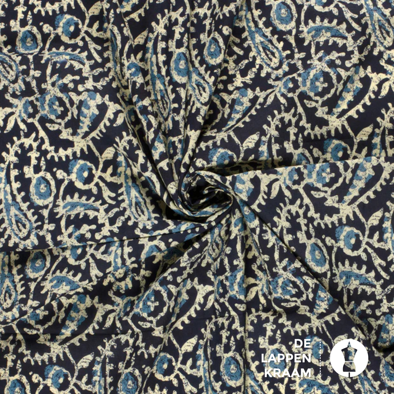 Egyptisch katoen in donkerblauw met een abstracte paisley print in ecru en petrol. De stof voelt zijdezacht aan. Lees meer