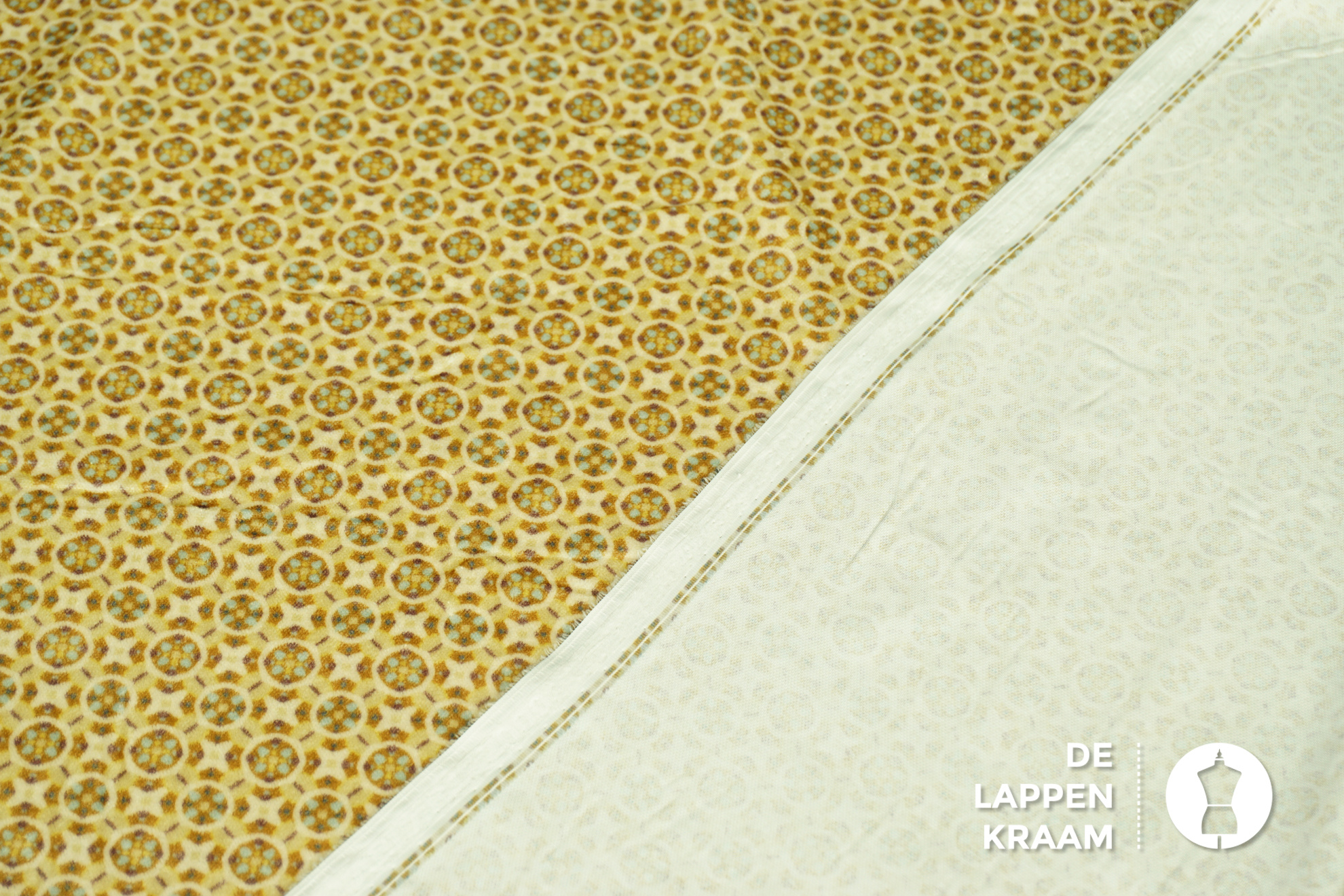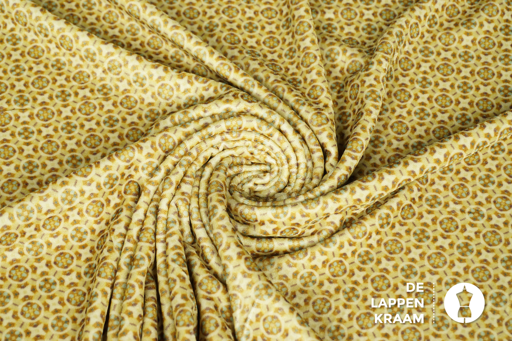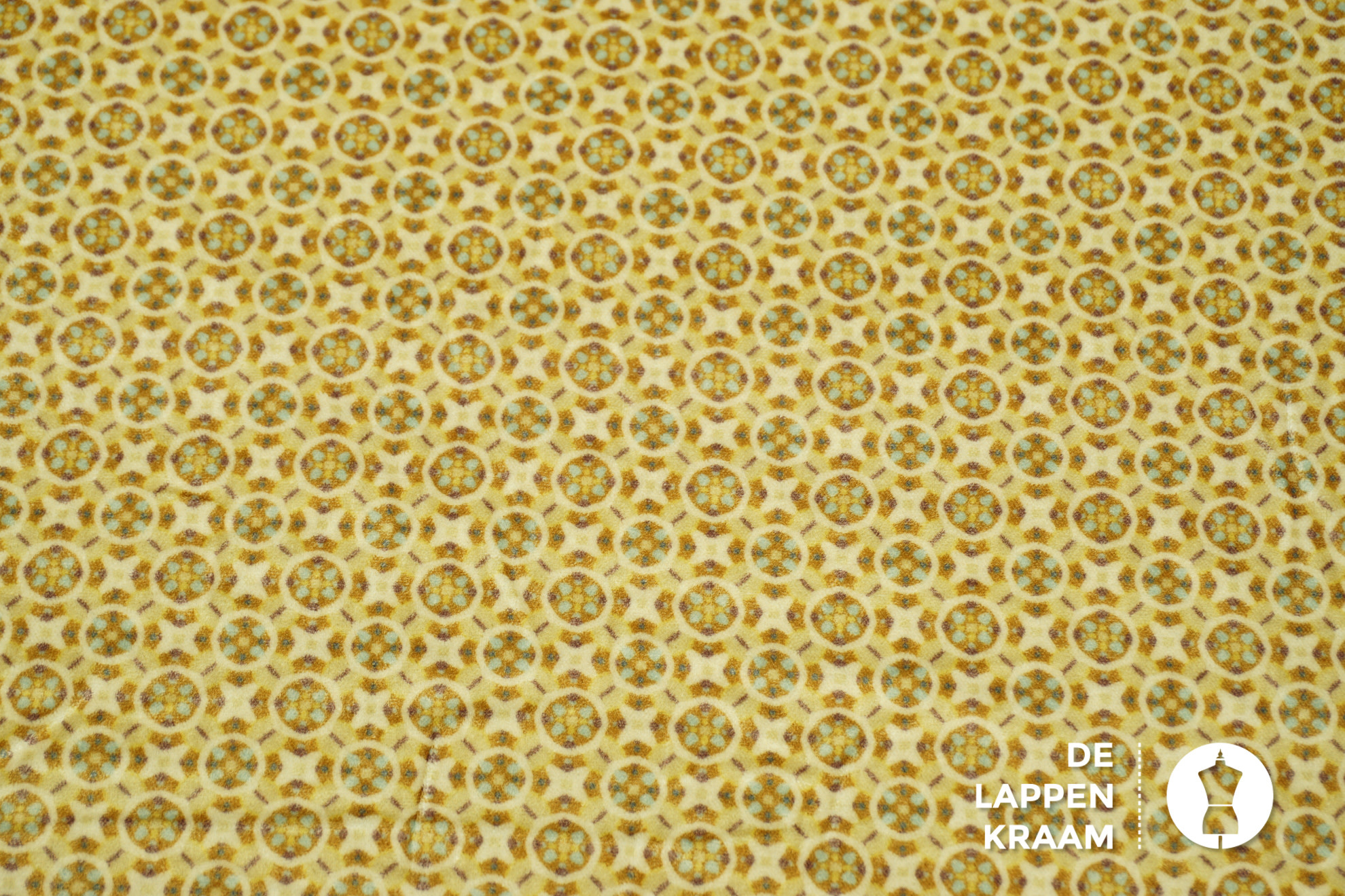 Kortgeschoren fluweel met een retroprint in geel met details in lichtblauw en paars. De stof heeft geen rek. Lees meer