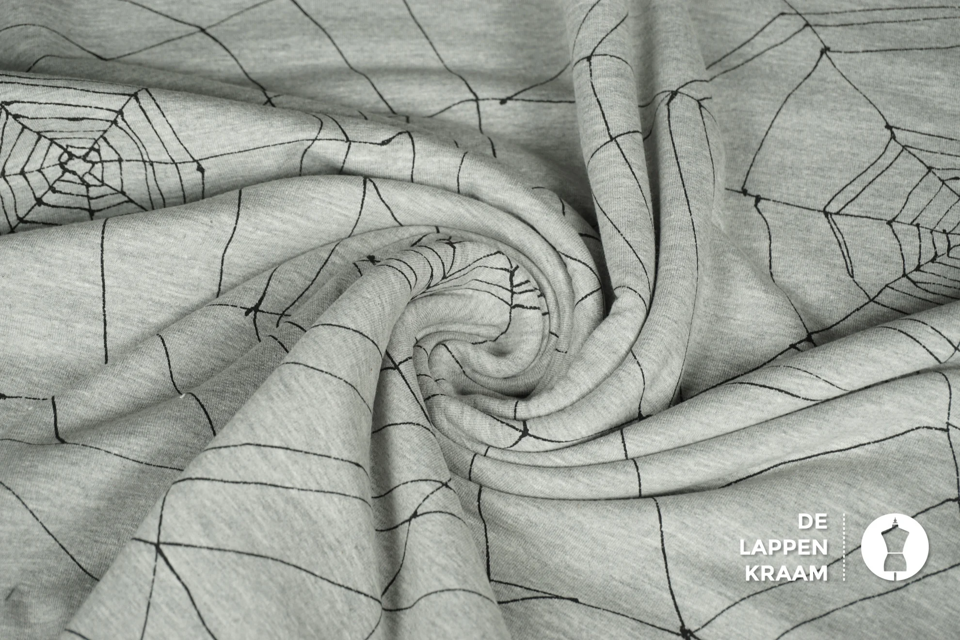 French terry in lichtgrijs met een printje van spinnenwebben, bestaande uit zwarte draden. De achterkant bestaat uit de kenmerkende lusjes van French terry.... Lees meer