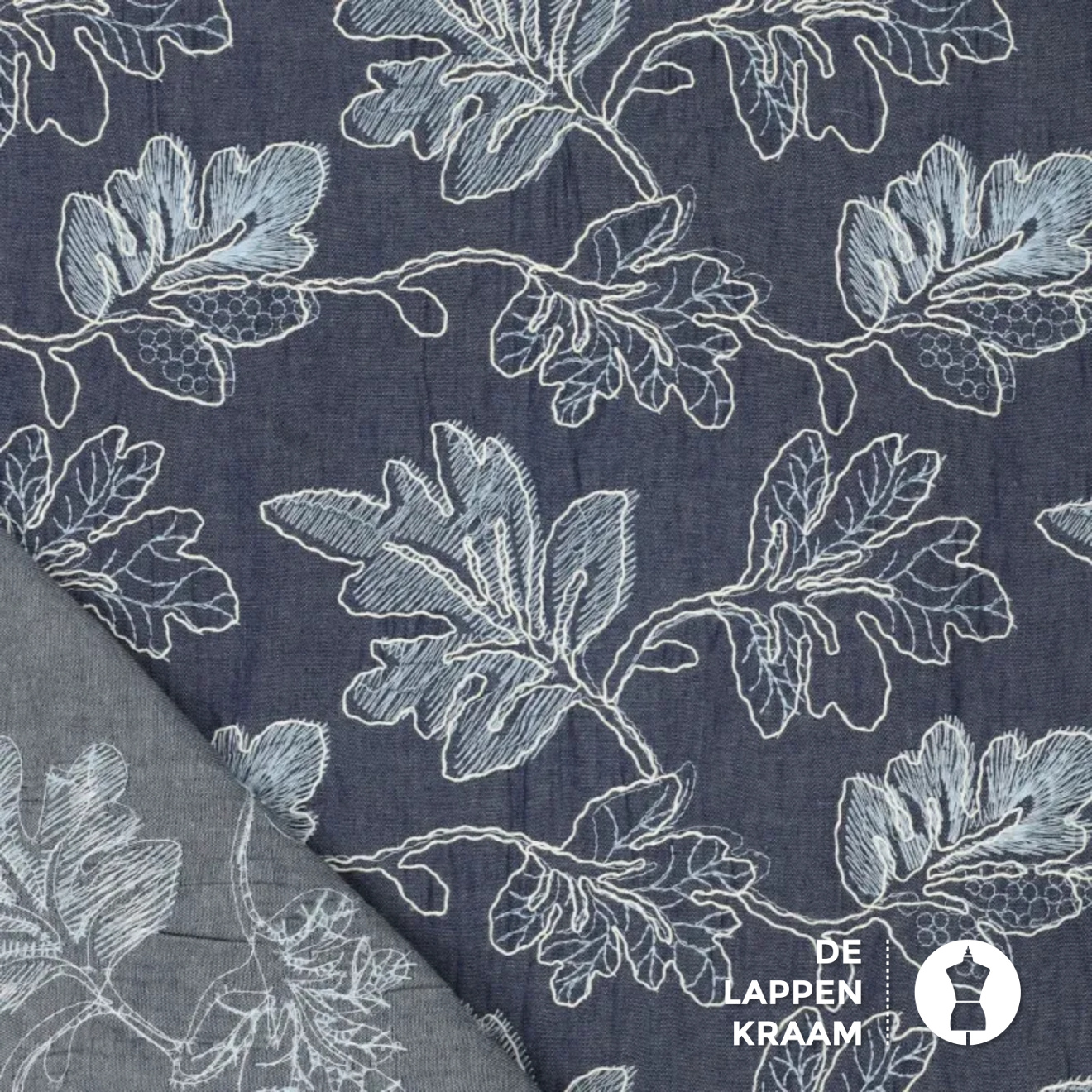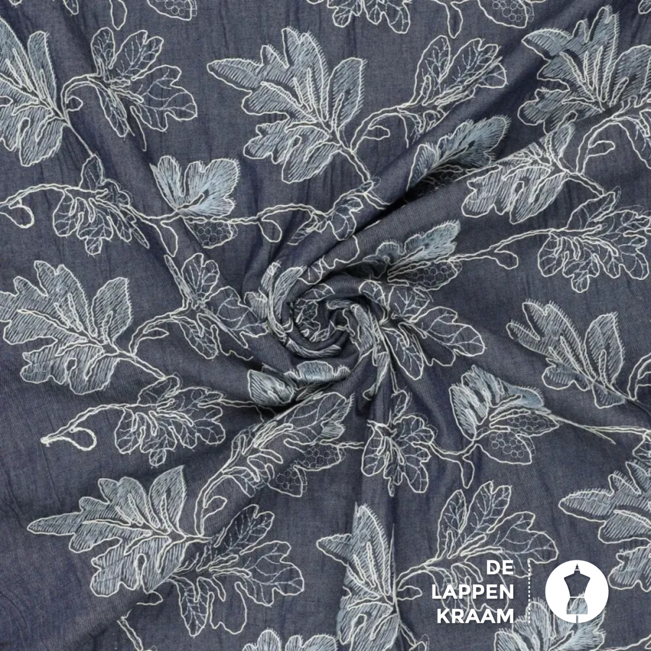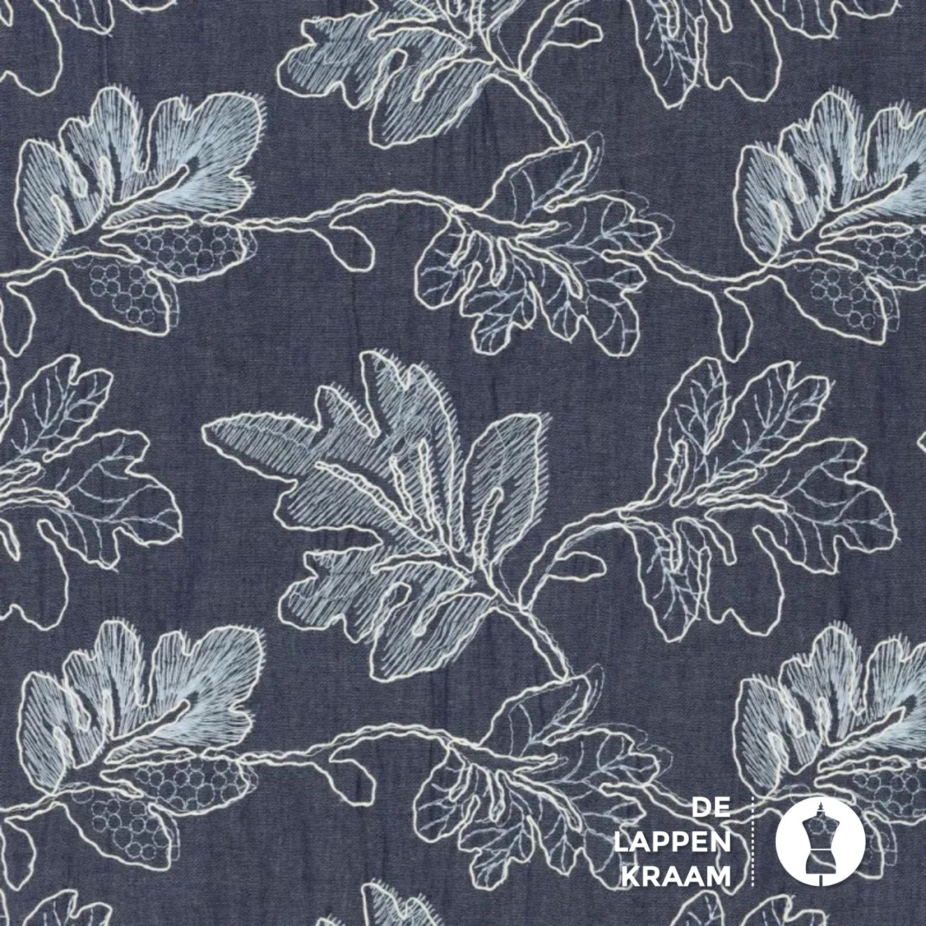 Donkerblauwe chambray (iets minder stug dan denim) met borduring van bladeren in lichtblauw. de contouren van de blaadjes zijn benadrukt met een dikkere ecru draad.... Lees meer