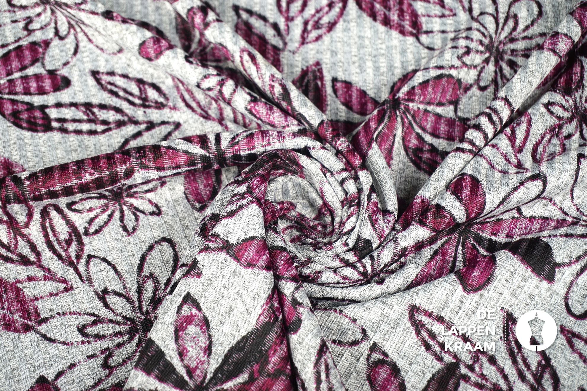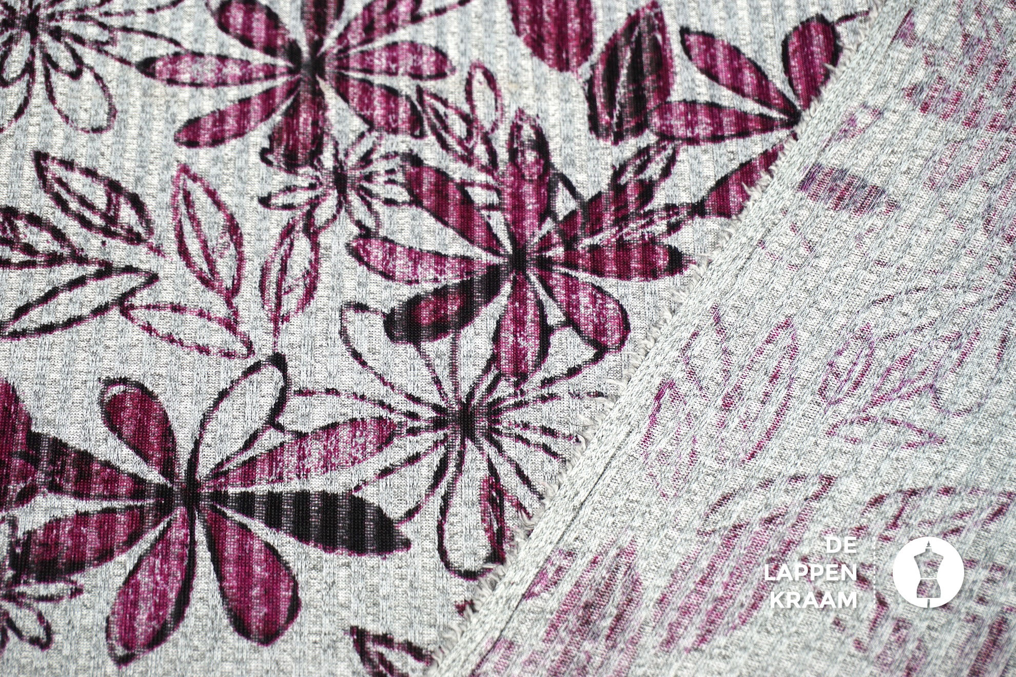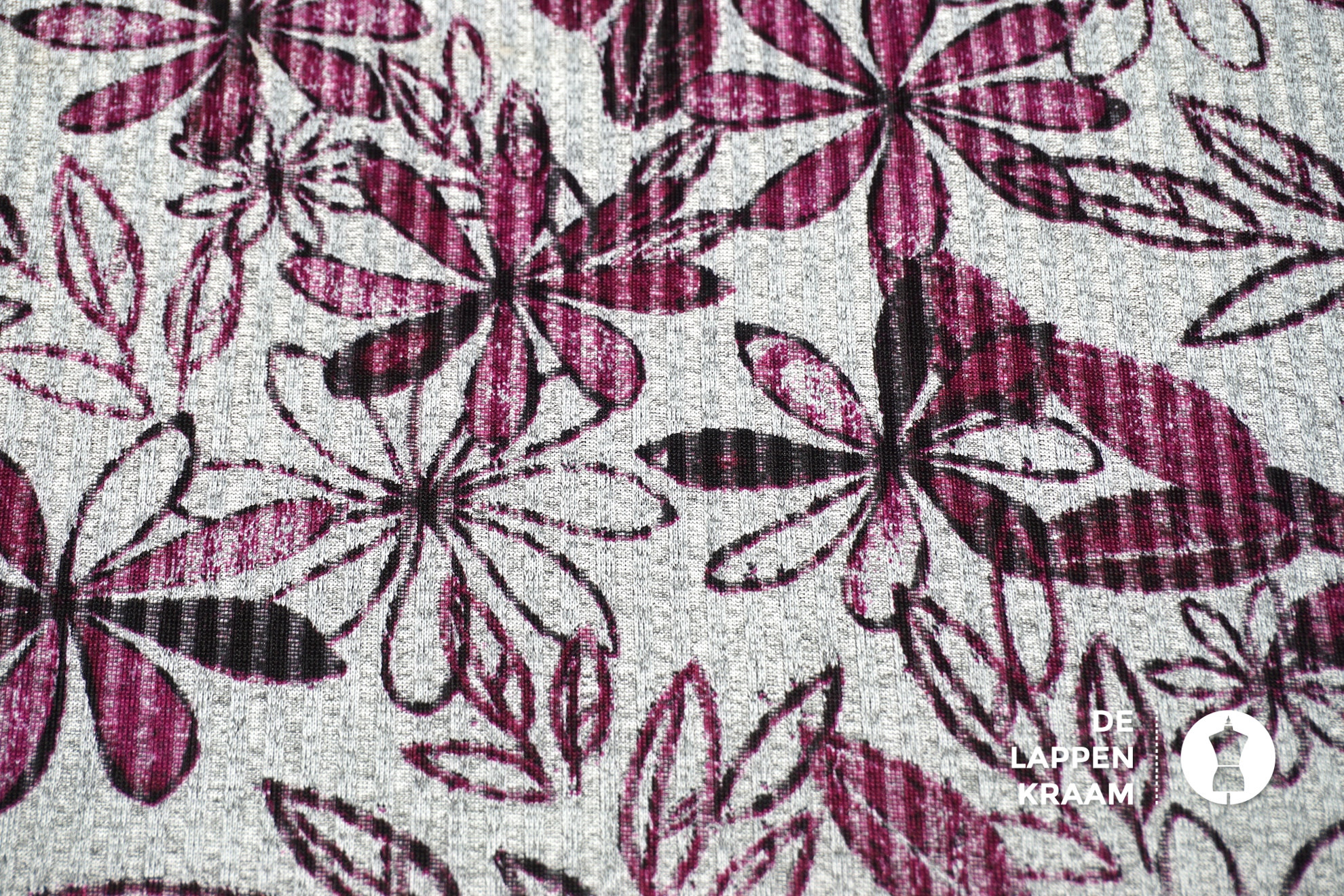 Dunne gebreide stof in grijs gemeleerd, met een print van bladeren in verschillende roze tinten. Over de lengte van de stof zijn er smalle strepen gebreid... Lees meer