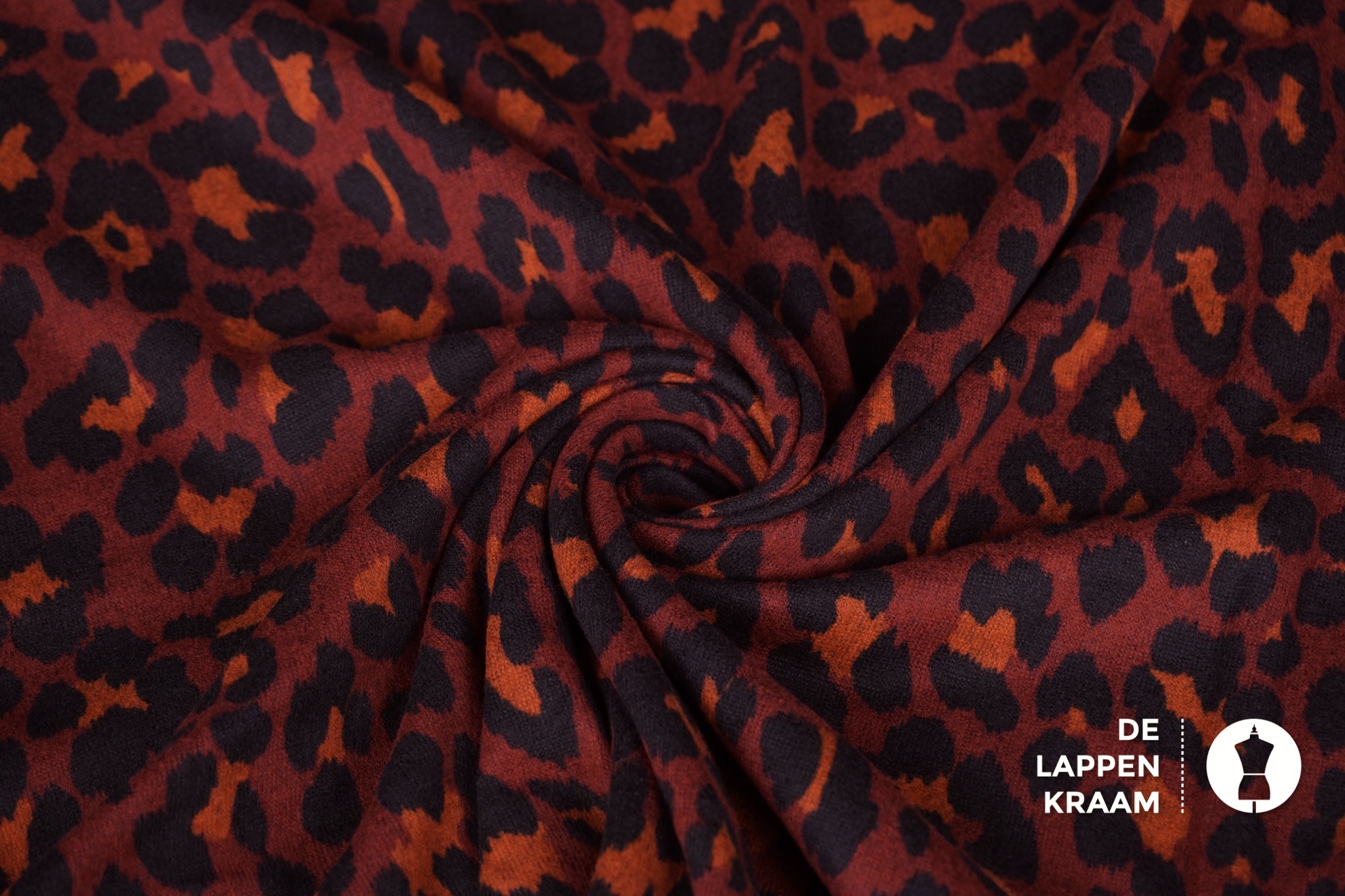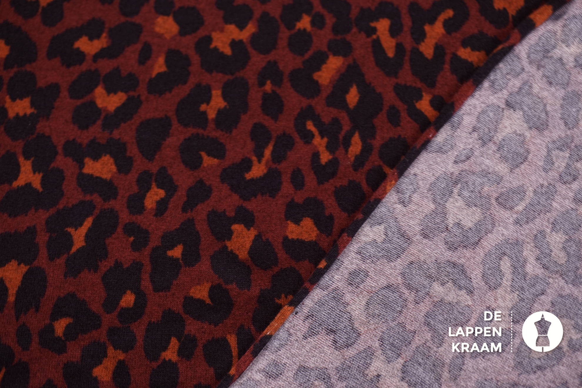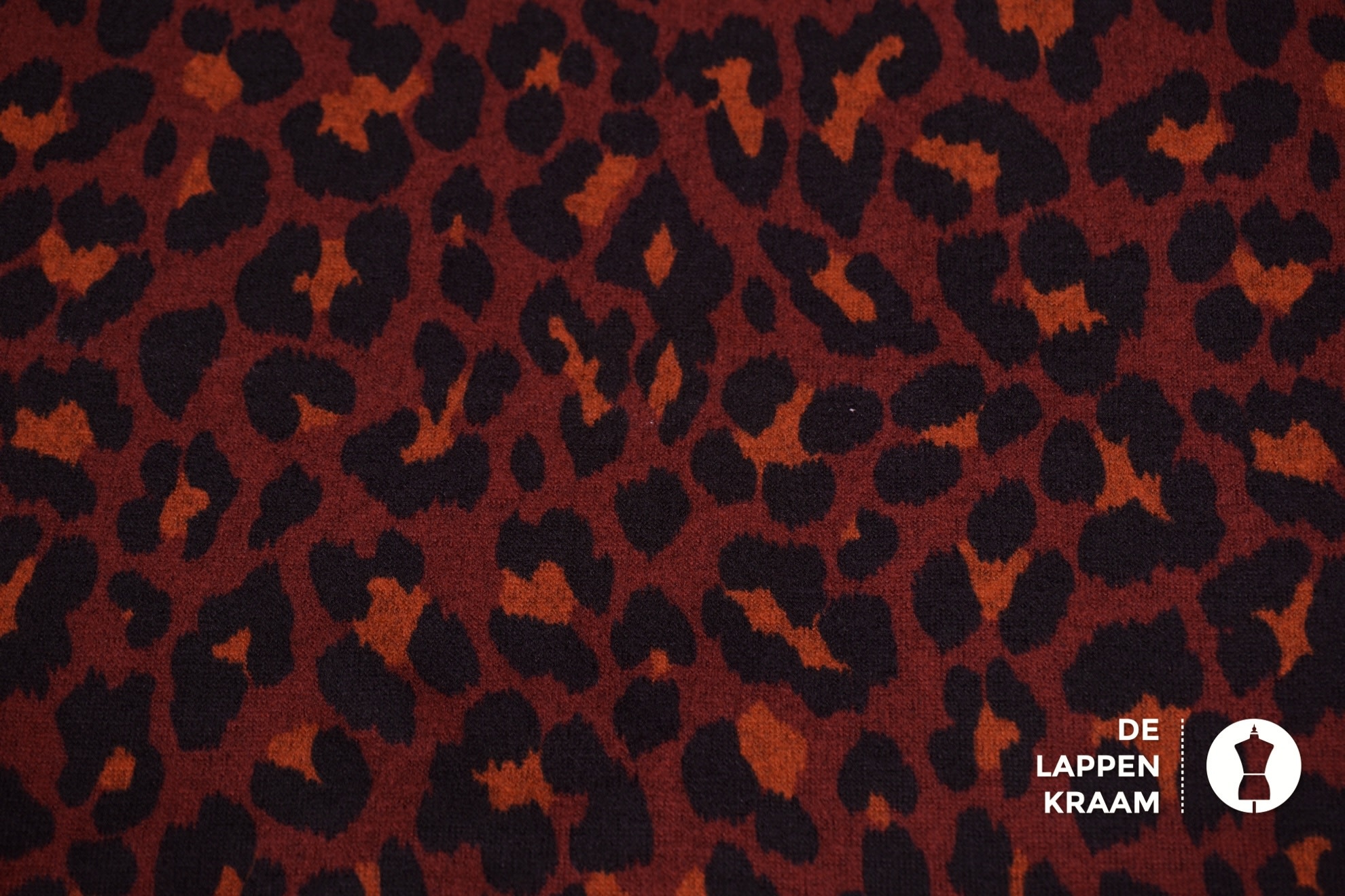 Gebreide stof die licht geruwd lijkt, waardoor hij heerlijk zacht aanvoelt. De ondergrond is bordeaux, met een luipaardprint in zwart met brique.... Lees meer