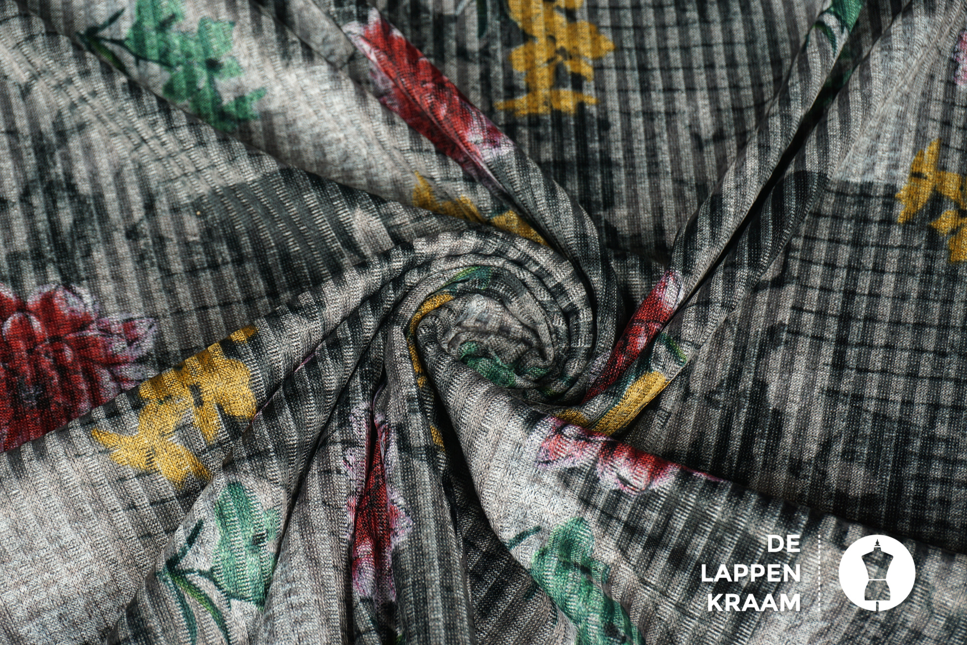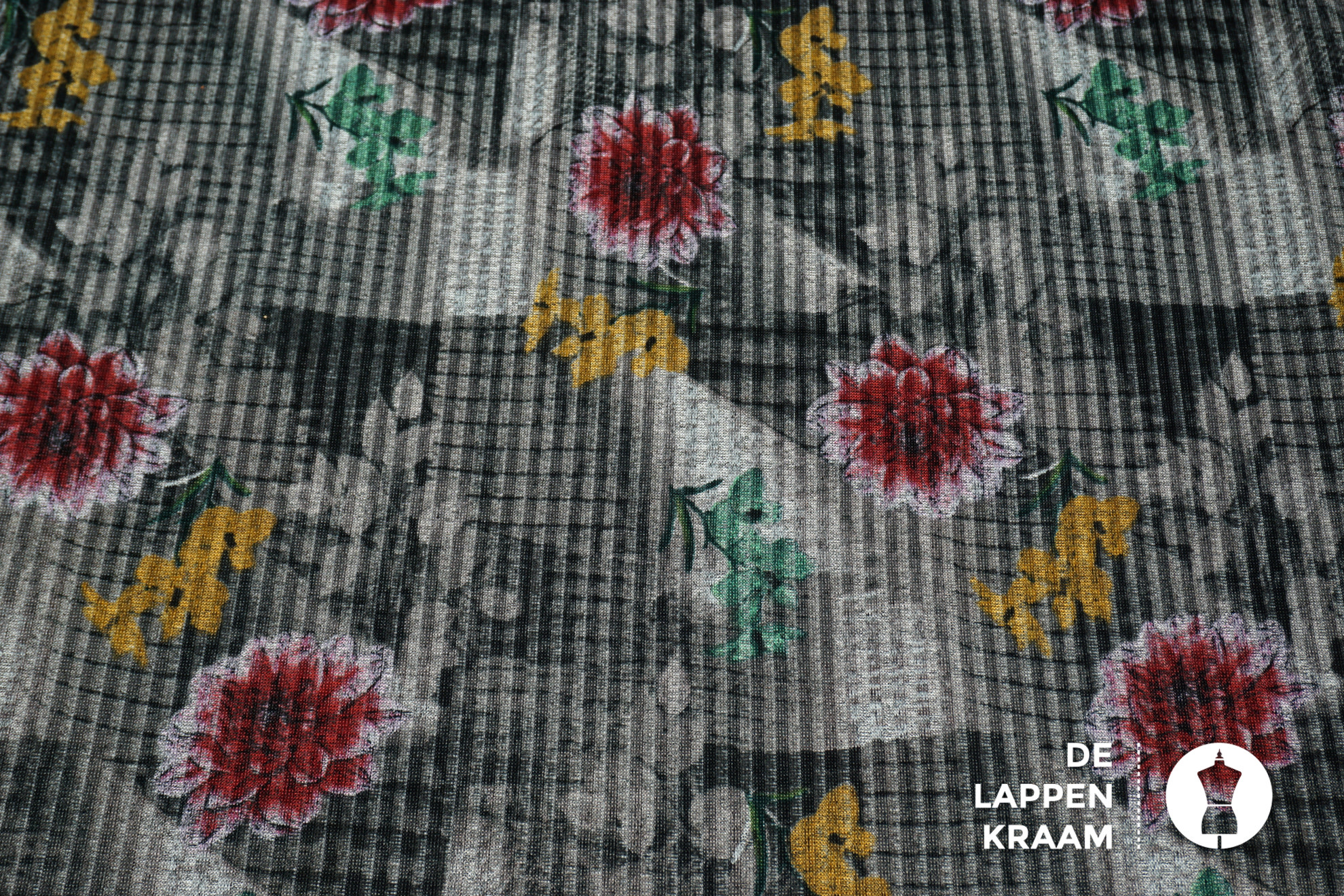 Gebreide stof in grijs met een ingebreide verticale streep. De stof heeft daarnaast een print van bloemen in rood, geel, groen en grijs.... Lees meer