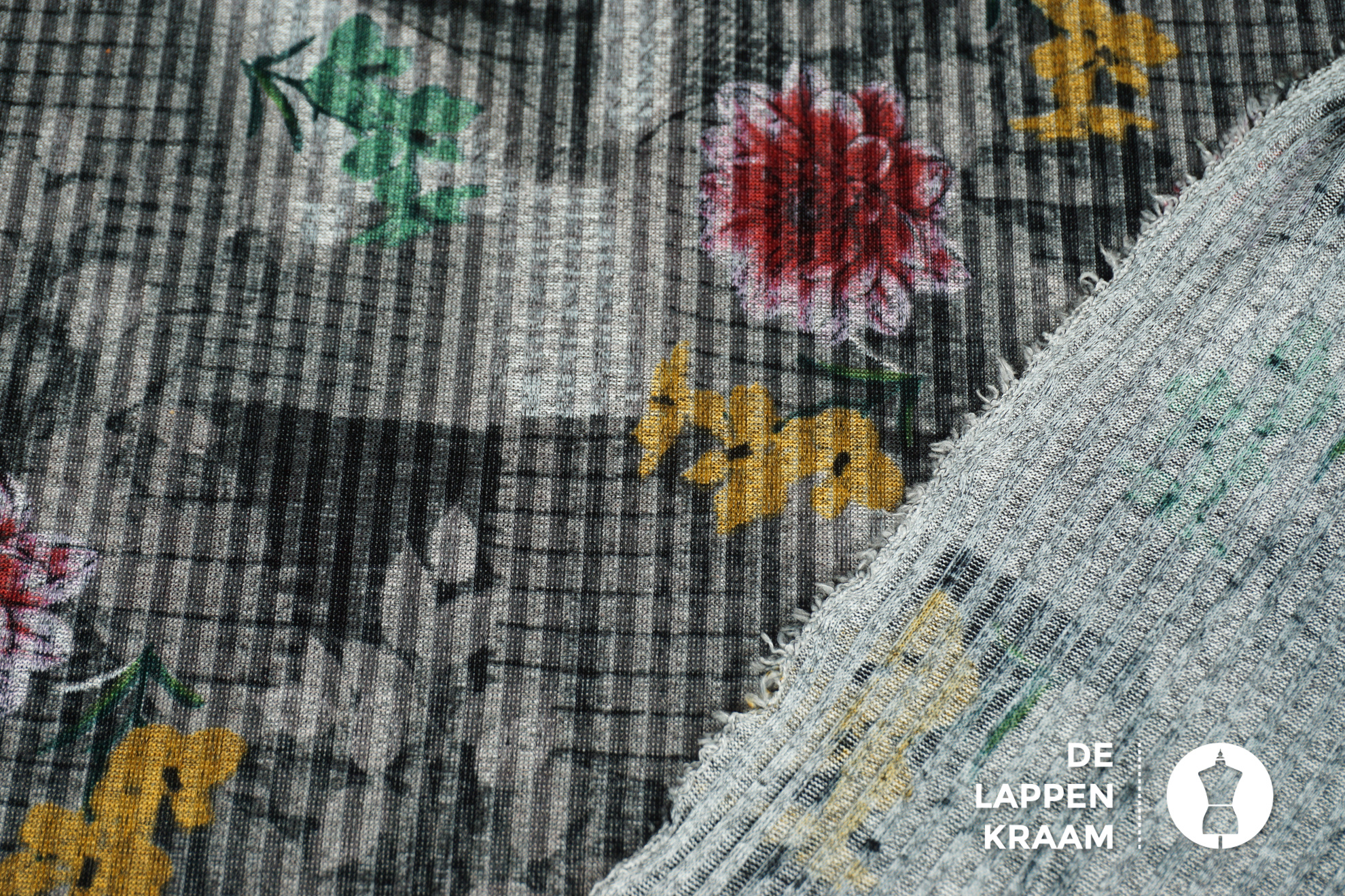 Black Friday Gebreid stof met ribbel grijs met bloemen