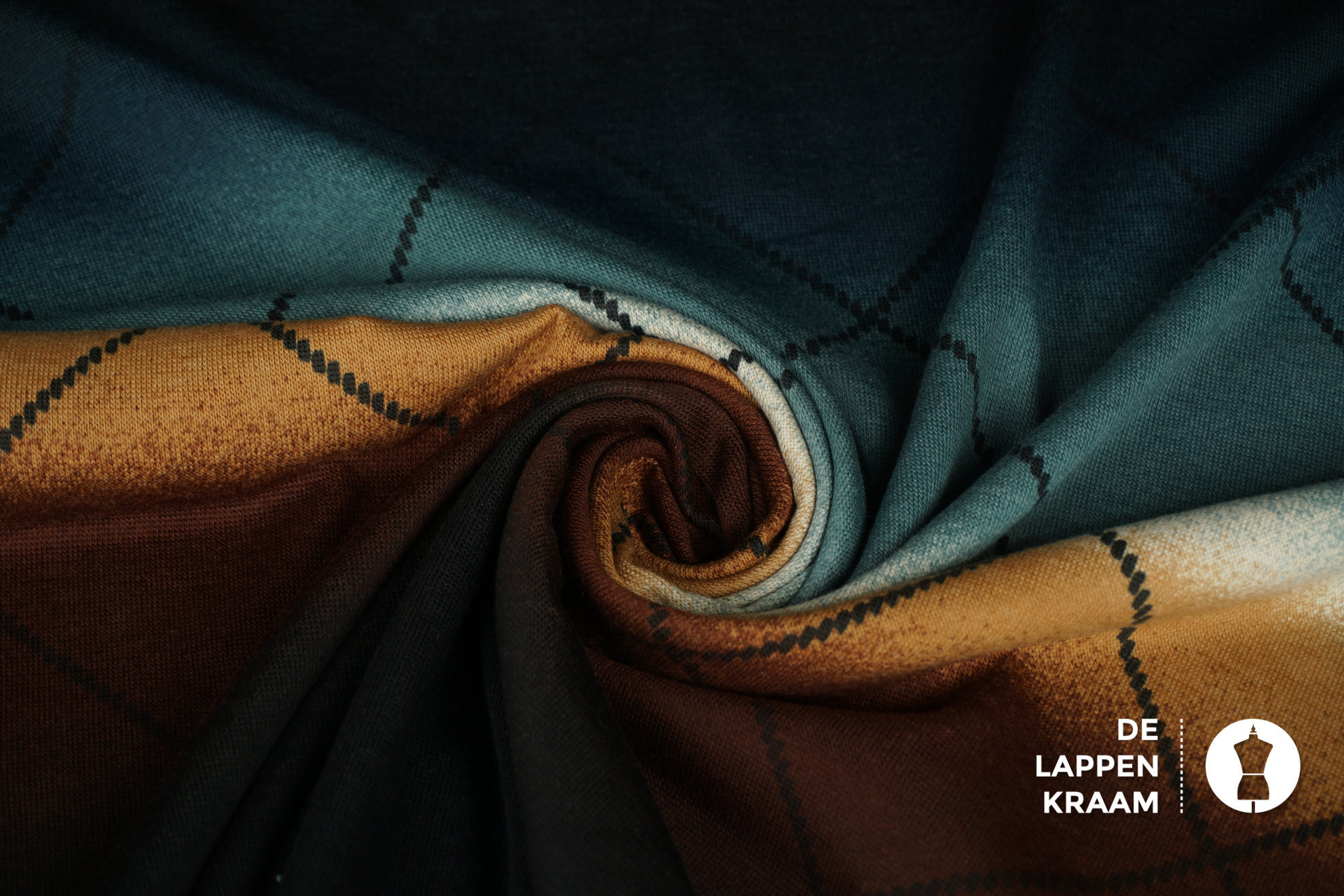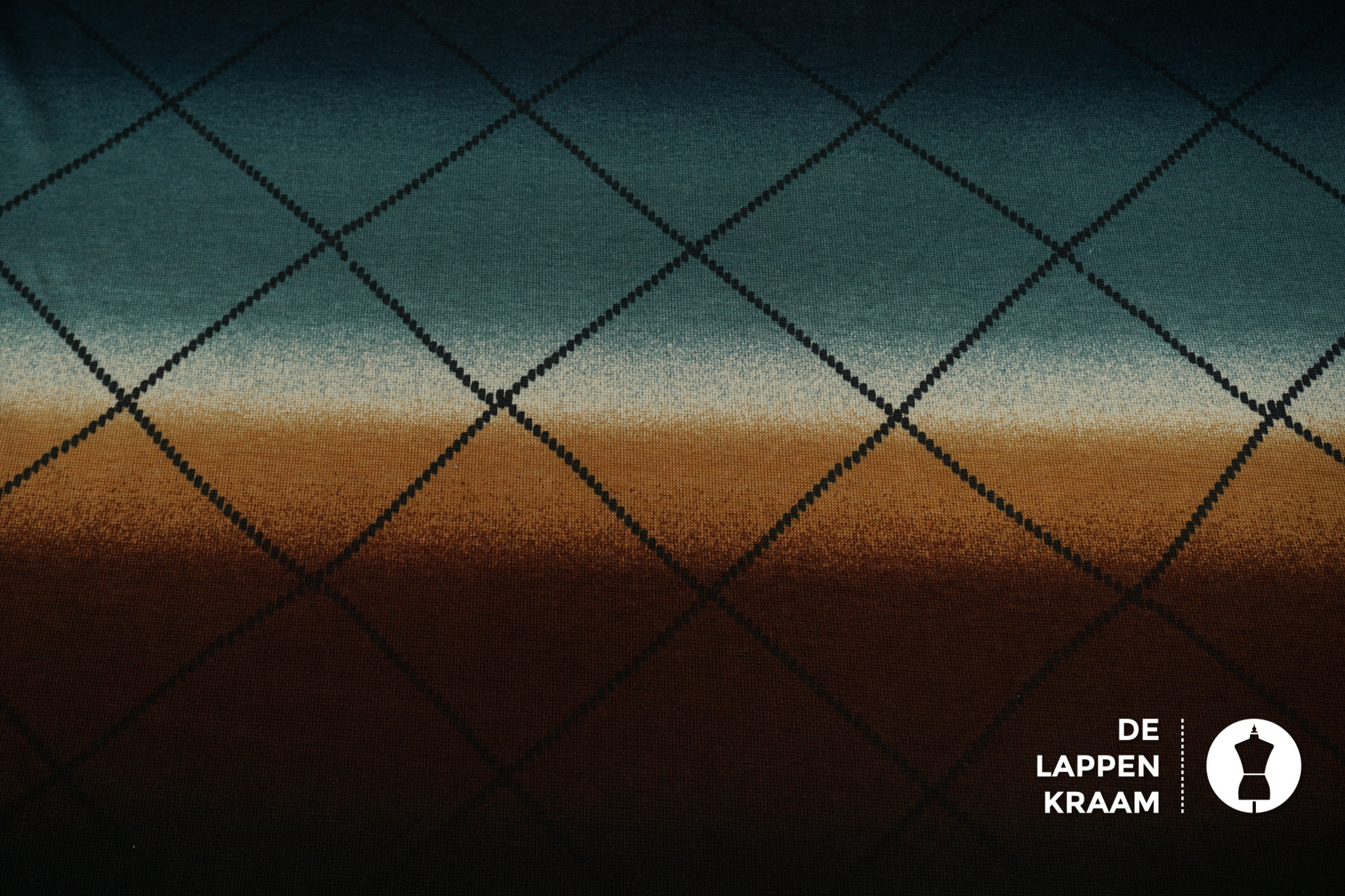 Gebreide stof met horizontale banen die van kleur veranderen van donkerbruin naar caramel en blauw. Daar overheen een ruitvormige streep. Kleuren en ruiten zijn geprint (niet ingebreid). Leuk voor een dunne pullover.... Lees meer