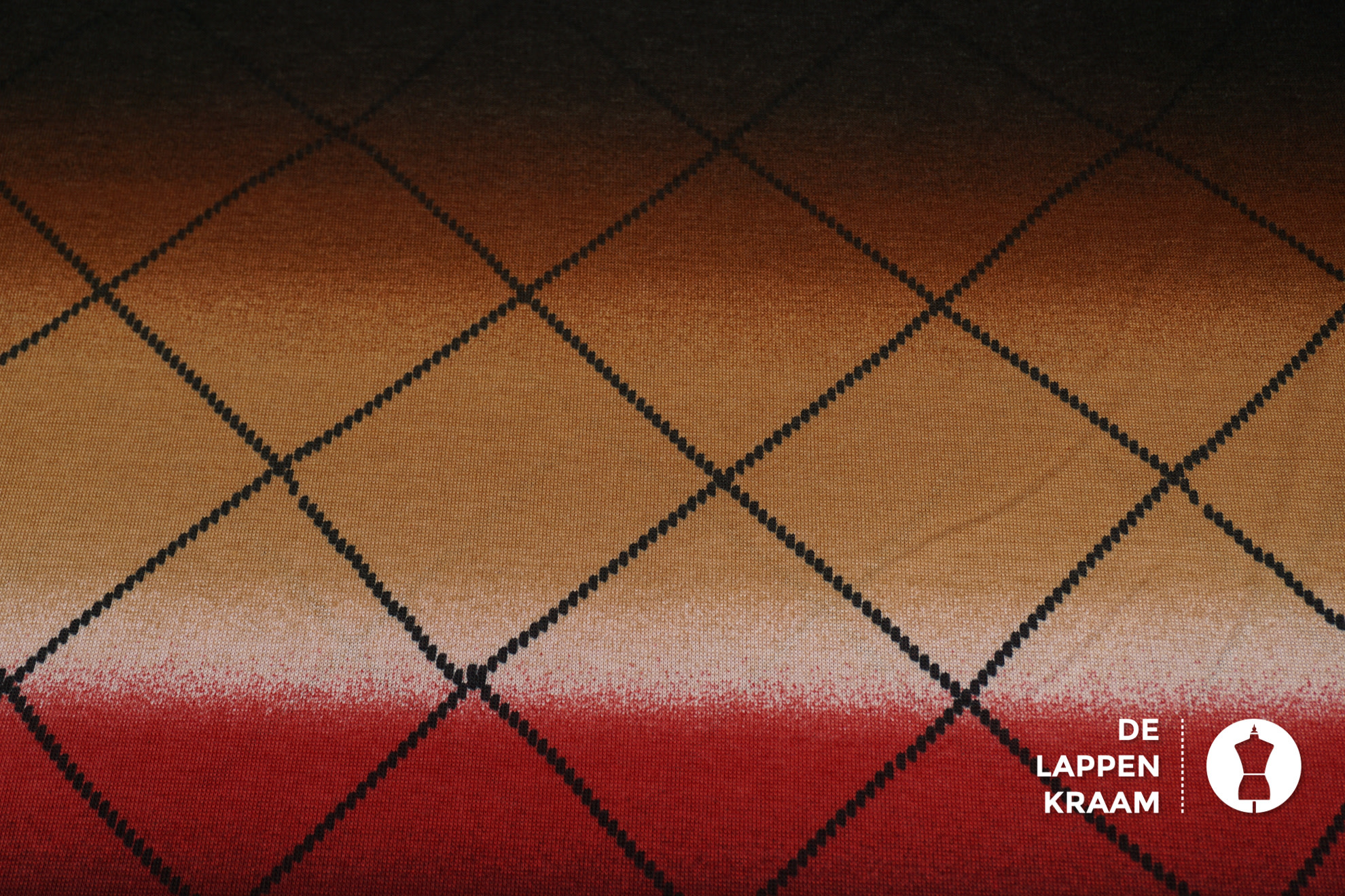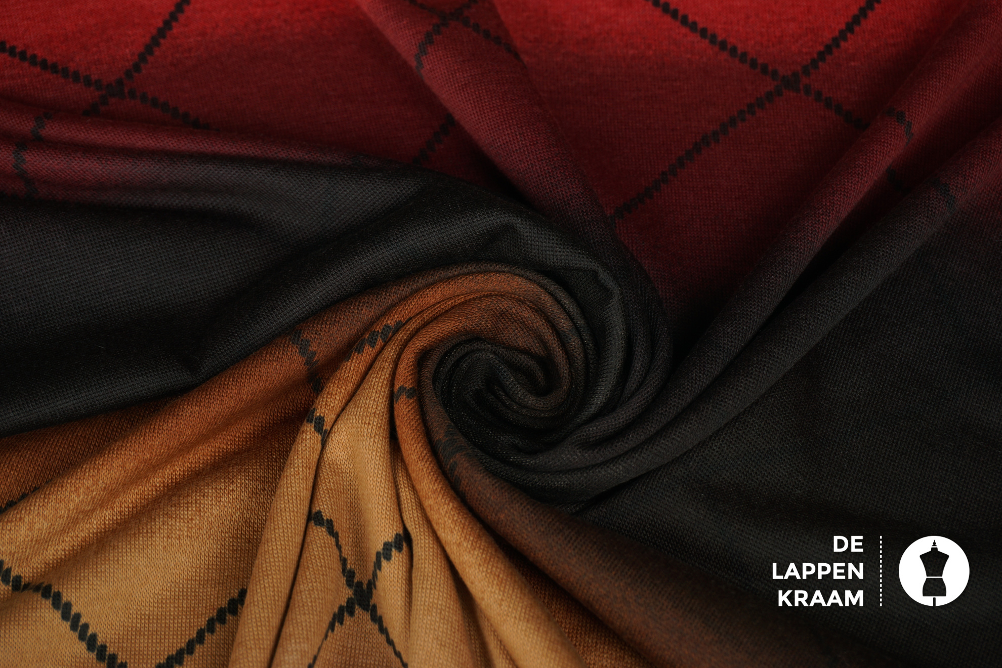 Gebreide stof met horizontale banen die van kleur veranderen van donkerbruin naar caramel, bordeaux en beige. Daar overheen een ruitvormige streep. Kleuren en ruiten zijn geprint (niet ingebreid). Leuk voor een dunne pullover.... Lees meer