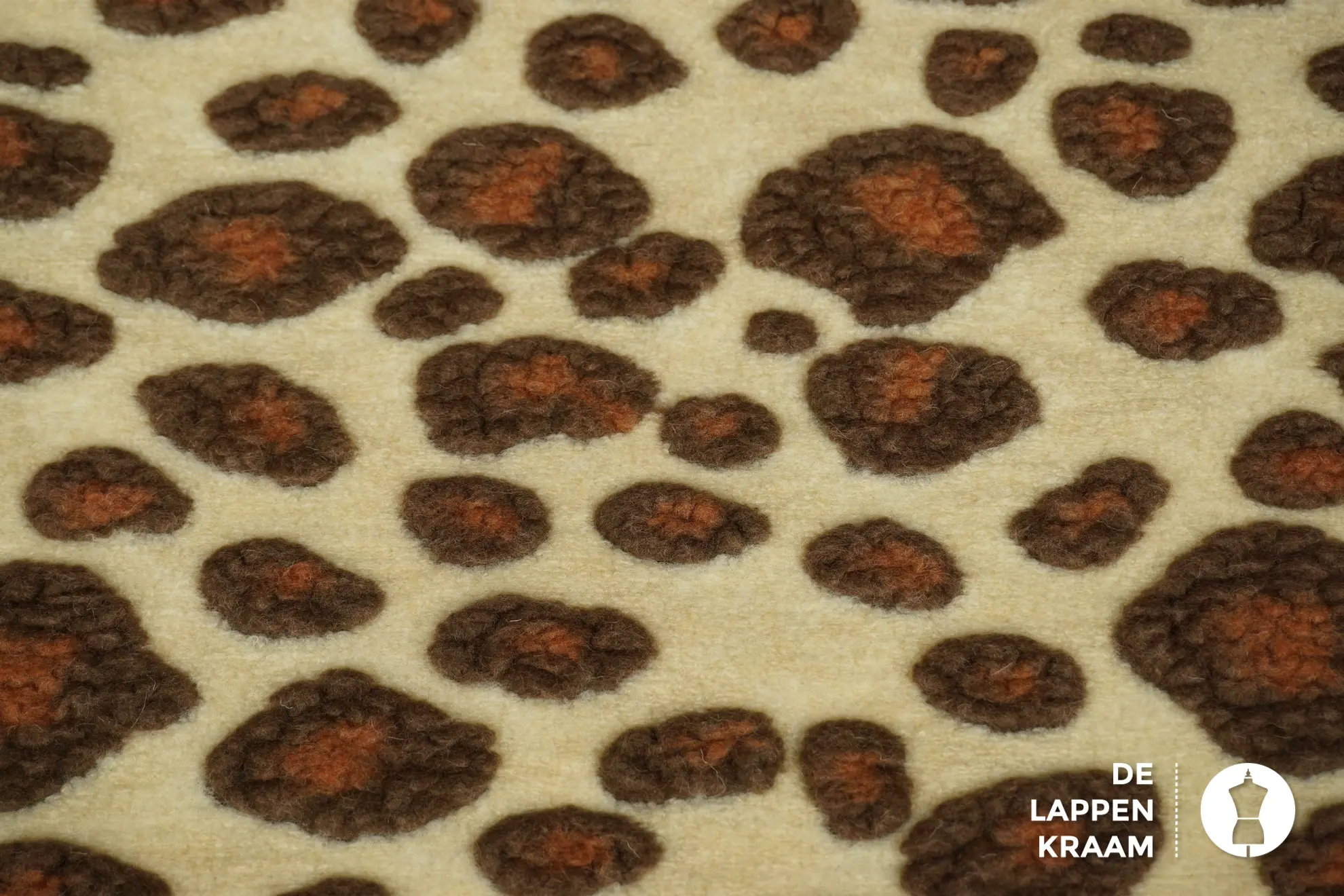Heerlijke gekookte wol in roomwit met een panter patroon die "op" de stof ligt. Het panter patroon is in verschillende bruintinten.  Super tof voor een jas of gilet.... Lees meer