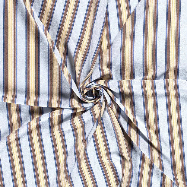 Wij zijn fan van streepjes! Deze crepe heeft een fijne rek en is verticaal gestreept in diverse zachte tintjes als geel, beige en lichtblauw.... Lees meer