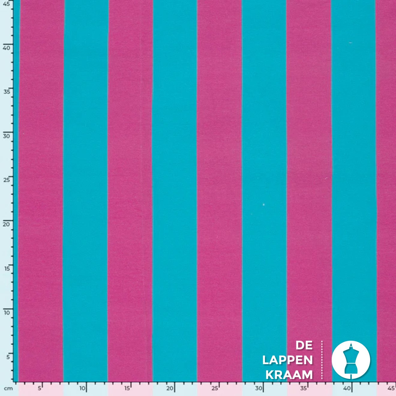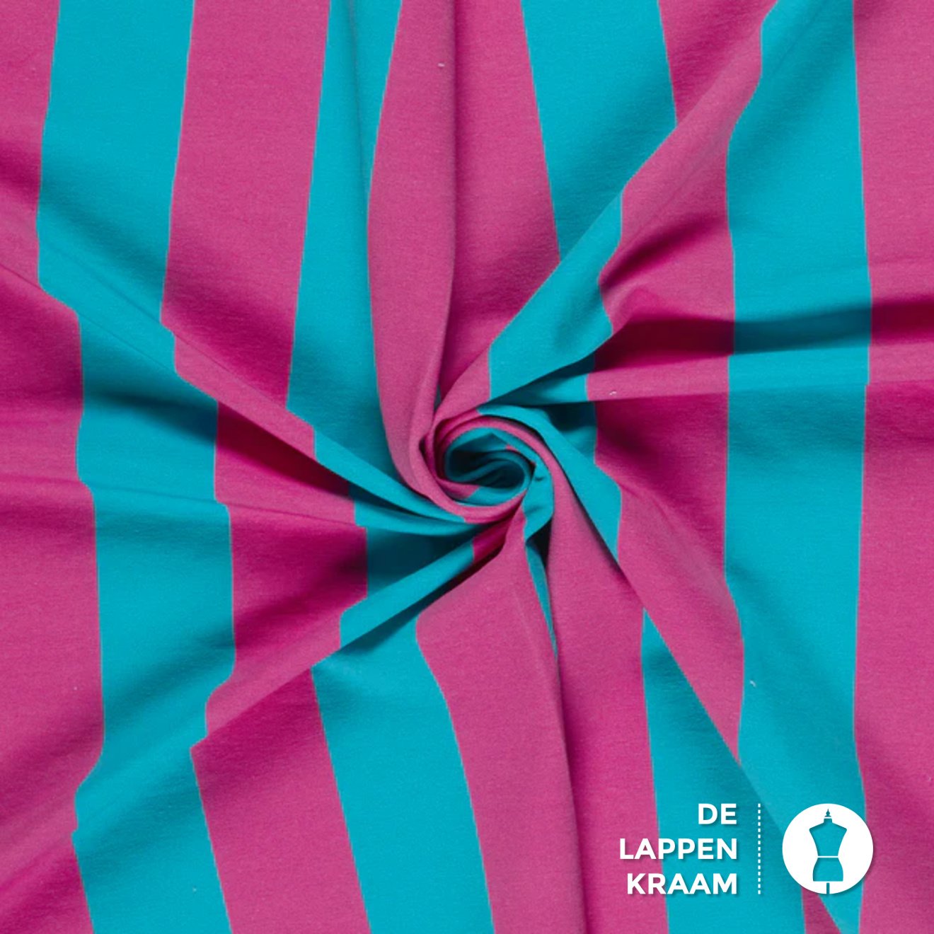 Wij waren op slag verliefd op deze geweldige french terry! Over de lengte van de stof lopen strepen van 5,5cm breed in roze en blauw. De achterkant van de stof heeft de kenmerkende lusjes. Super tof voor zowel kinderen als volwassenen.... Lees meer