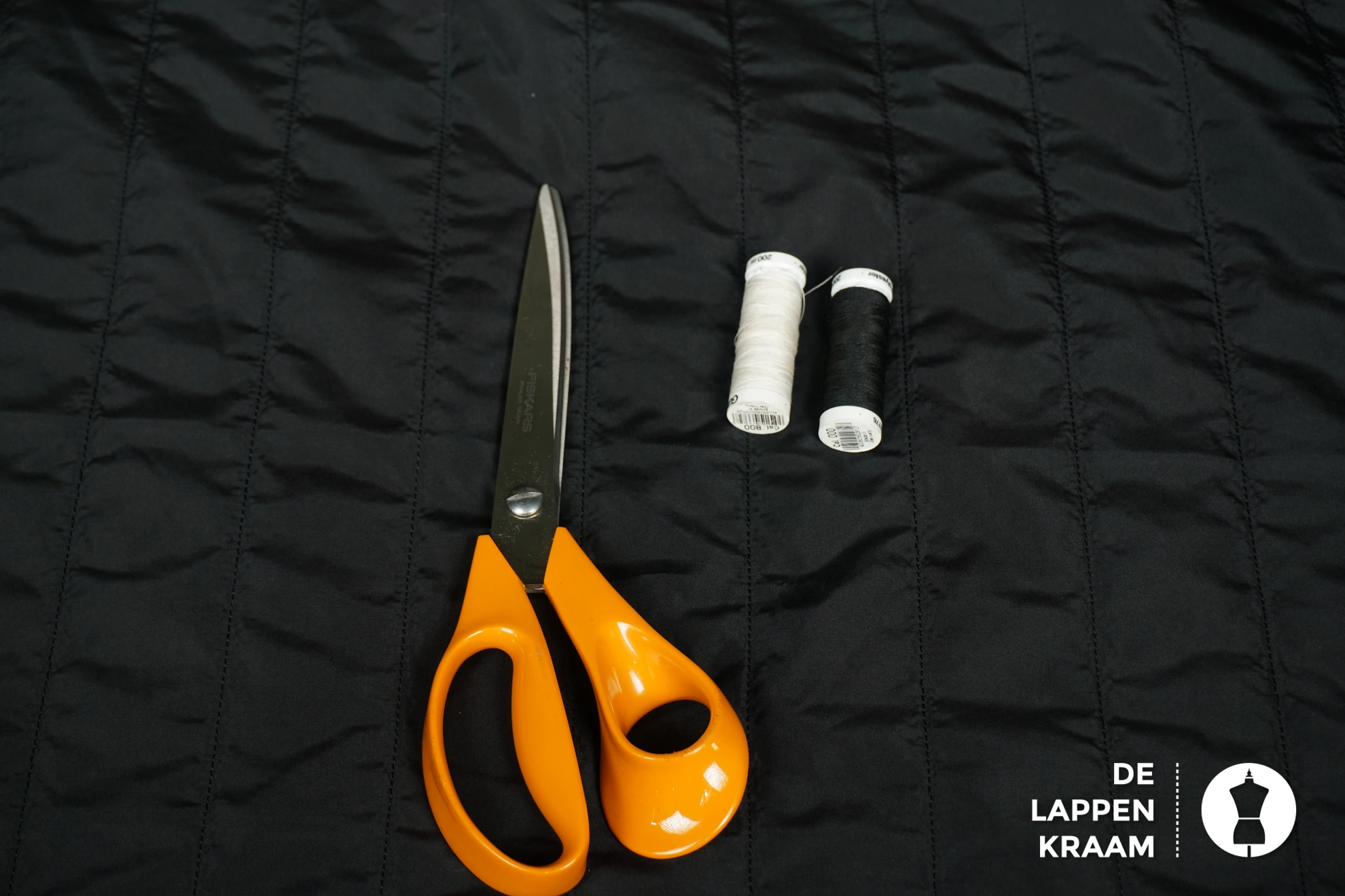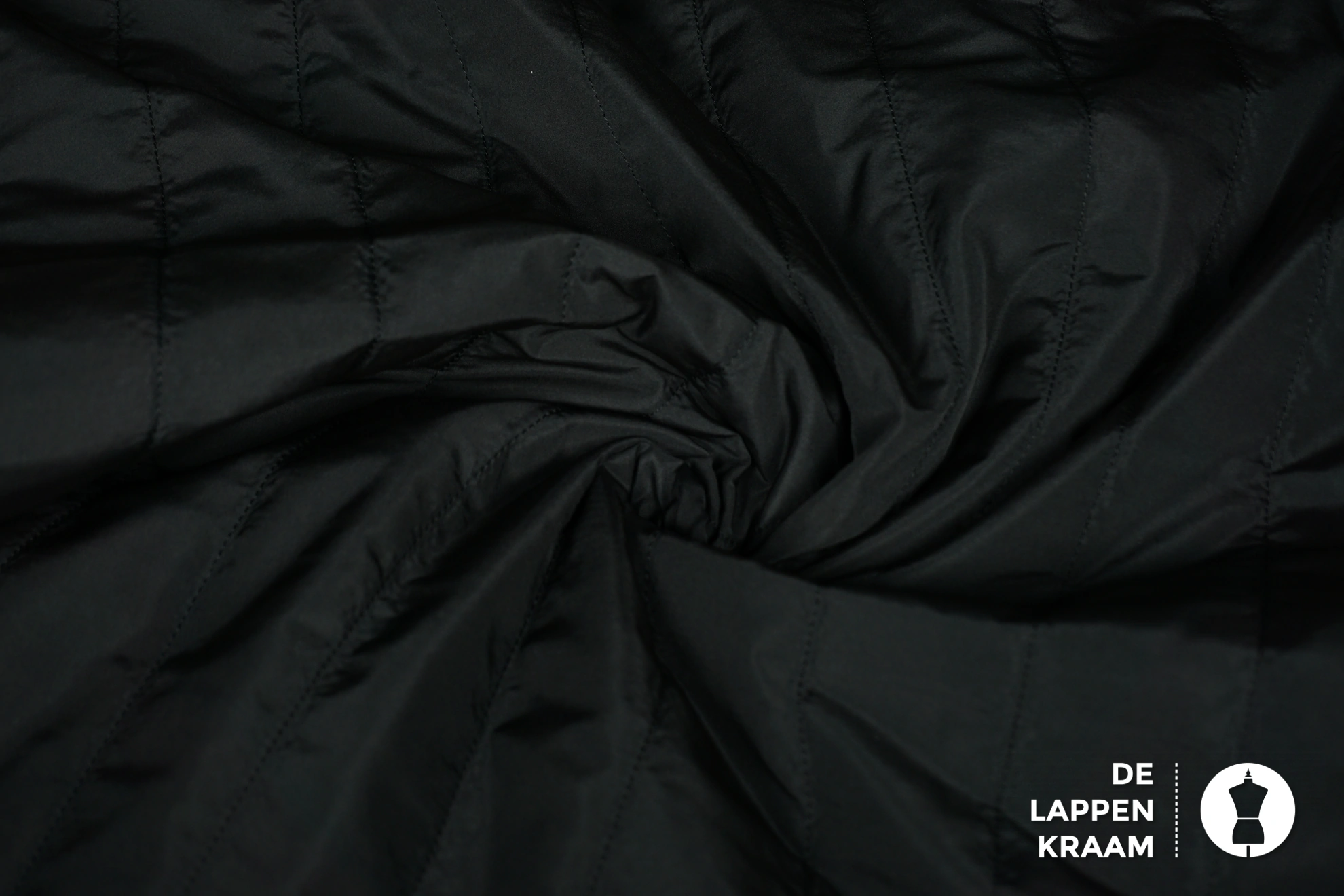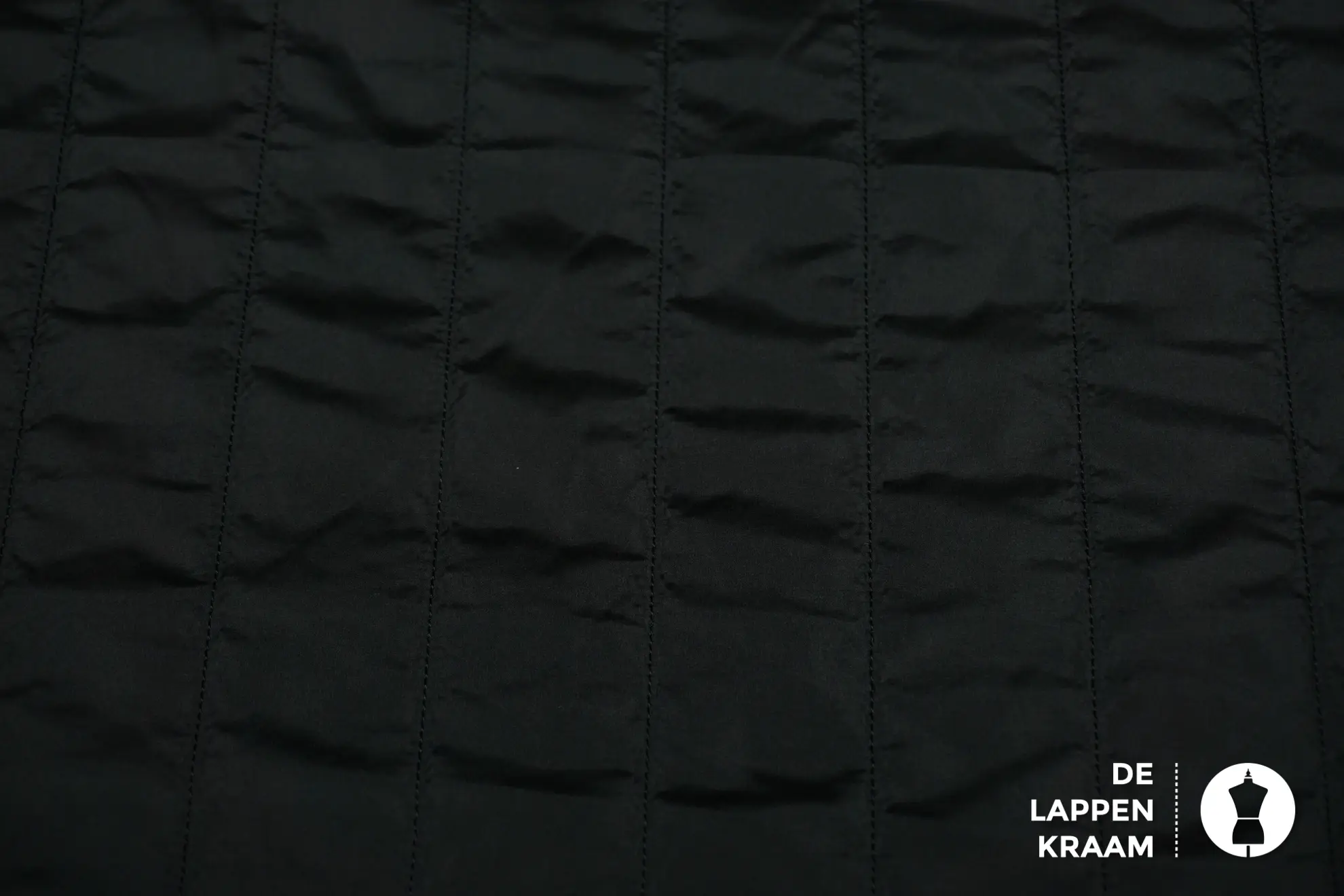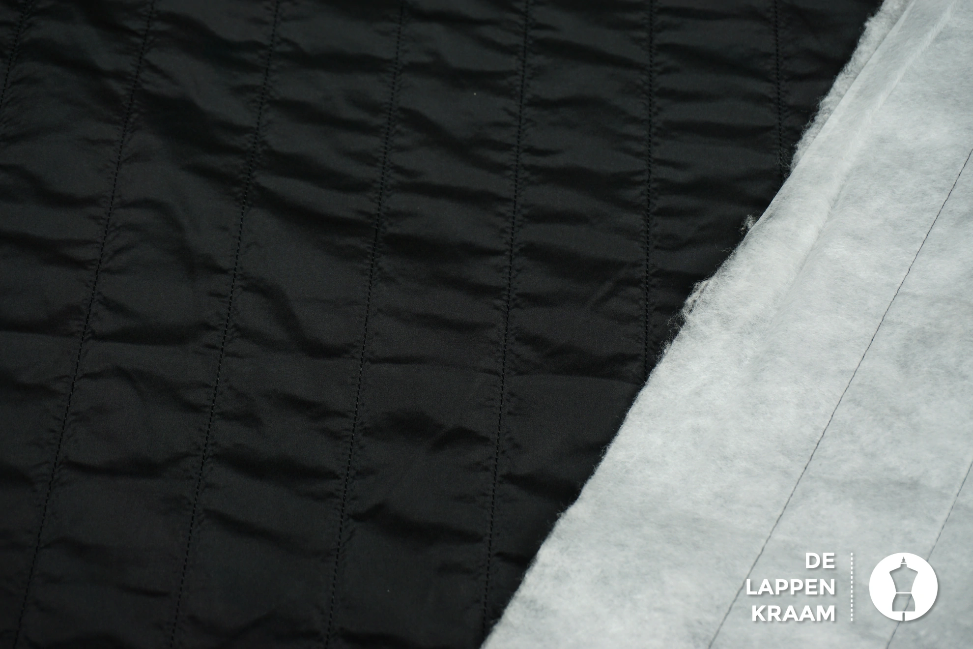Gewatteerde stof die is gestikt in horizontale banen van ongeveer 5cm breed in het zwart. Lees meer