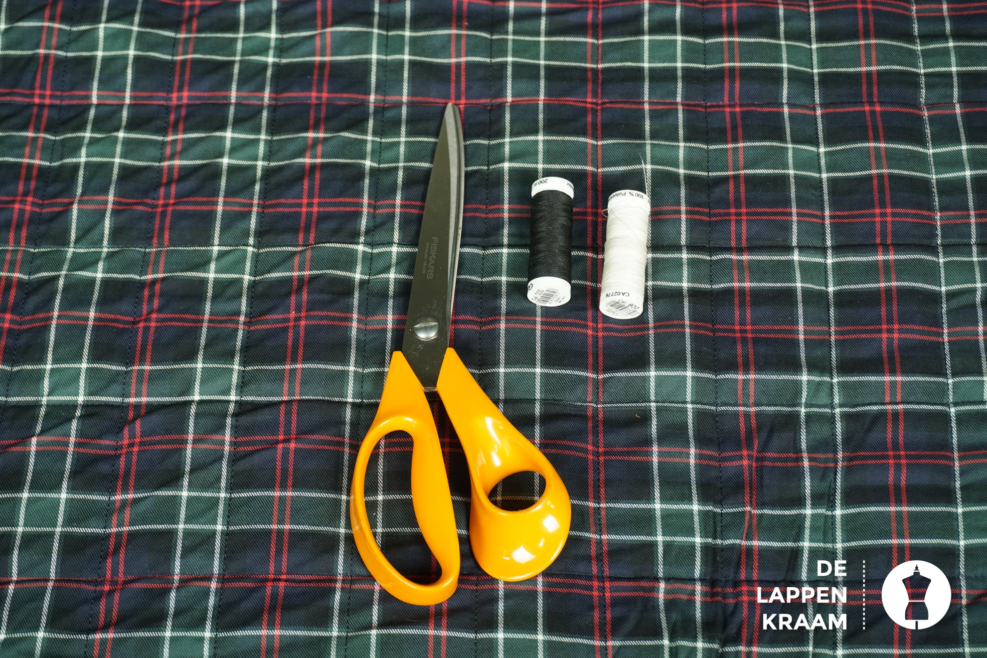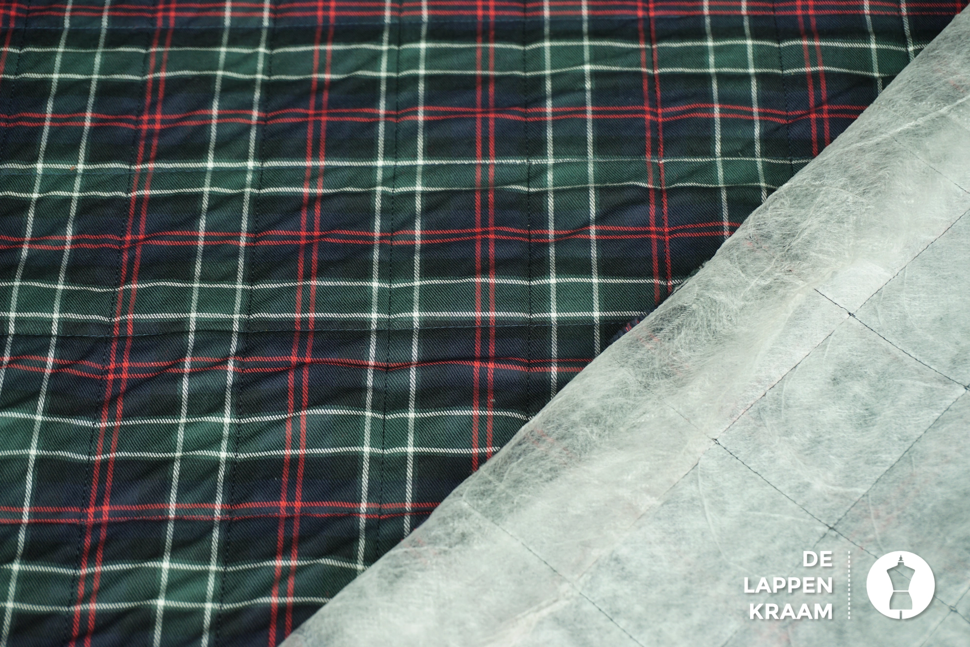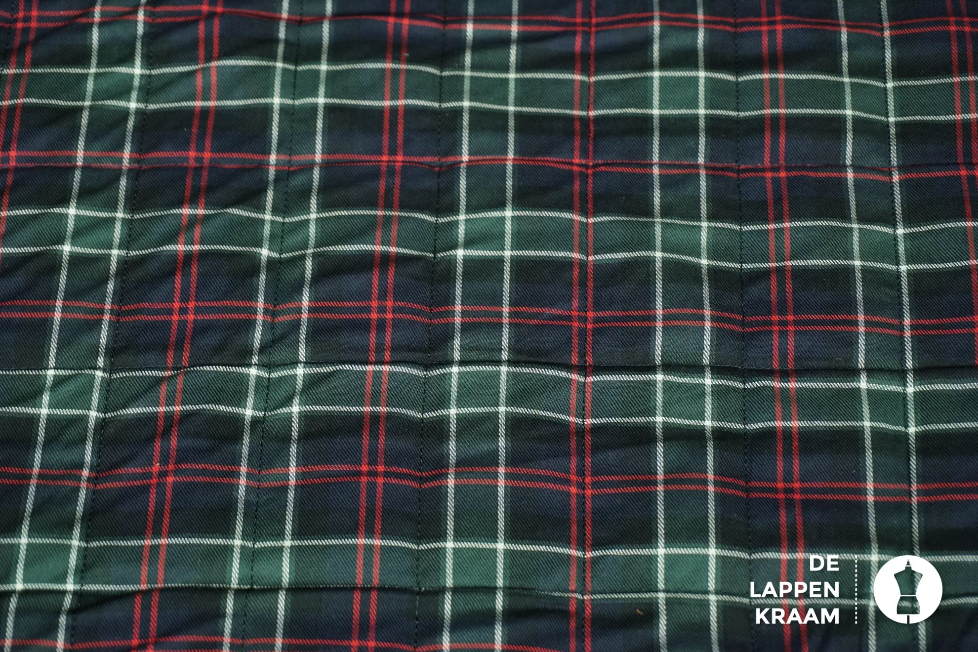 Gewatteerde stof in een Schotse ruit in groen met donkerblauw en rood. De buitenlaag is van katoen in keperbinding met daarachter een laagje wattine gestikt.... Lees meer