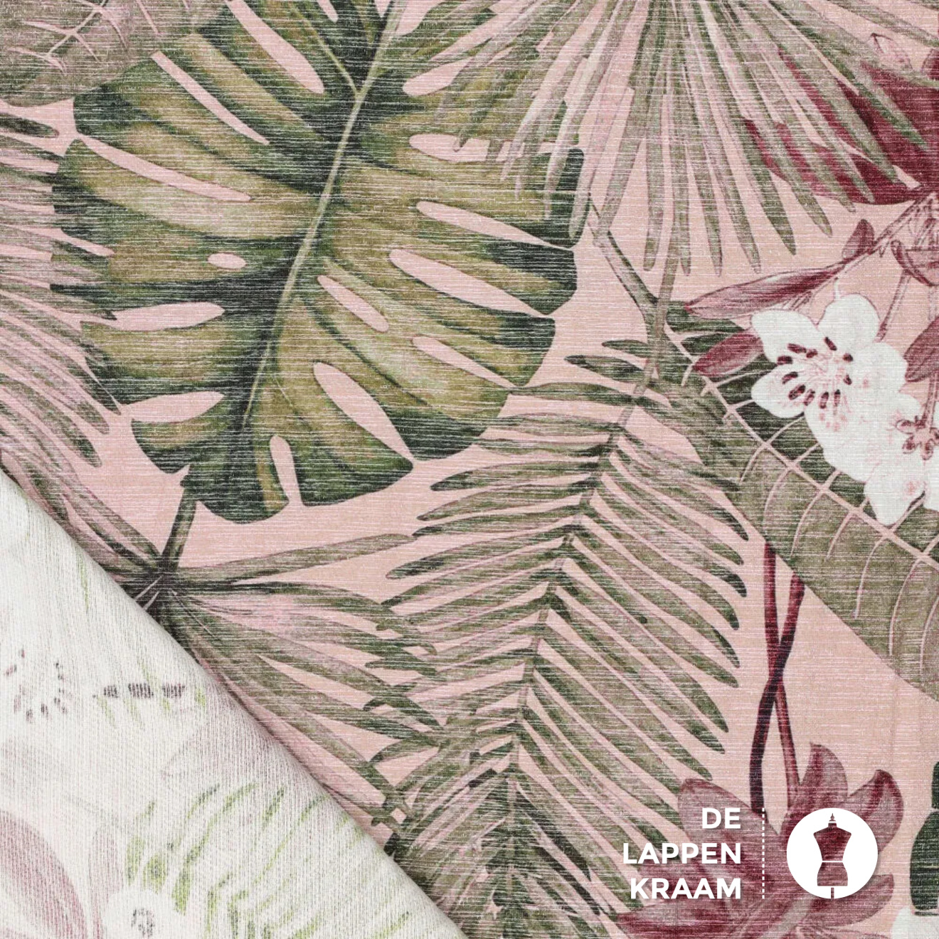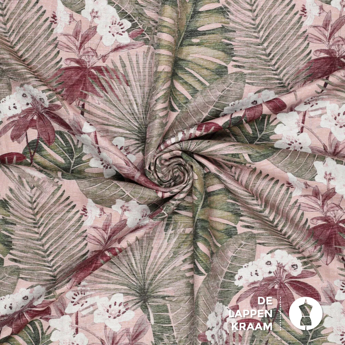 Deze mix van viscose met polyamide heeft een prachtige glans over zich heen. De ondergrond is licht oudroze met een print van junglebladeren in roze, groen en ecru.... Lees meer