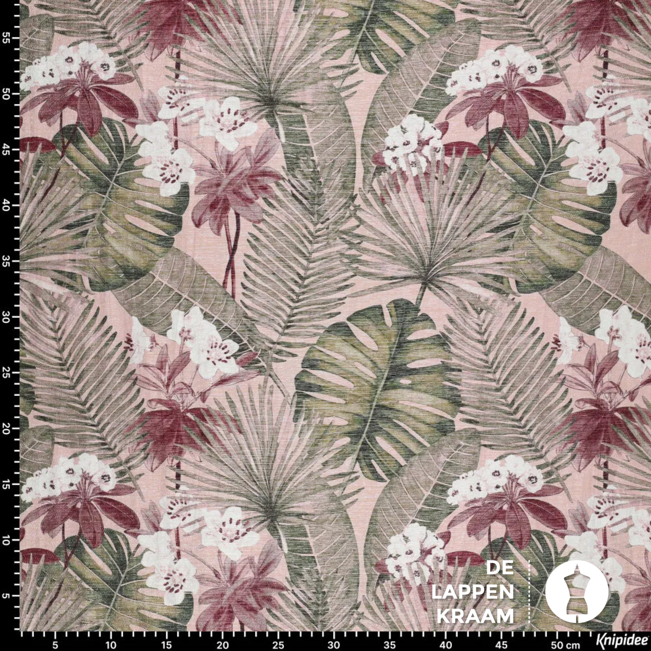 Glans viscose stof oudroze met jungle bladeren