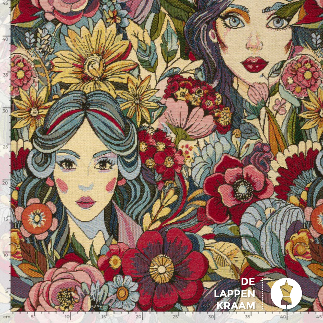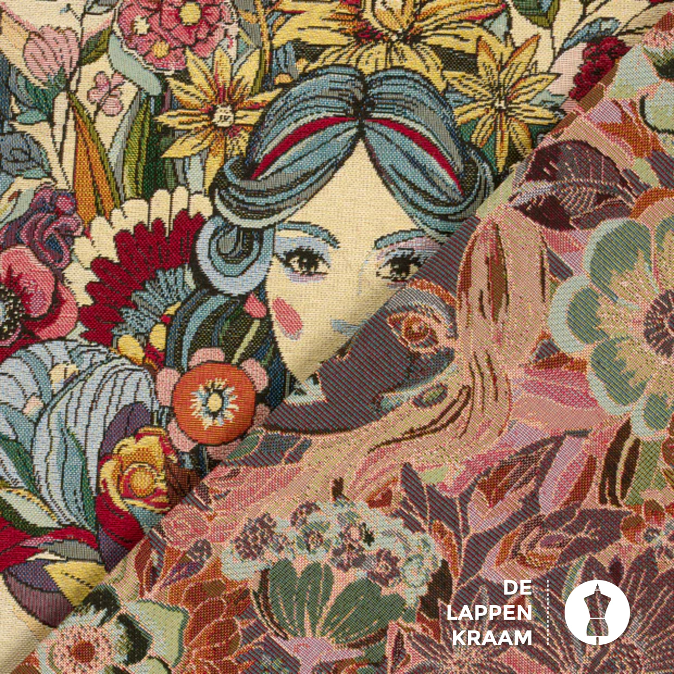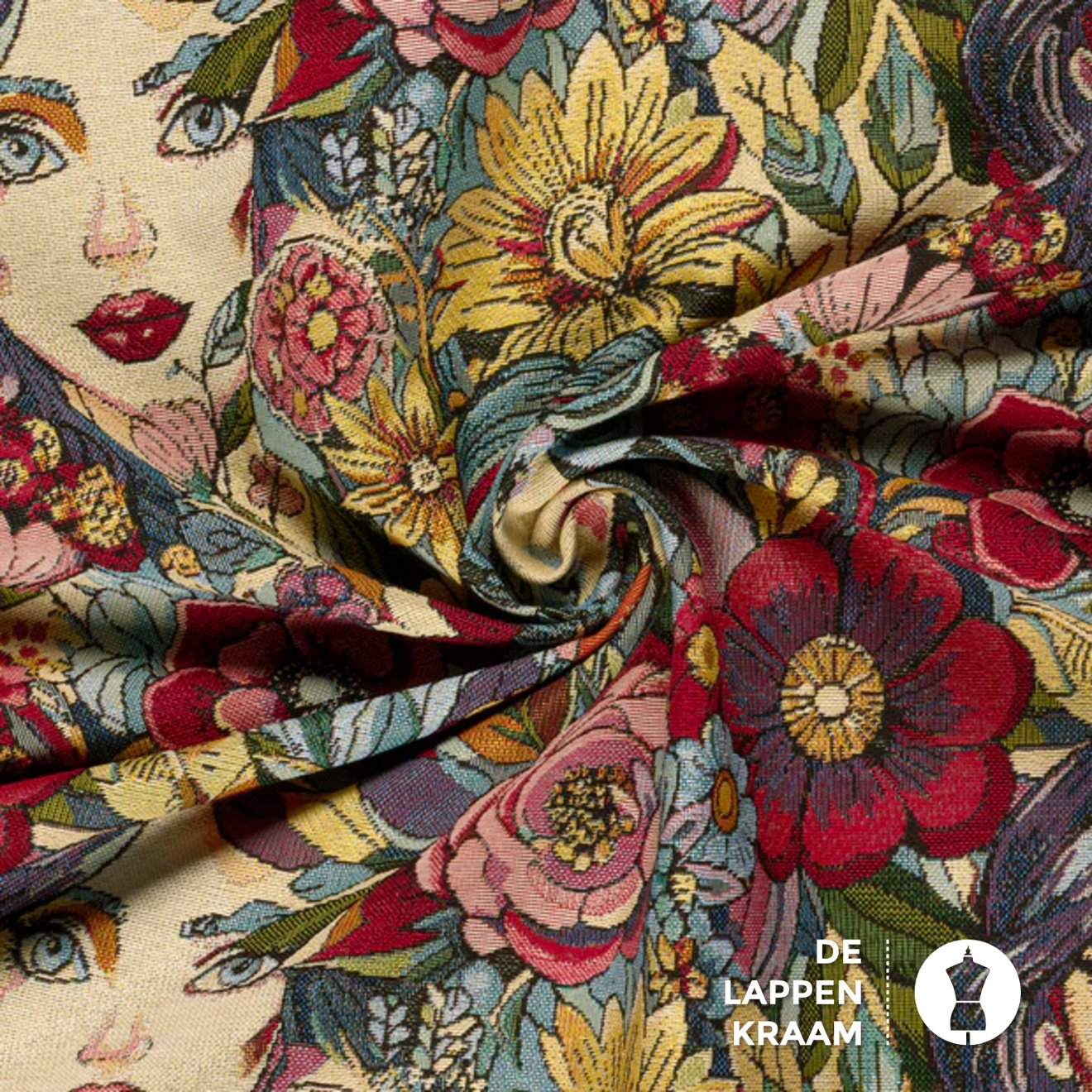 Wat een prachtige eyecatcher is dit. Een geweven gobelin in een dessin van kleurrijke bloemen en gezichten van vrouwen. Heel tof voor een bomberjack of voor bijvoorbeeld een tas.... Lees meer