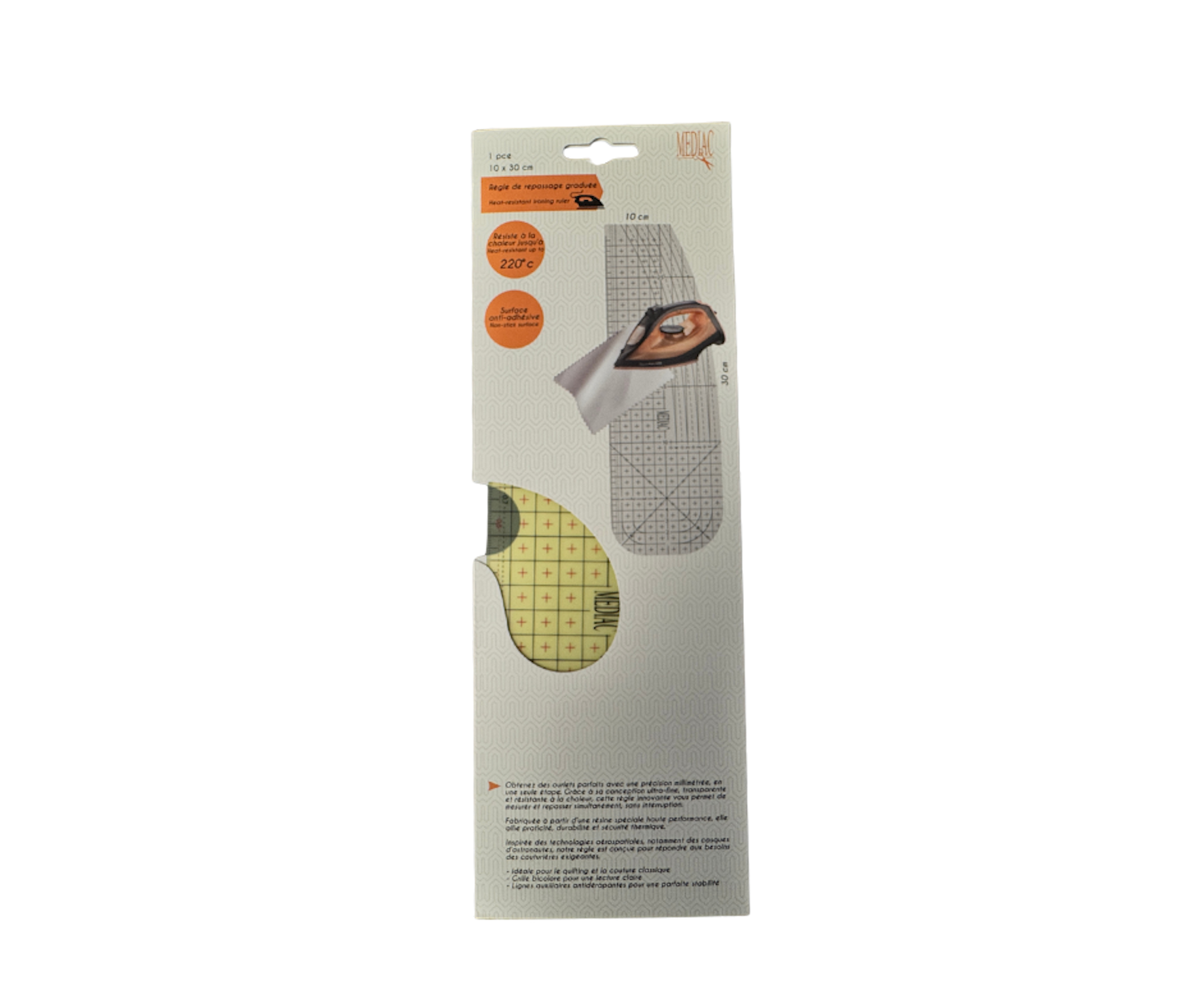 De liniaal is gemaakt van transparant kunststof en is bestand tegen strijken op hoge temperatuur tot 220°