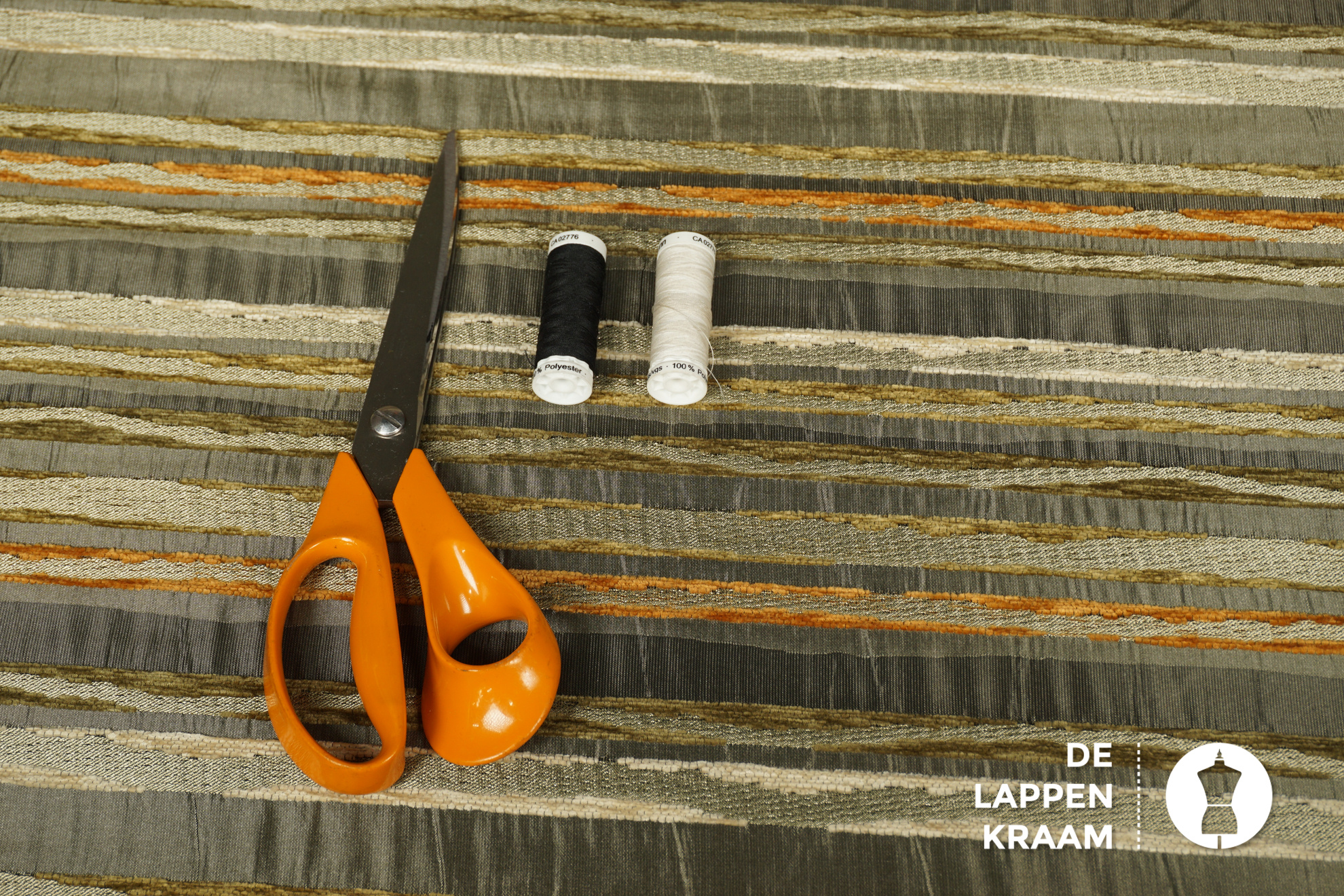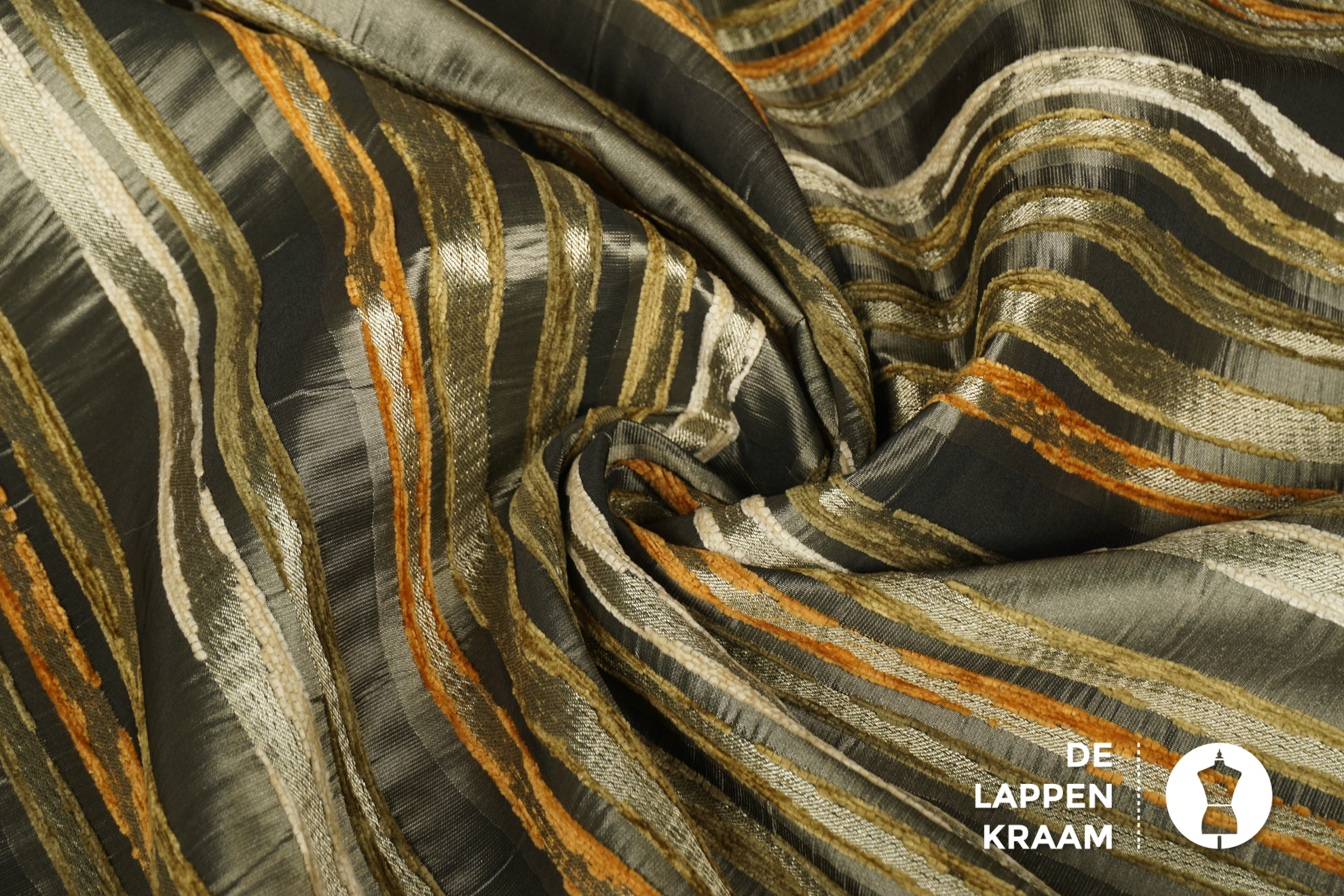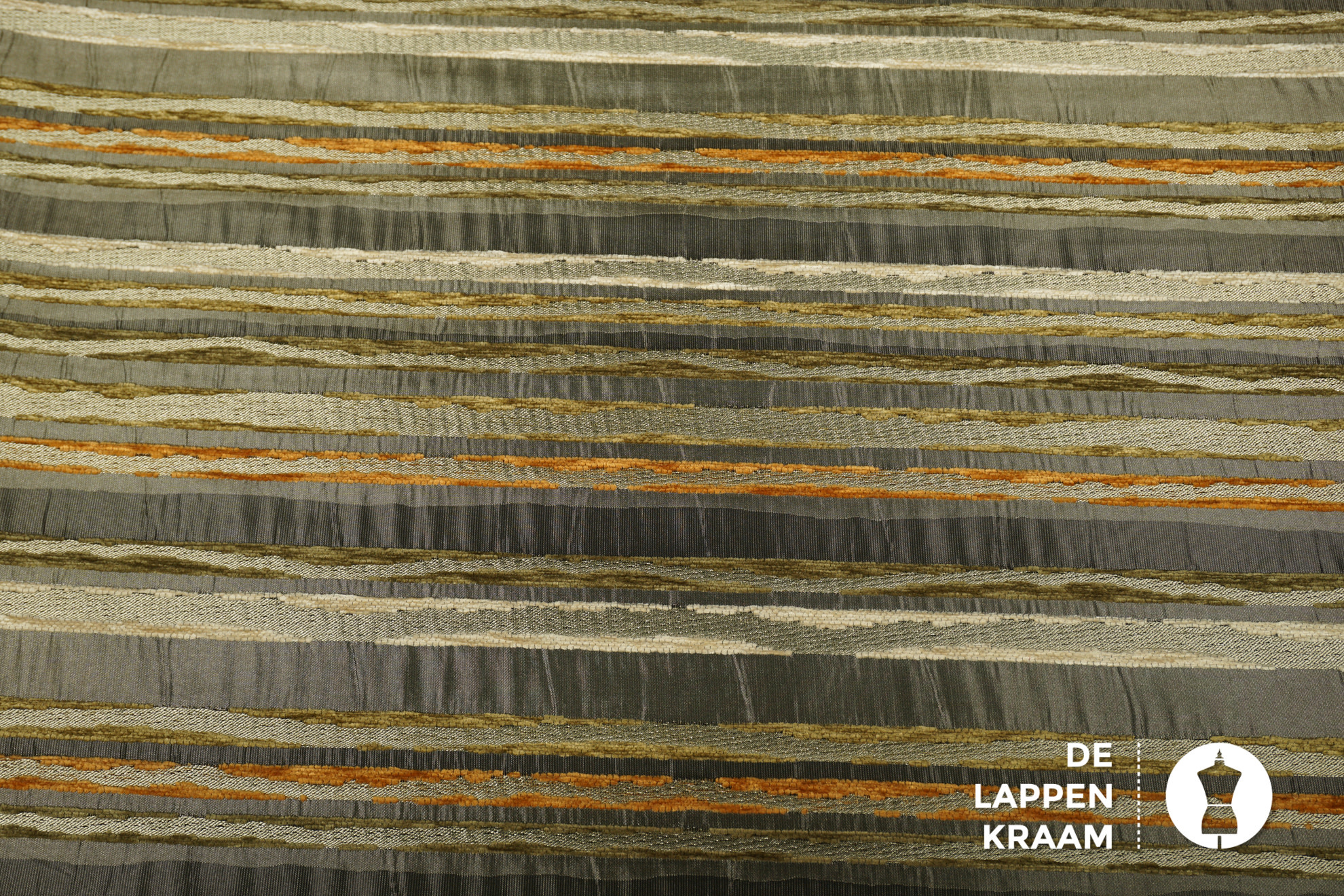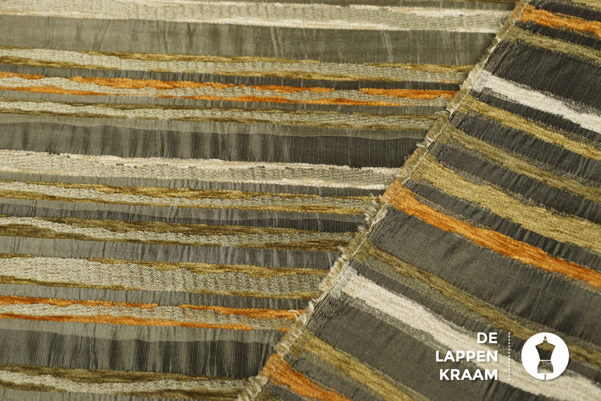 Jacquard taft met horizontale chenillebanen in beige, camel en lichtgroen. De legergroene, glanzende ondergrond en de variatie in wevingen zorgt voor subtiele verschillen in glans.... Lees meer