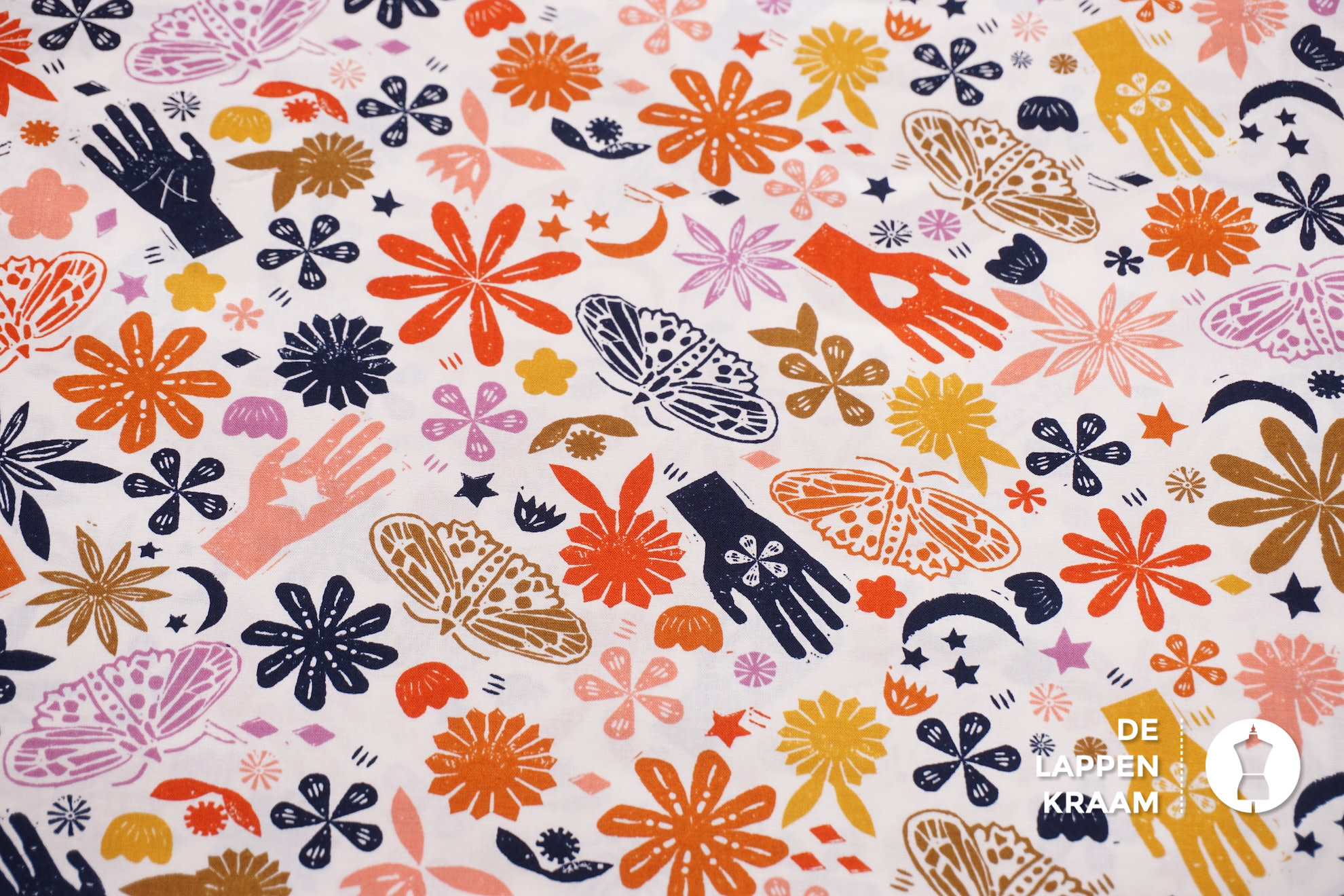Japans quiltkatoen in wit met een vrolijk printje van bloemen, vlinders, handen en maantjes in kleuren als oranje, geel, donkerblauw en camel... Lees meer