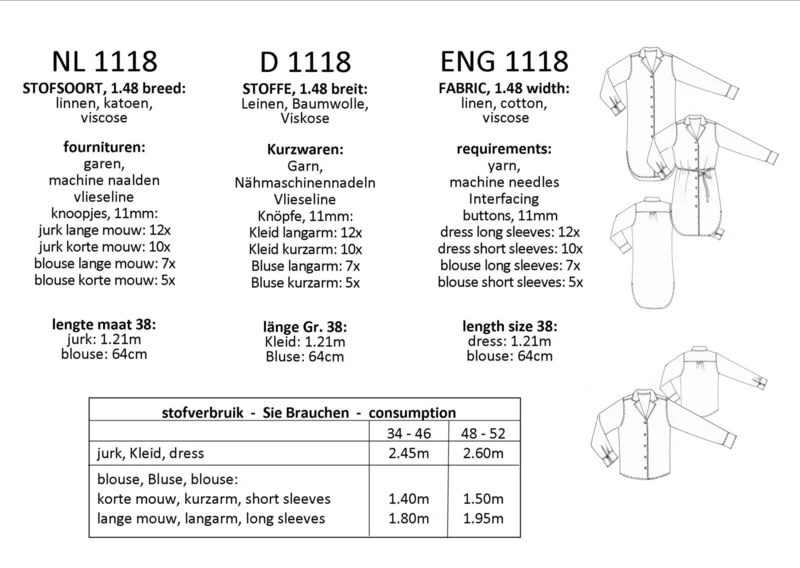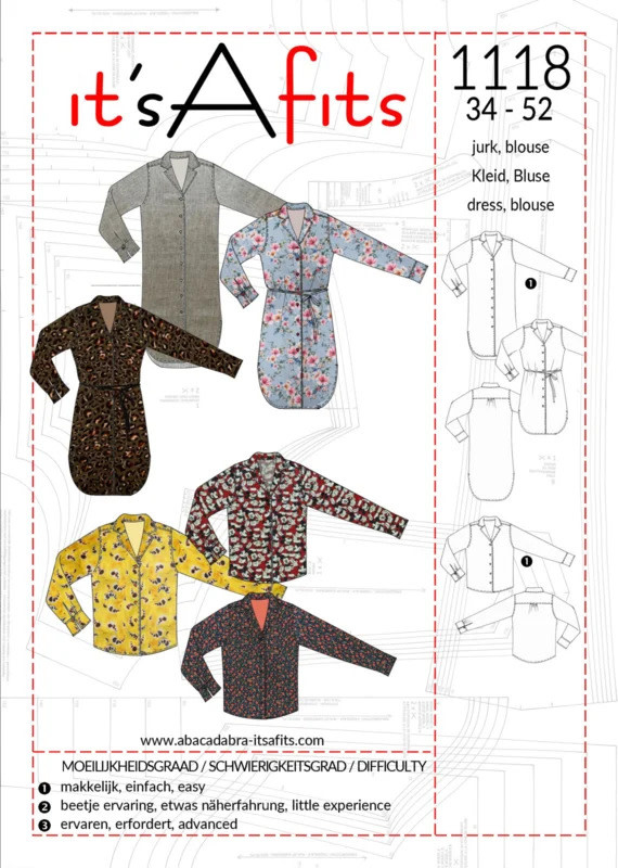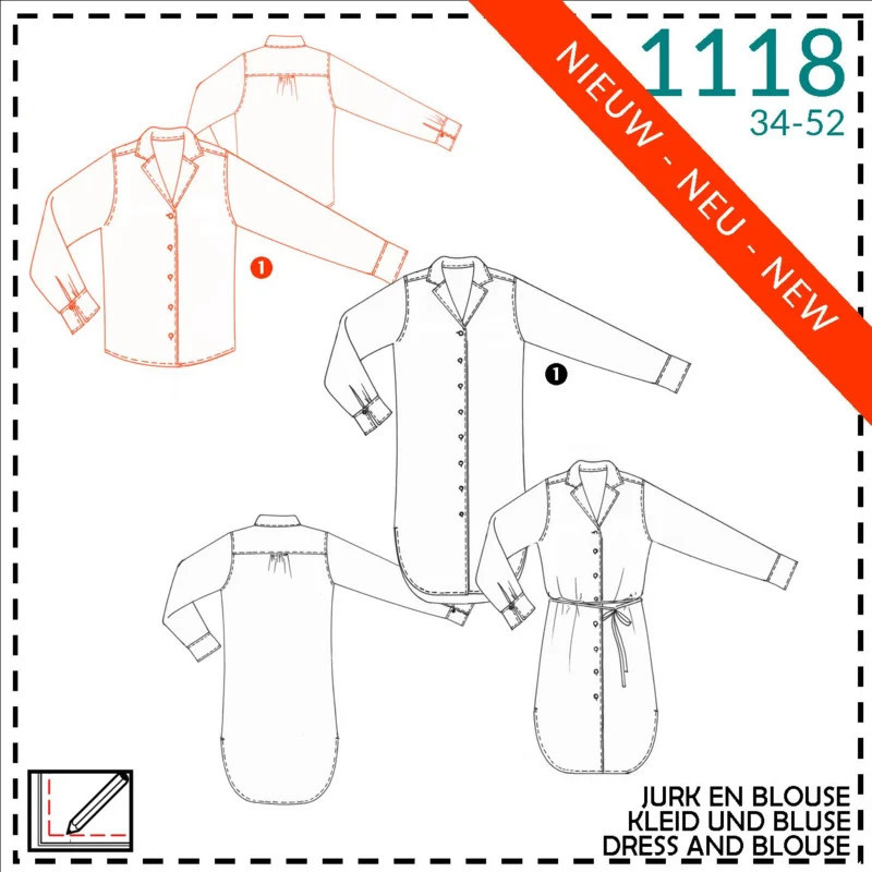 Damespatroon voor een jurk/blouse in een losvallend model met een reverskraag, lange mouwen met manchet en rondlopende zomen.
