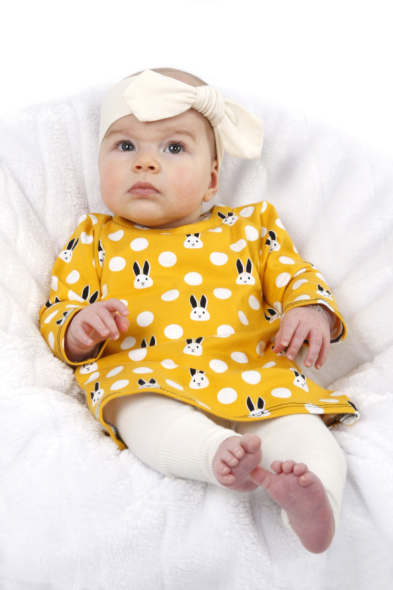 Naaipatroon jurkje met lange mouw, inclusief duidelijke werkbeschrijving. Dit jurkje met lange mouwen maak je uit katoen, gebreide- of tricotstof. Aan de achterkant kun je het sluiten met een haakje, knoopje of ritsje zodat het makkelijk over baby’s hoofdje past.