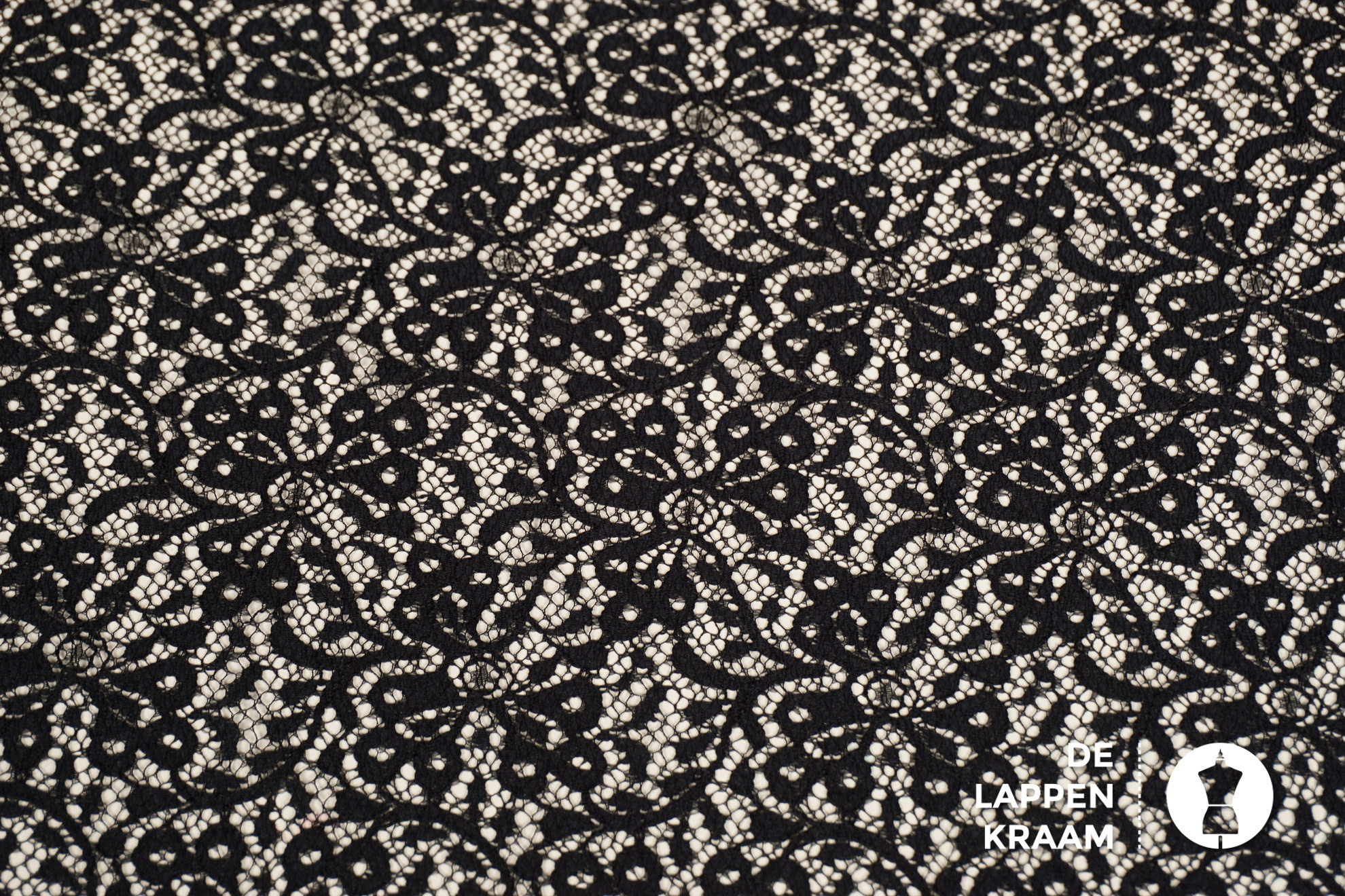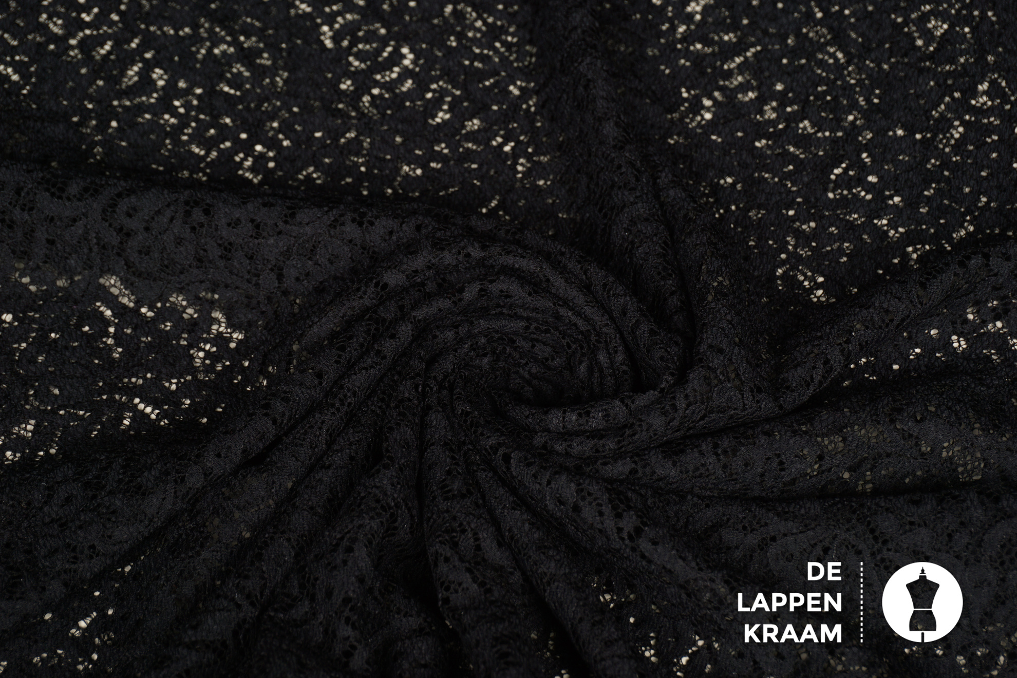 Gebloemd kant in het zwart, met een stretch in de breedte van de stof. Lees meer