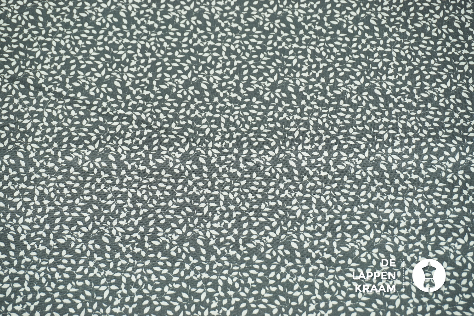 100% katoenen stof in grijs met witte blaadjes. Lees meer