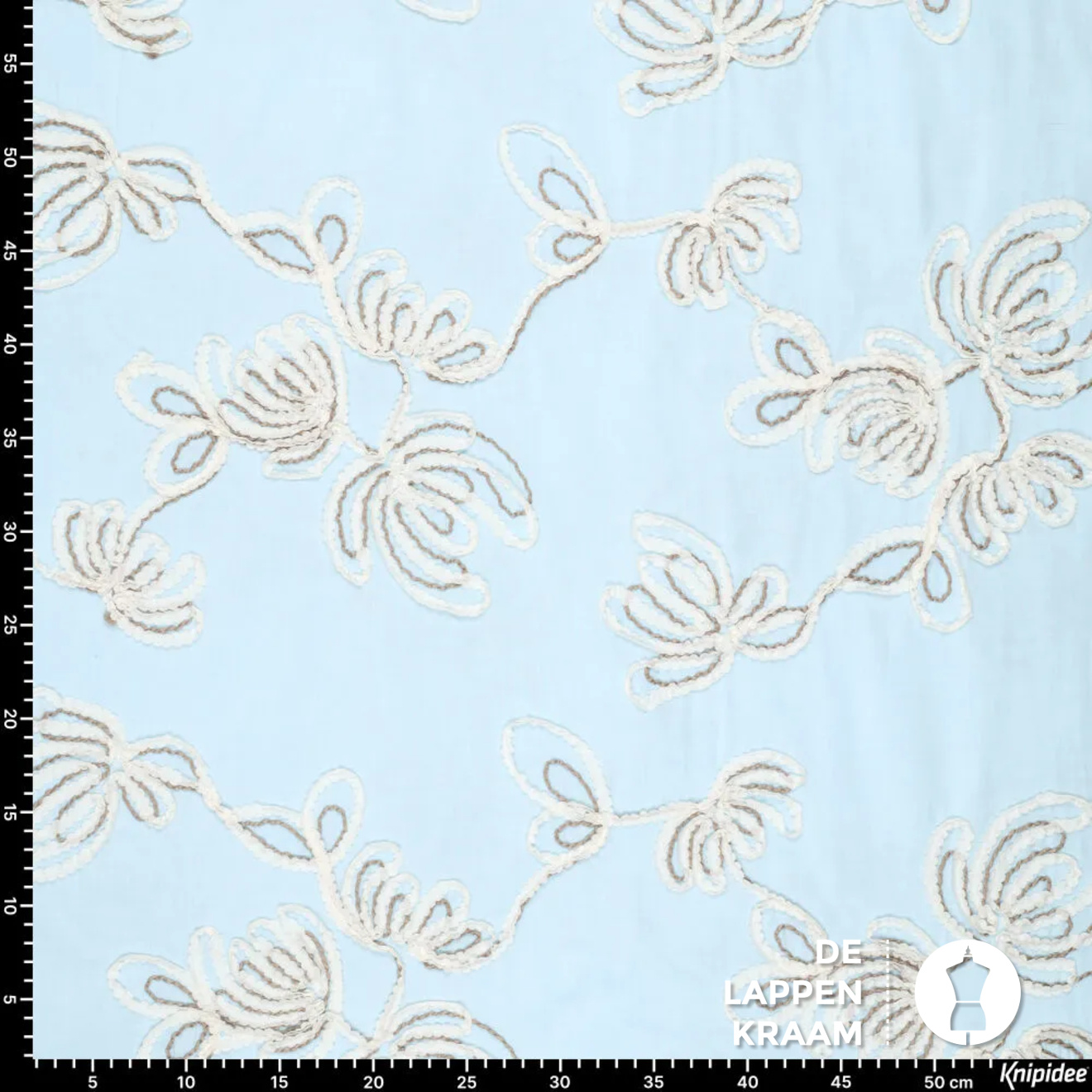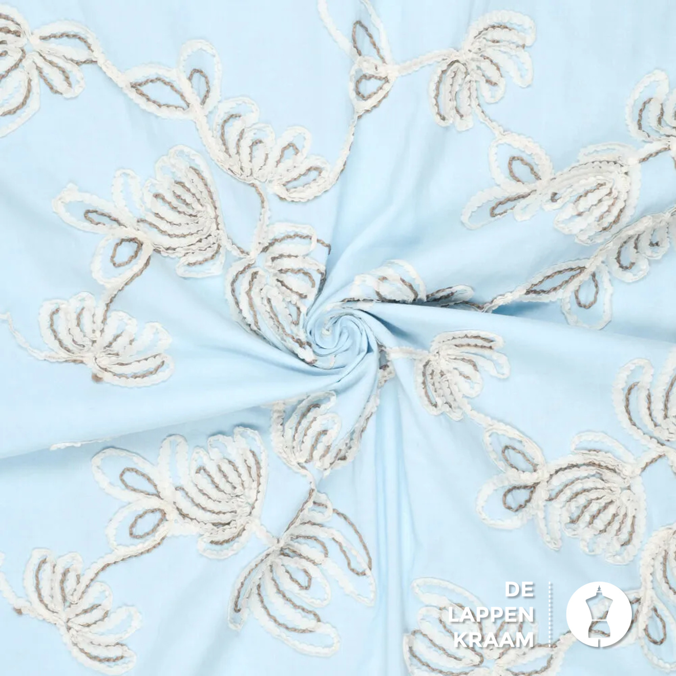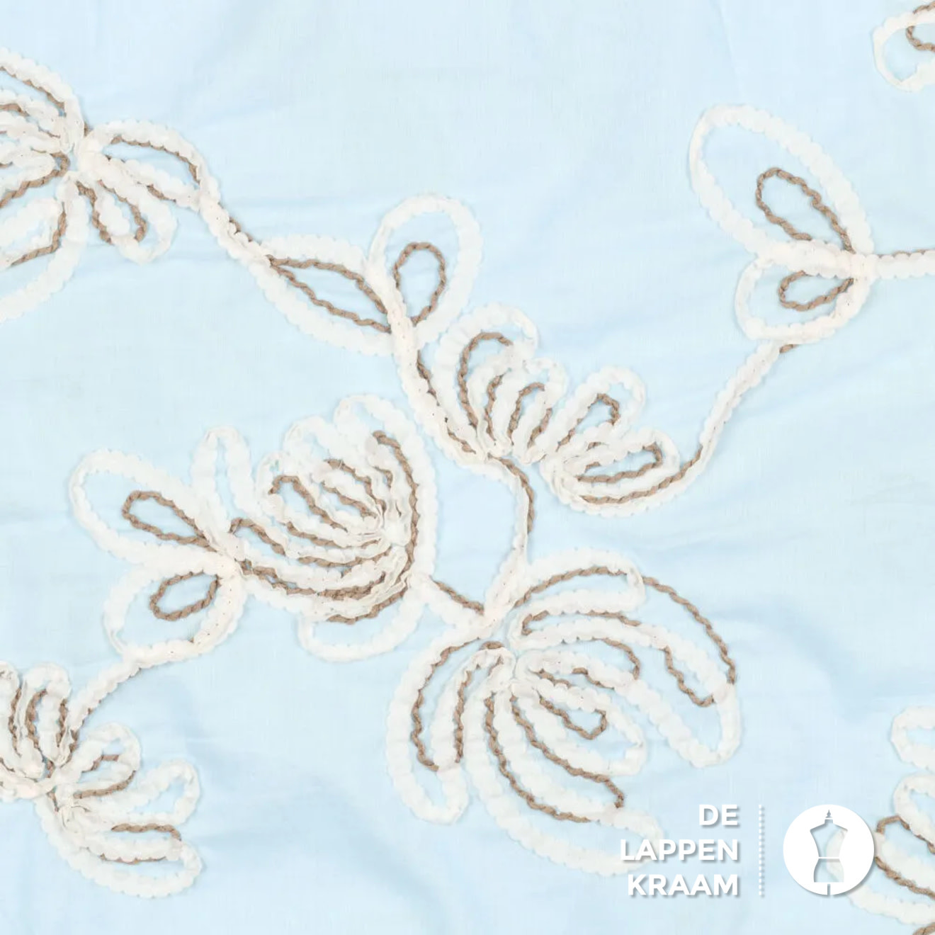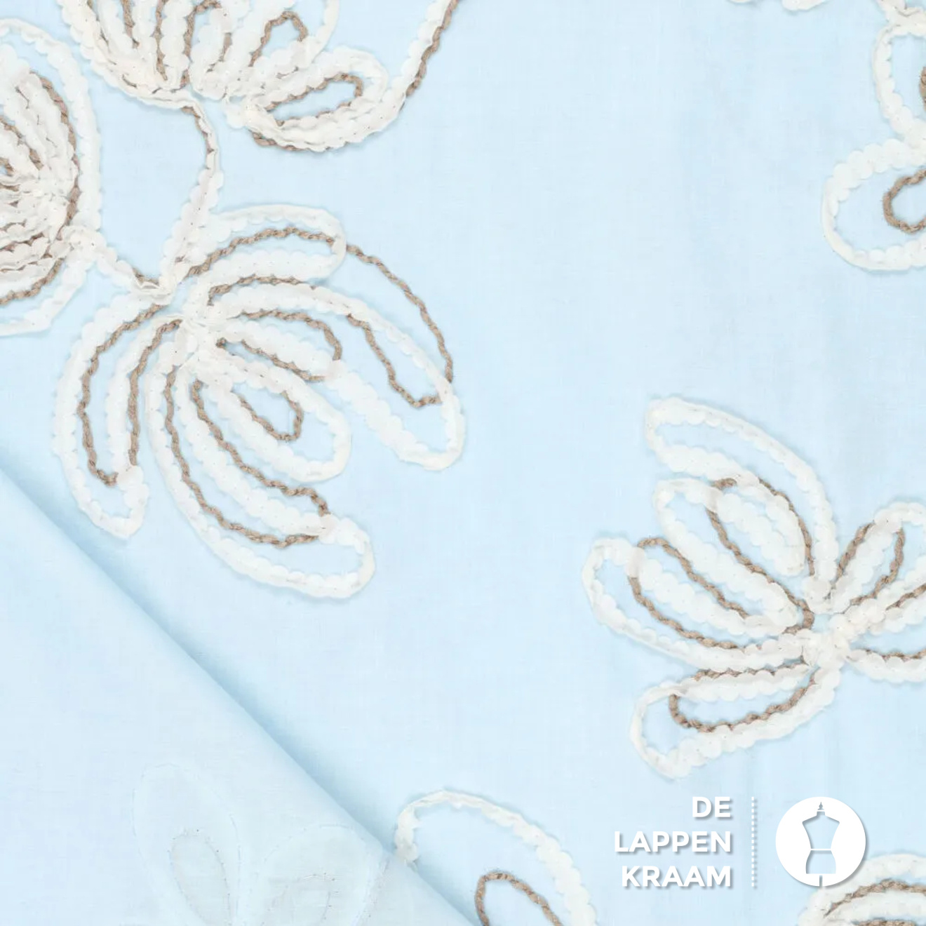 Hele toffe katoen in lichtblauw, met een geborduurd dessin van bloemen in ecru met bruin. Lees meer