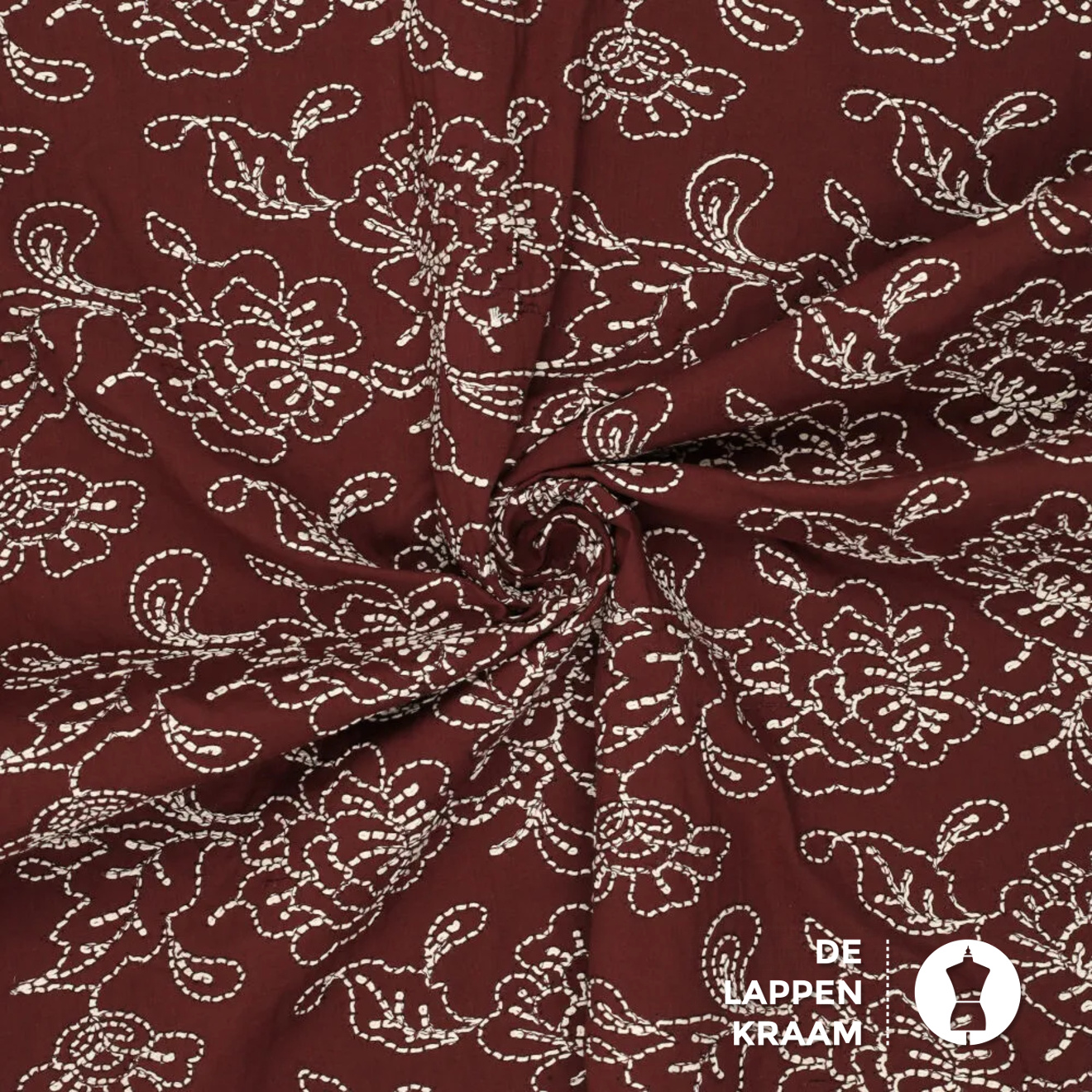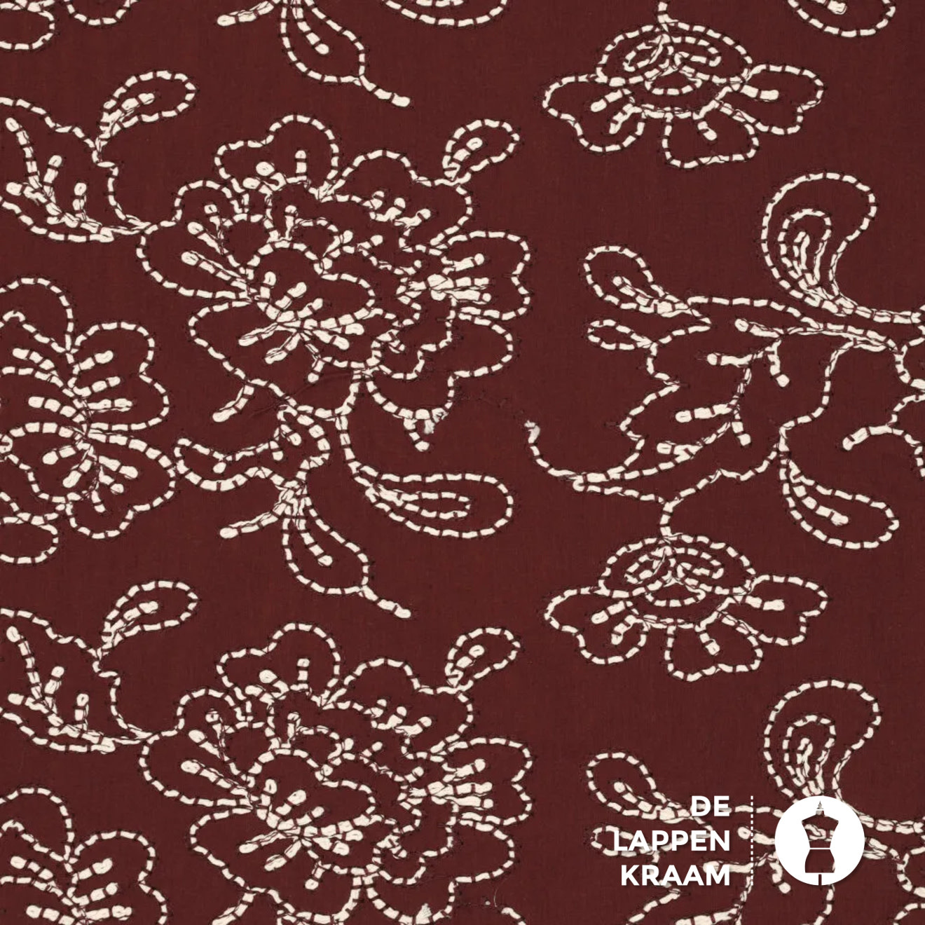 Hele mooie geweven katoen in bordeauxrood met een mooie geborduurd dessin van grote bloemen in het wit. Heel mooi voor bijvoorbeeld een blouse of jurk.... Lees meer