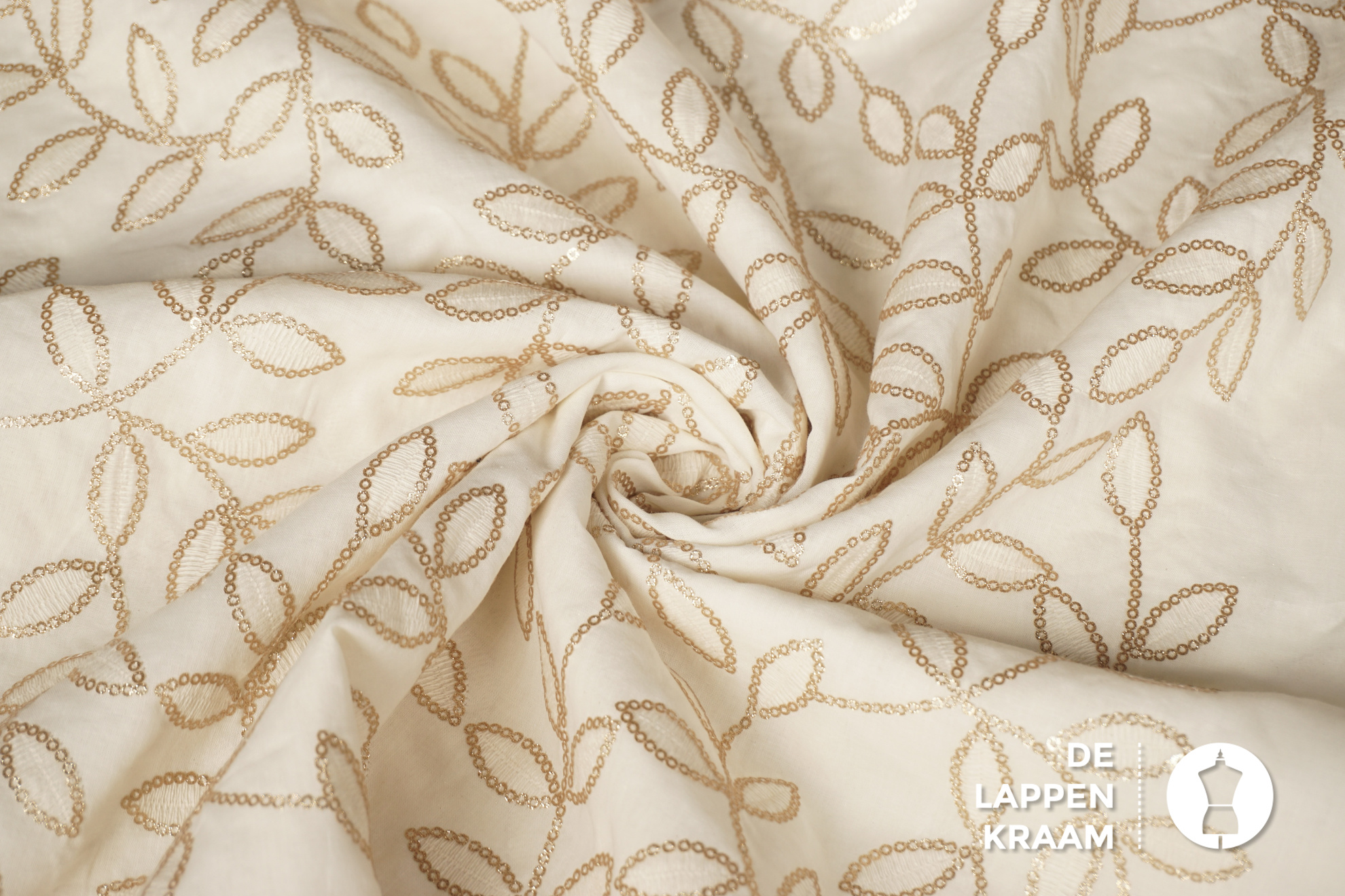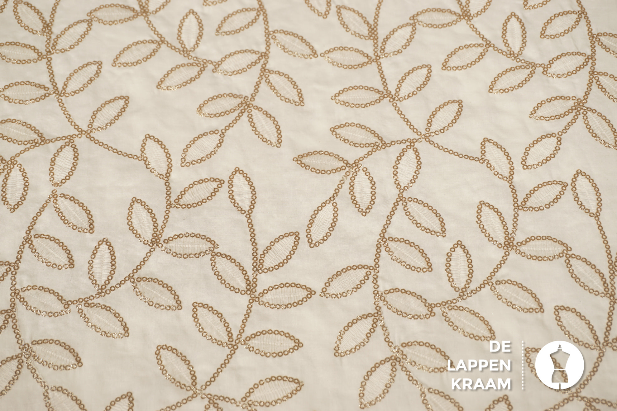 Katoenen voile stof ecru met goud borduursel in bladvormen