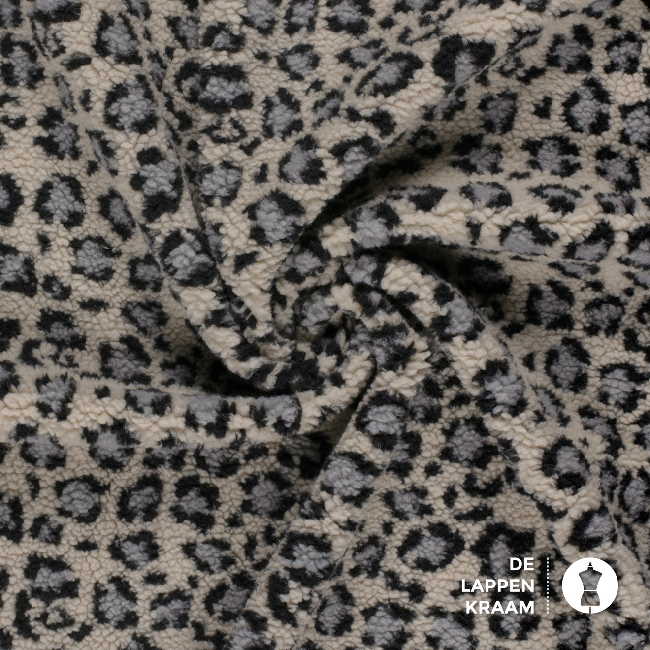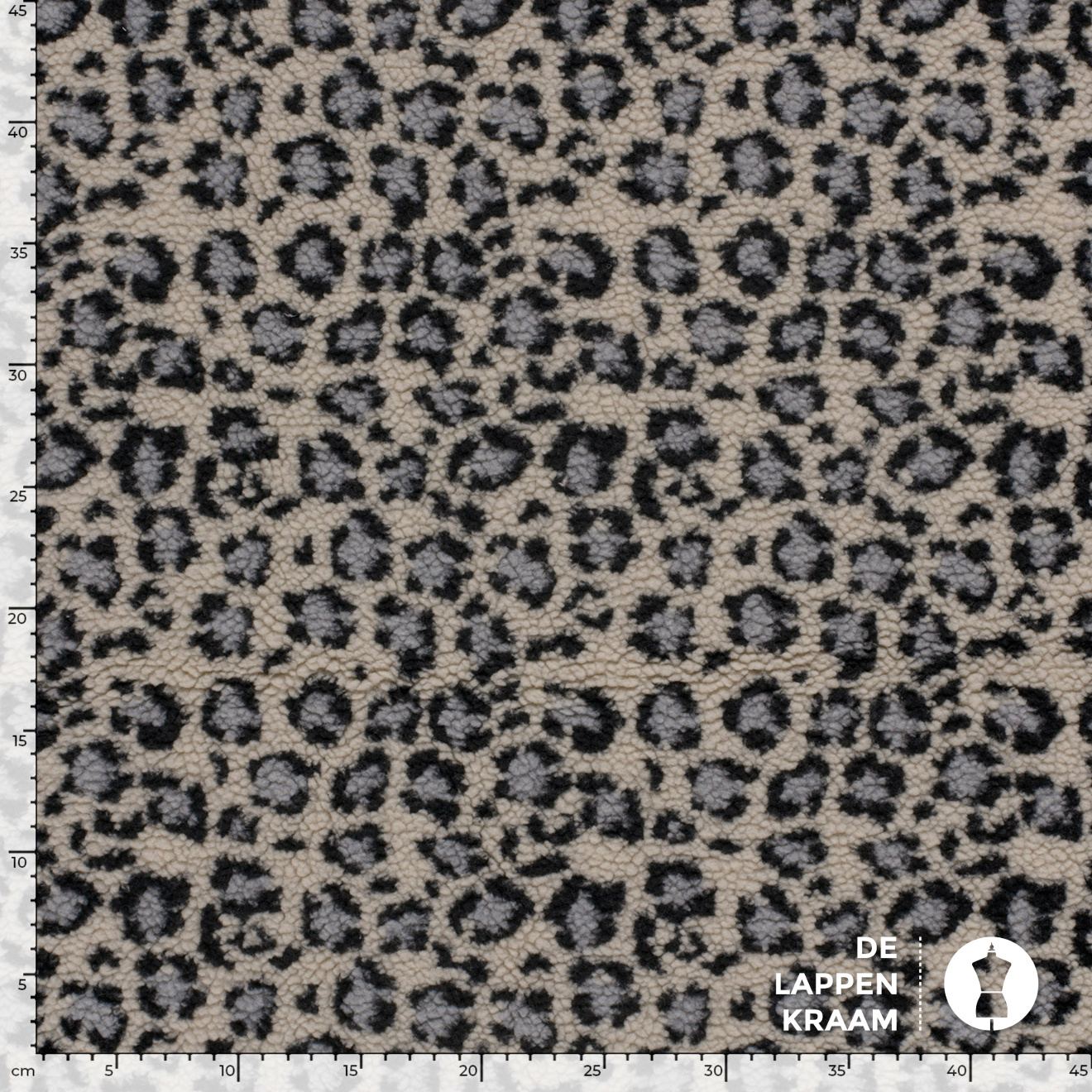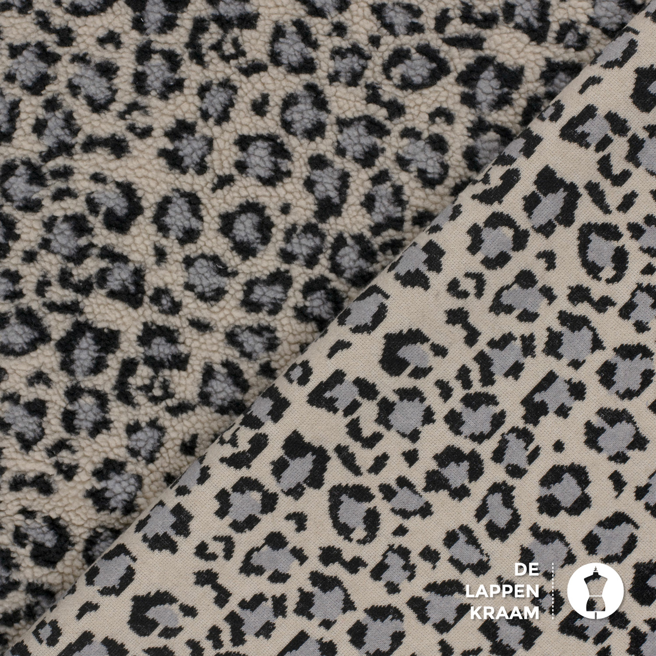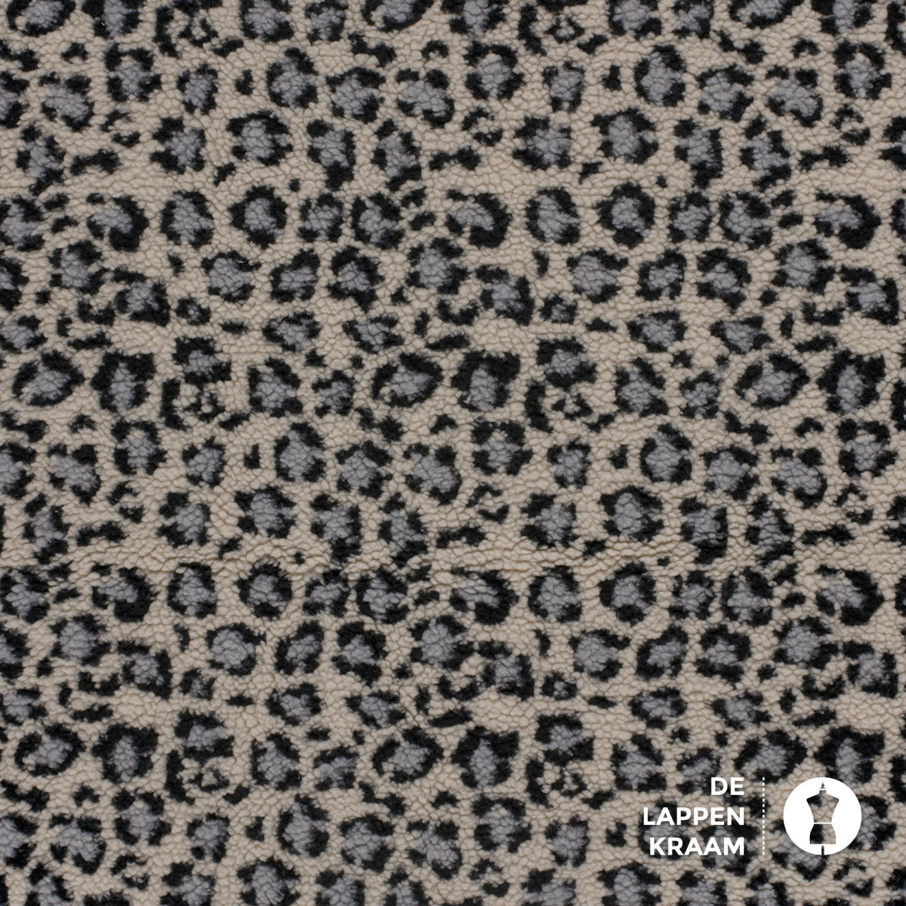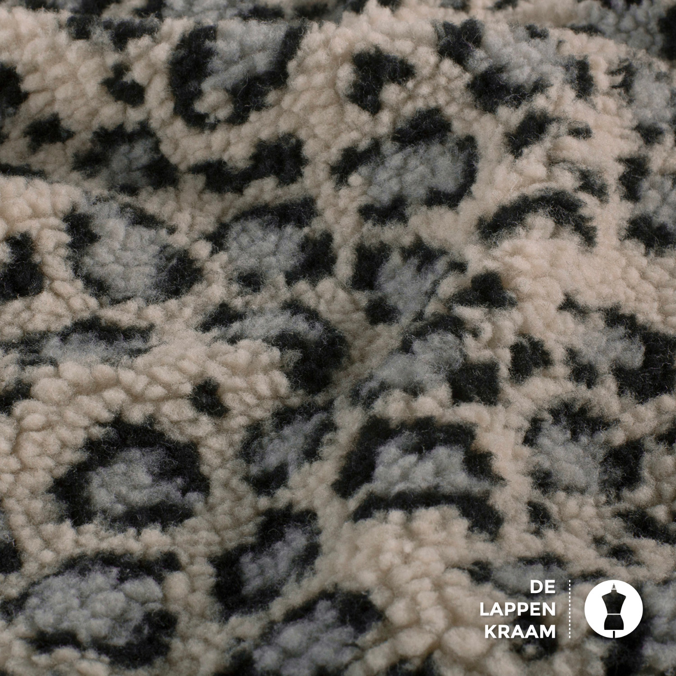 Kortgeschoren Teddy stof in ecru met grijs en blauw