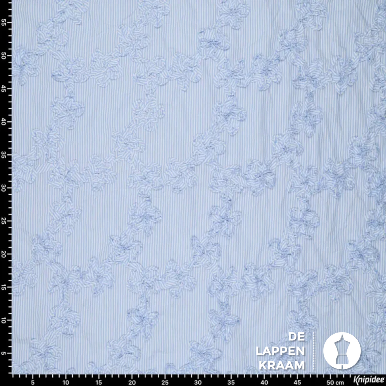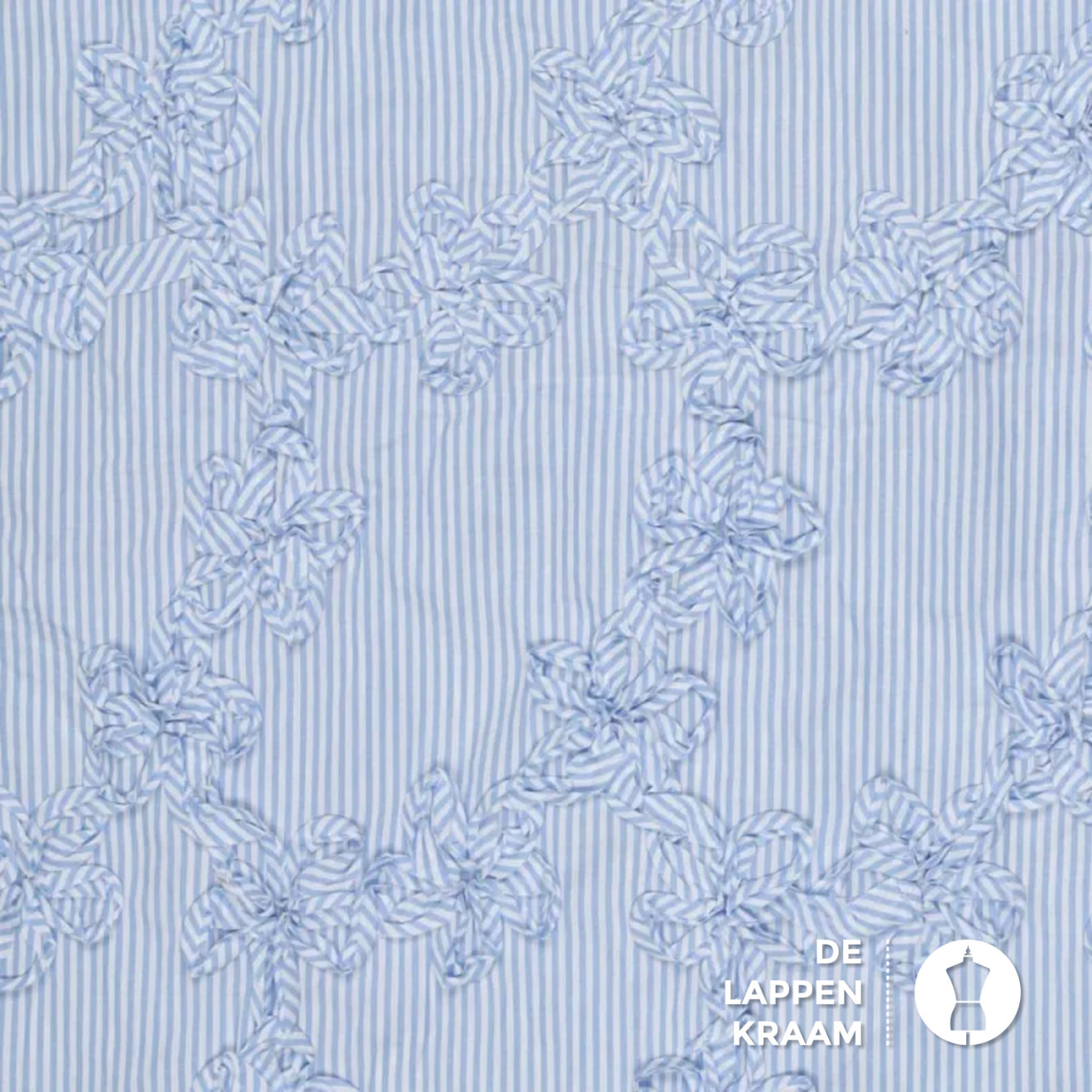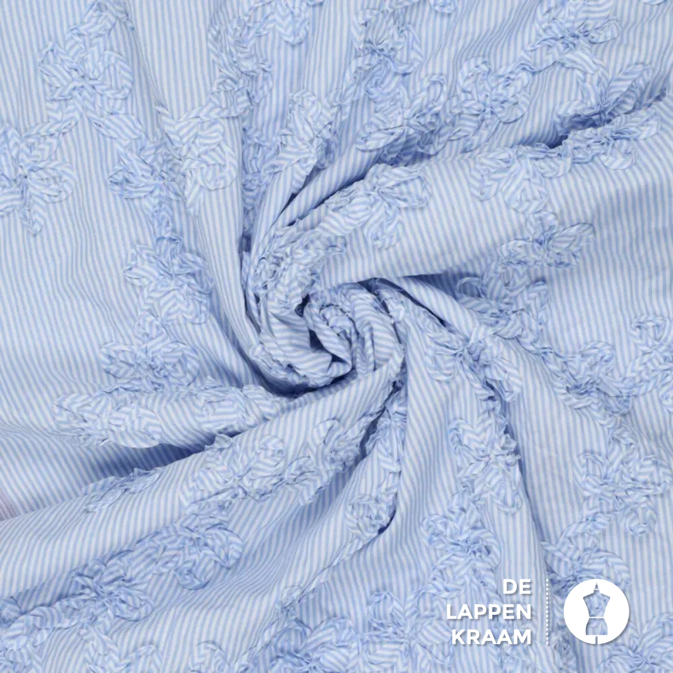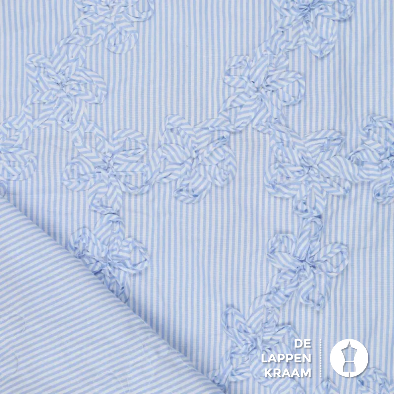 Lichtblauw gestreept katoen stof met opgestikte bloemen
