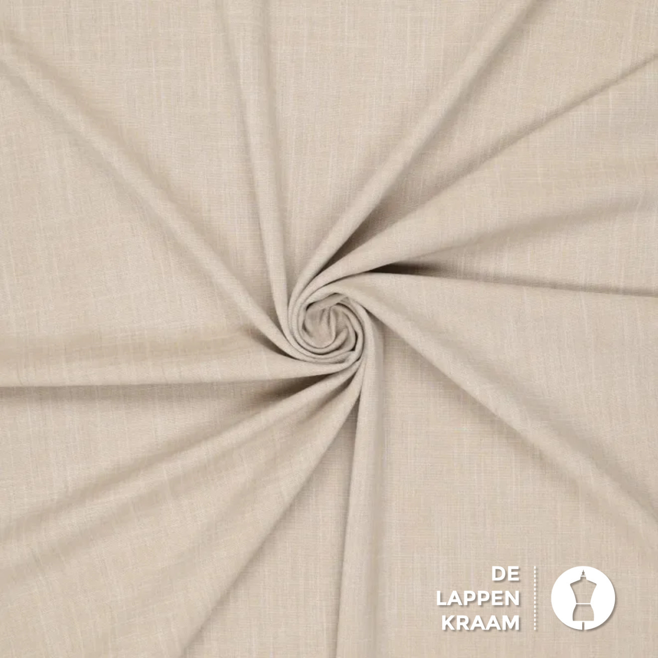 Deze beige stof heeft het uiterlijk van linnen, maar is het niet. Hij heeft een lichte stretch in de breedte en valt heel soepel. Super mooi voor bijvoorbeeld een nette broek met een blazer of een Kiki-pak. Schijnt niet door en kreukt minder dan linnen.... Lees meer