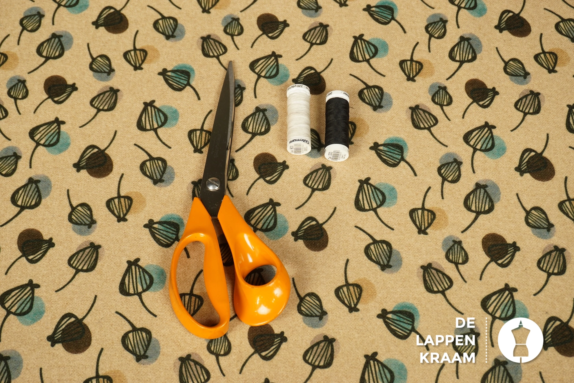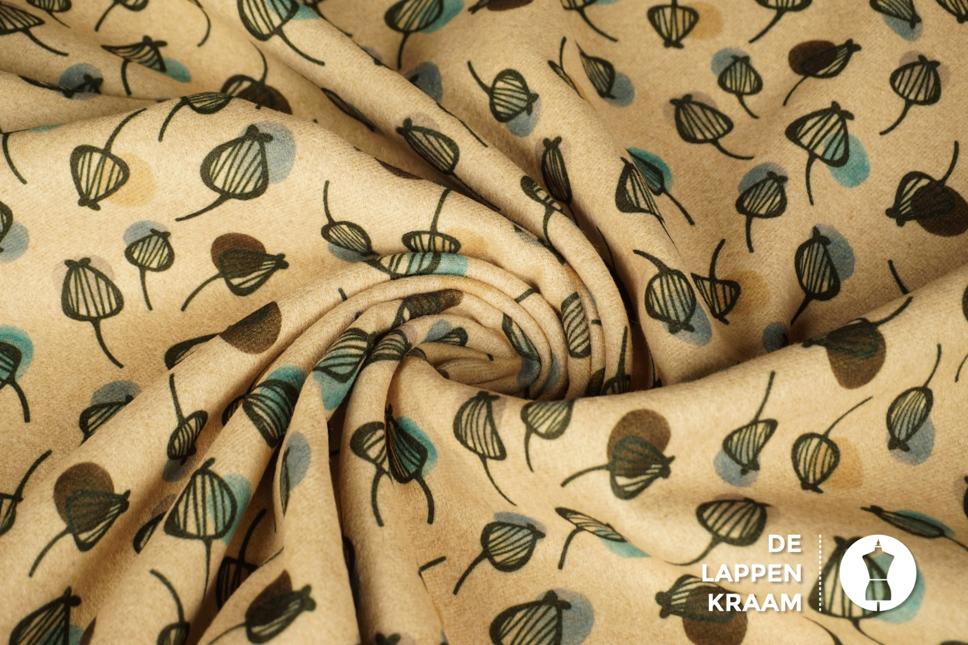 De blaadjes zijn bruin en er zijn verschillende stippen geprint in geel, bruin, blauw en groentinten. De stof voelt aan als wol maar dat is het niet!... Lees meer
